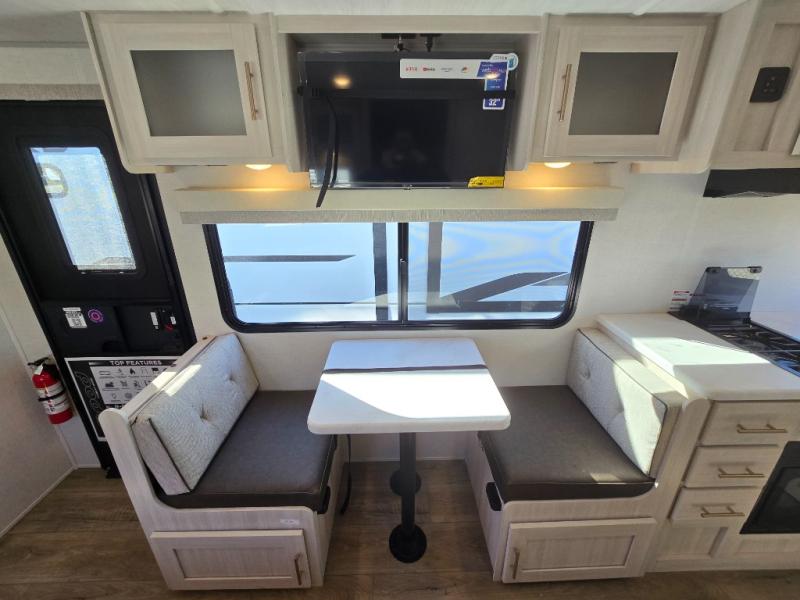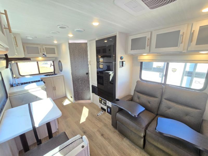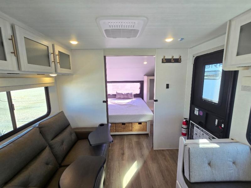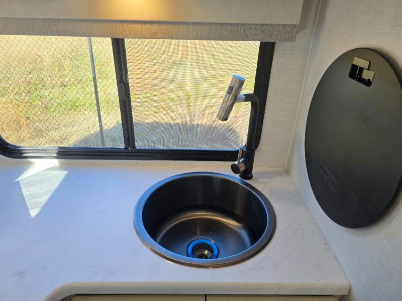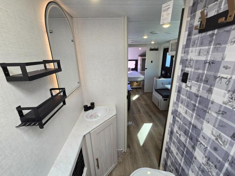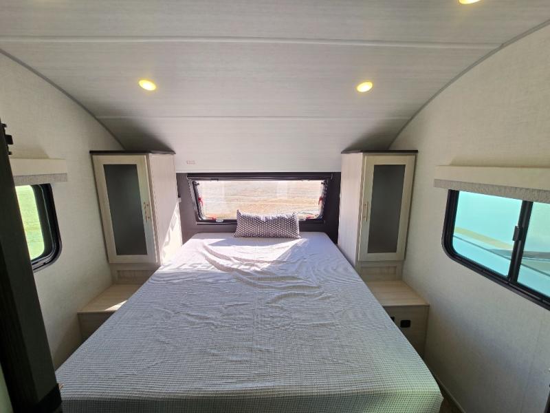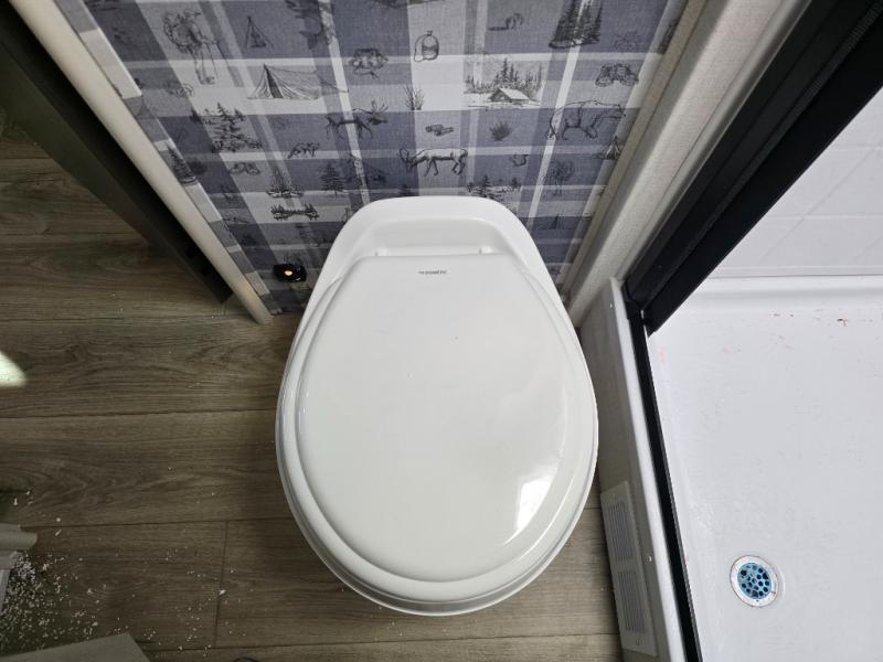 A private bedroom with a walk-around queen bed, a full bath, and sleeping space for guests are a few of the features that you are sure to want in your next RV! You can rest comfortably each night, plus all your clothing can be stored in the dual wardrobes to keep everything tidy. The chef of your group can make meals on the two burner cooktop or in the convection microwave, and there is a 12V black glass refrigerator for perishables. You can relax on the theater seat each evening, and if you're needing additional sleeping space, just choose the optional tri-fold sofa!