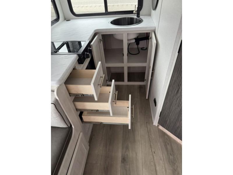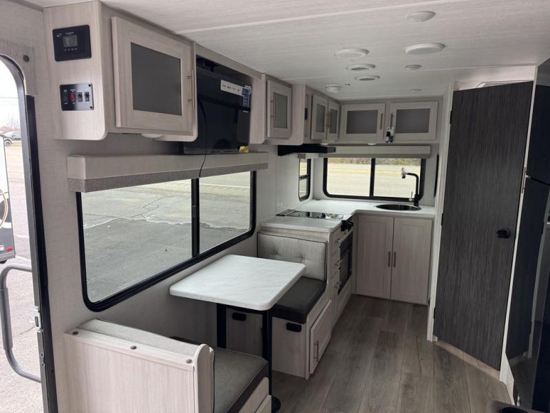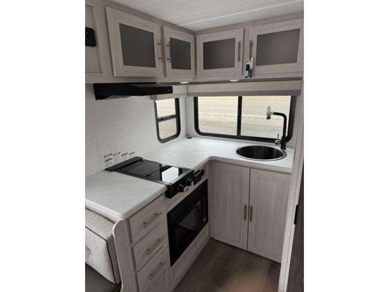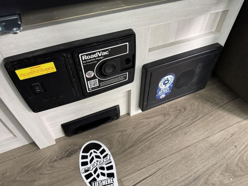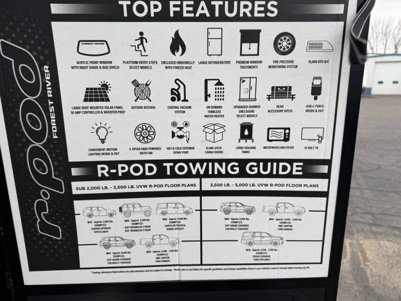 With any R-Pod travel trailer by Forest River, you will enjoy affordable luxury at the lowest tow weight in its class! There is a sealed underbelly with forced heat, a curved dual-pane acrylic front window with a bug screen and night shade, plus a large roof mounted solar panel for off-grid capabilities. The 15K A/C unit will keep you comfortable during the summer camping months, and the tankless water heater will provide endless hot showers after hiking, biking, swimming and more! Each model also includes a black glass friction hinge entrance door, roof ladder prep, exterior motion lighting, plus a hot and cold exterior spray port to wash off sand from the beach. Inside, you'll enjoy seamless Surf-X kitchen countertops, blackout roller shades, and a central vacuum system for hassle-free cleaning!