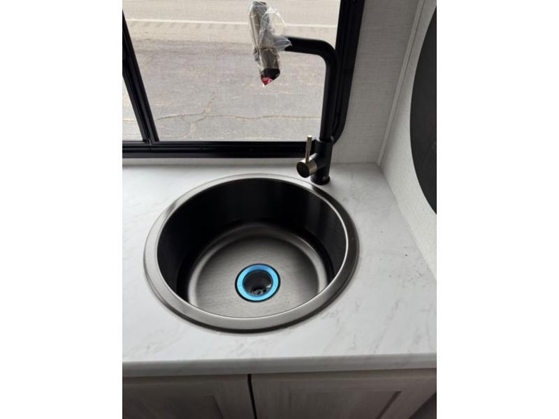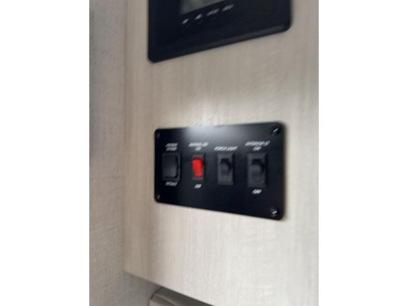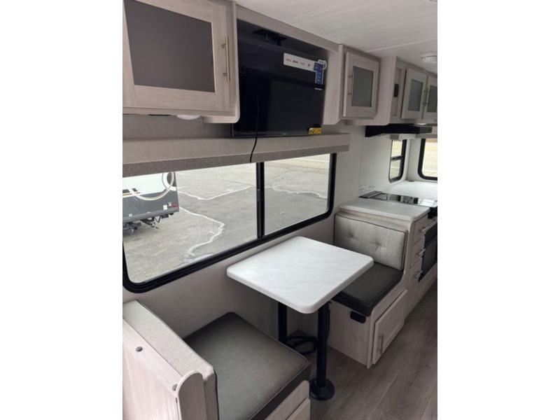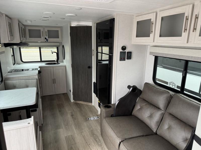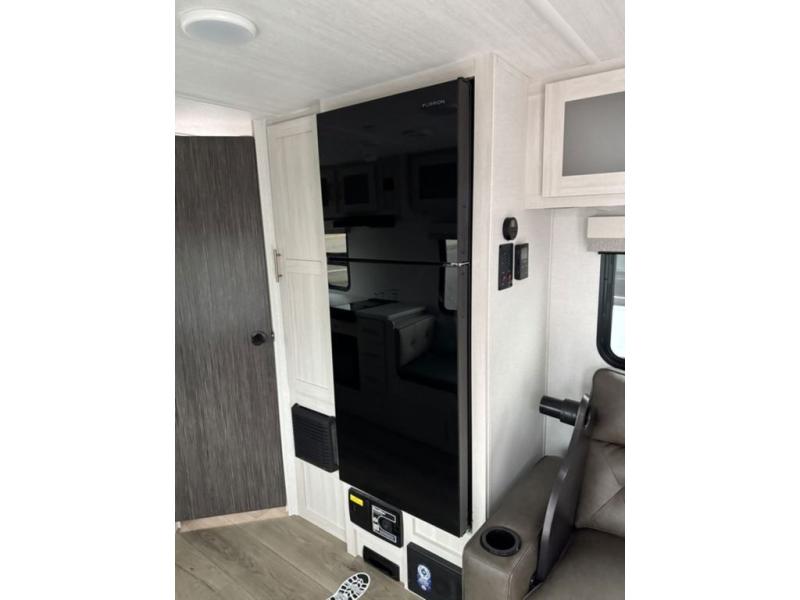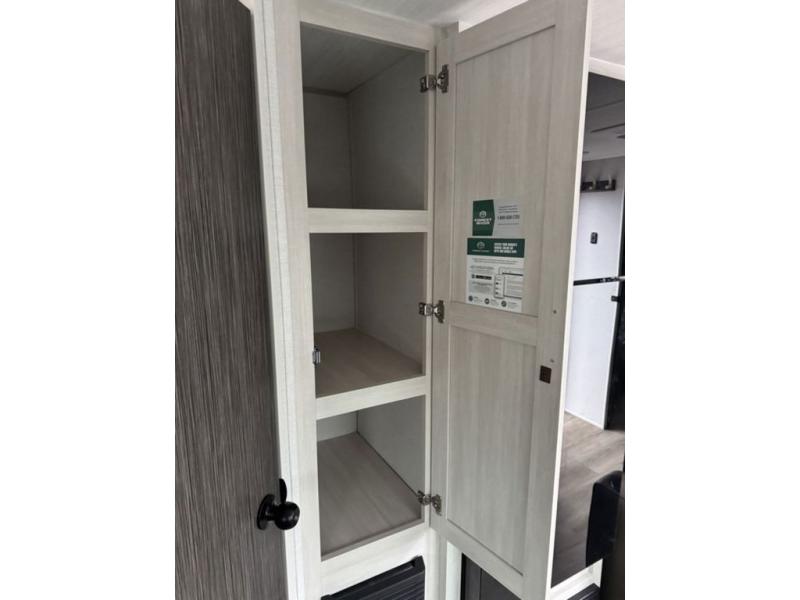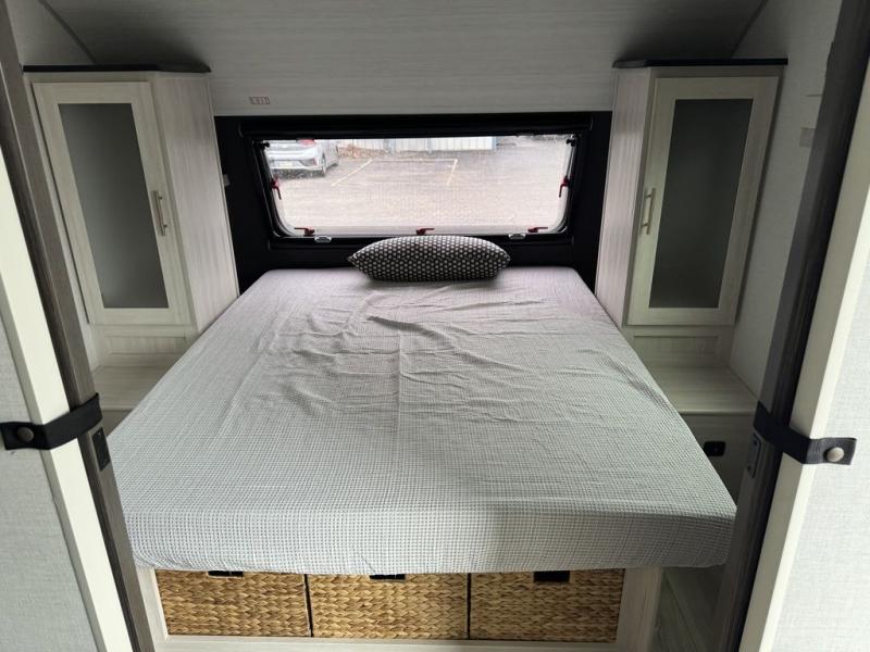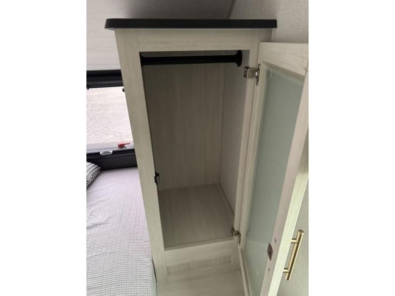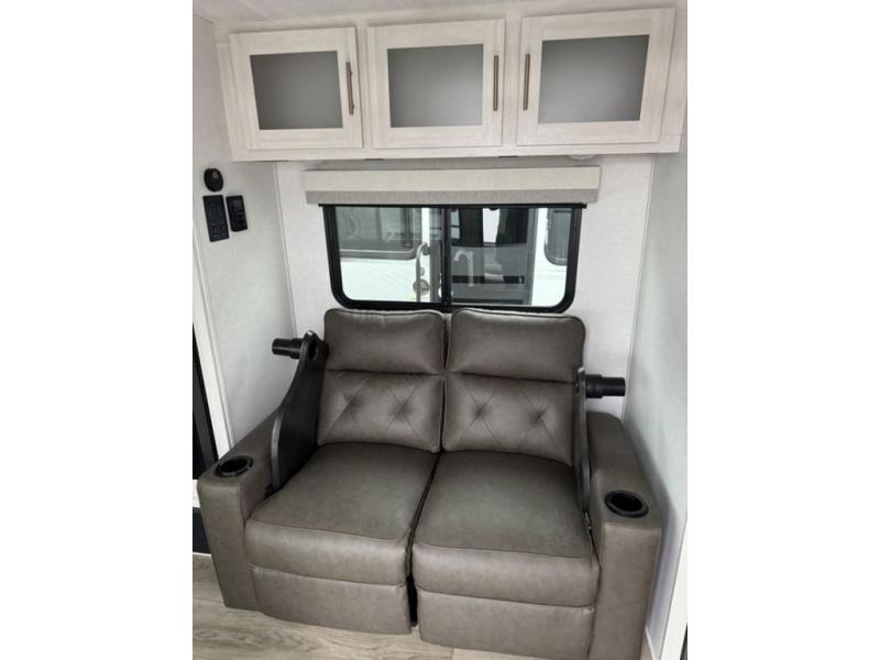 A private bedroom with a walk-around queen bed, a full bath, and sleeping space for guests are a few of the features that you are sure to want in your next RV! You can rest comfortably each night, plus all your clothing can be stored in the dual wardrobes to keep everything tidy. The chef of your group can make meals on the two burner cooktop or in the convection microwave, and there is a 12V black glass refrigerator for perishables. You can relax on the theater seat each evening, and if you're needing additional sleeping space, just choose the optional tri-fold sofa!