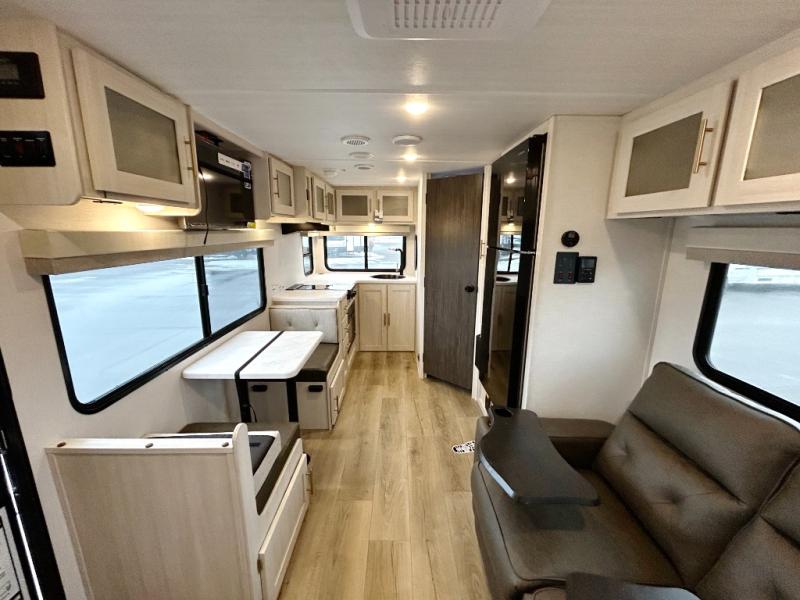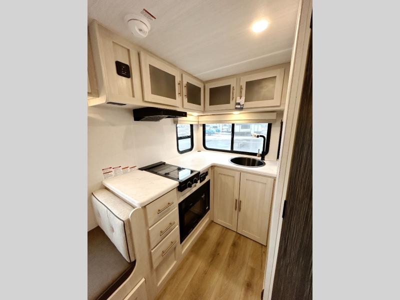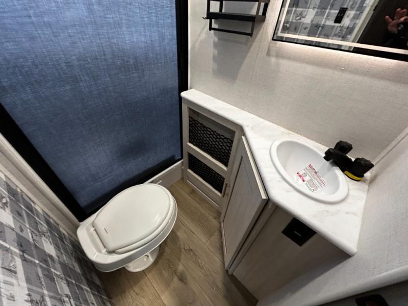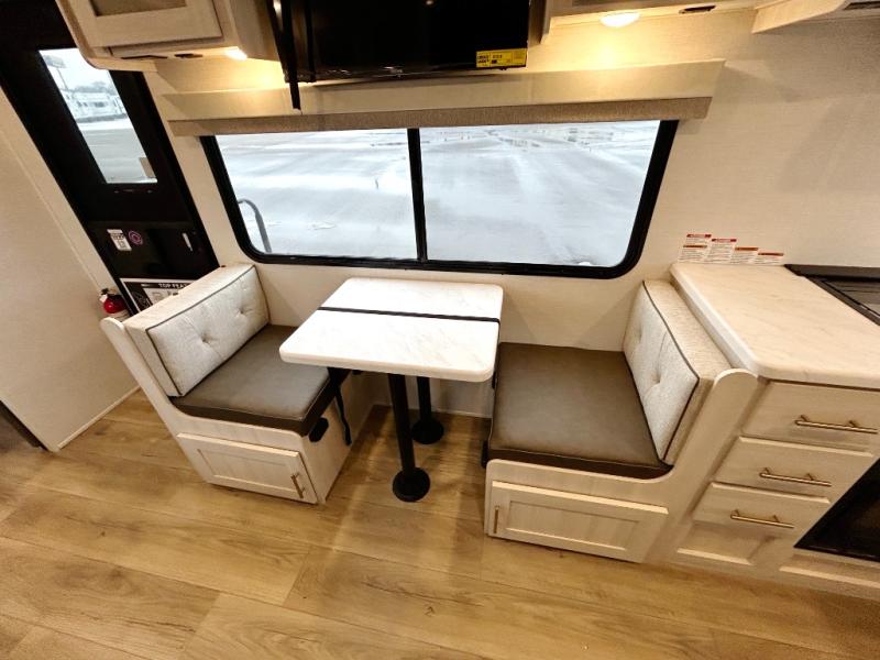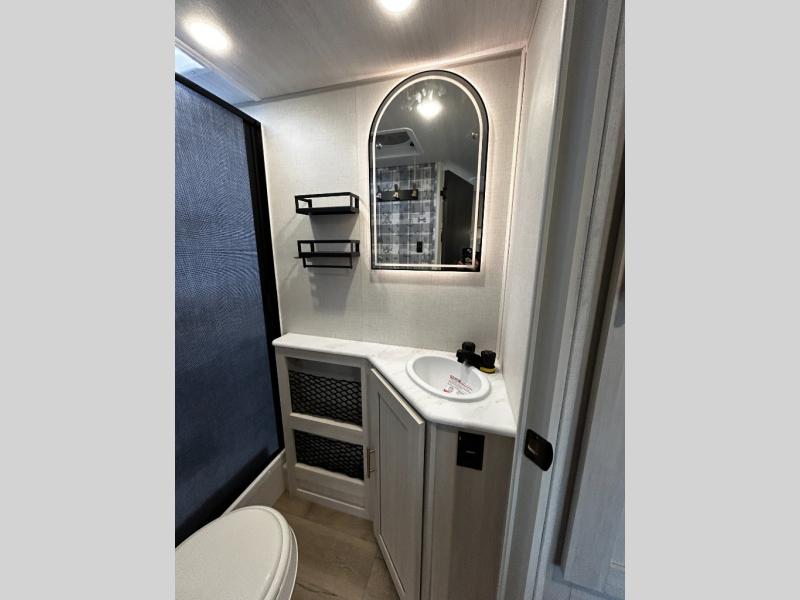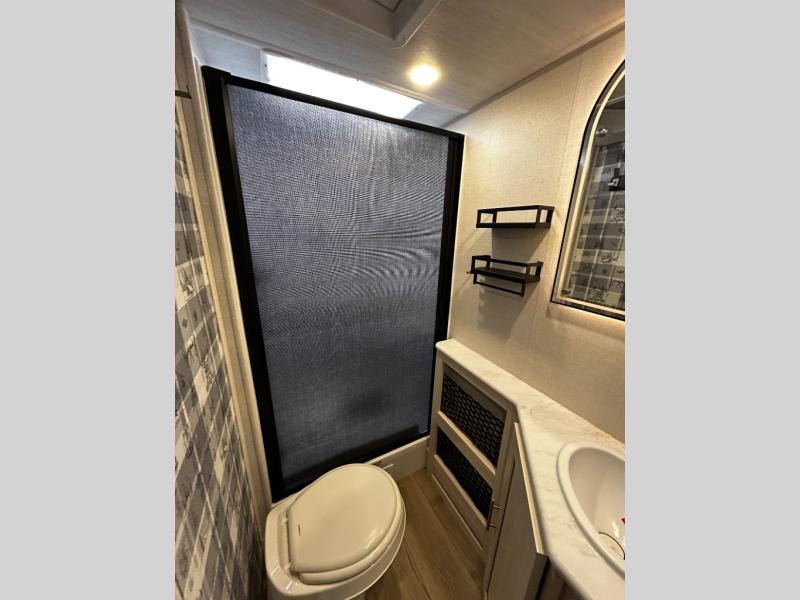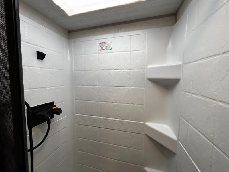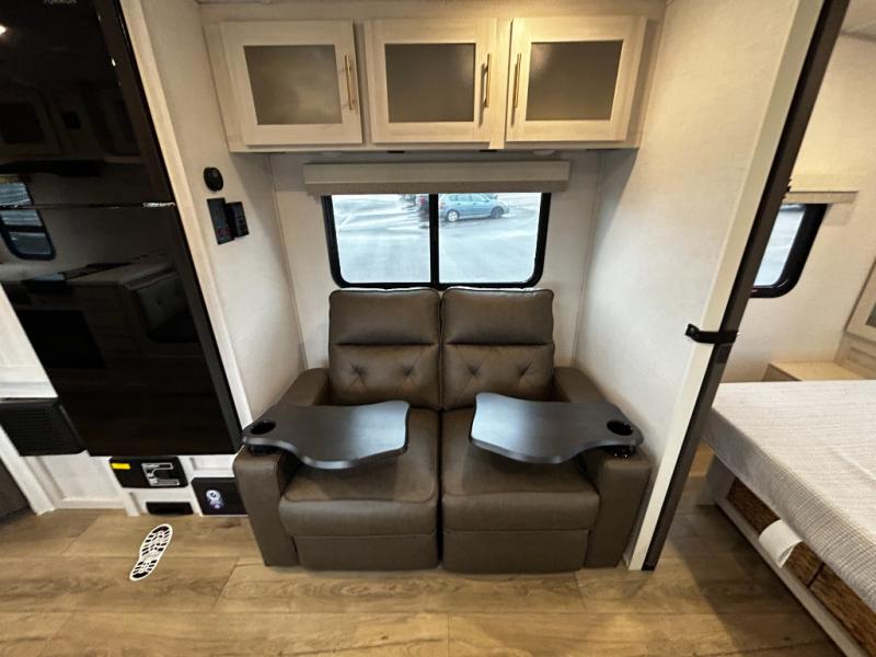 A private bedroom with a walk-around queen bed, a full bath, and sleeping space for guests are a few of the features that you are sure to want in your next RV! You can rest comfortably each night, plus all your clothing can be stored in the dual wardrobes to keep everything tidy. The chef of your group can make meals on the two burner cooktop or in the convection microwave, and there is a 12V black glass refrigerator for perishables. You can relax on the theater seat each evening, and if you're needing additional sleeping space, just choose the optional tri-fold sofa!
