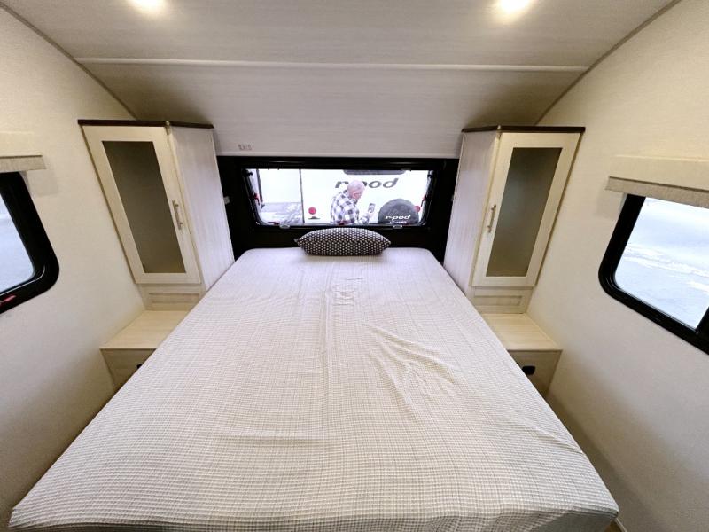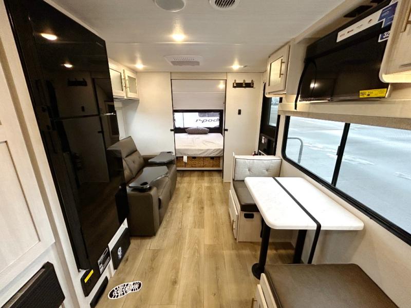 With any R-Pod travel trailer by Forest River, you will enjoy affordable luxury at the lowest tow weight in its class! There is a sealed underbelly with forced heat, a curved dual-pane acrylic front window with a bug screen and night shade, plus a large roof mounted solar panel for off-grid capabilities. The 15K A/C unit will keep you comfortable during the summer camping months, and the tankless water heater will provide endless hot showers after hiking, biking, swimming and more! Each model also includes a black glass friction hinge entrance door, roof ladder prep, exterior motion lighting, plus a hot and cold exterior spray port to wash off sand from the beach. Inside, you'll enjoy seamless Surf-X kitchen countertops, blackout roller shades, and a central vacuum system for hassle-free cleaning!