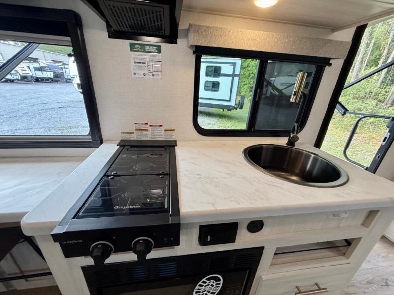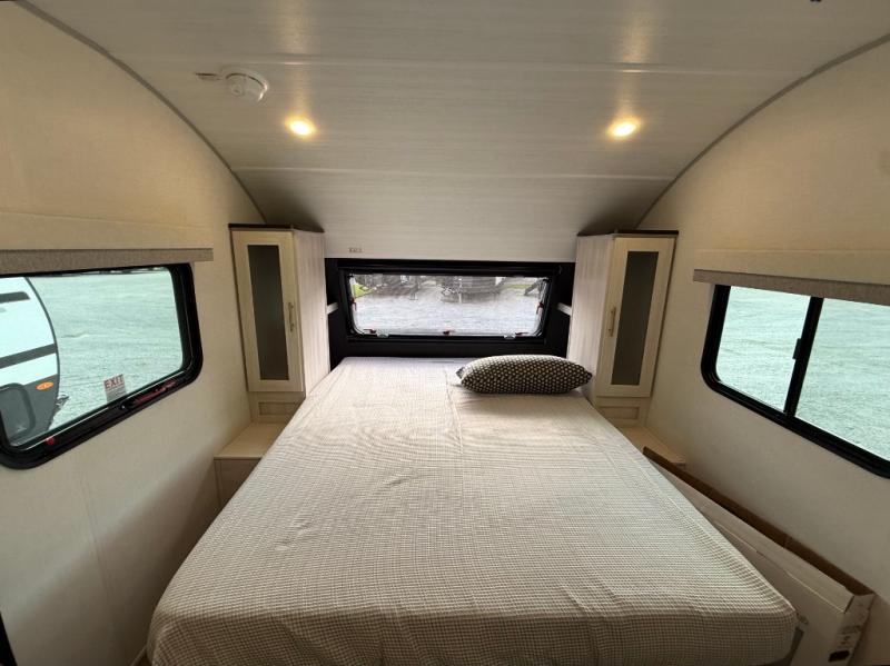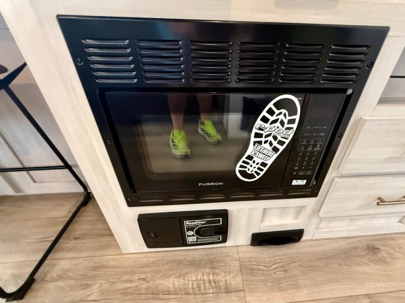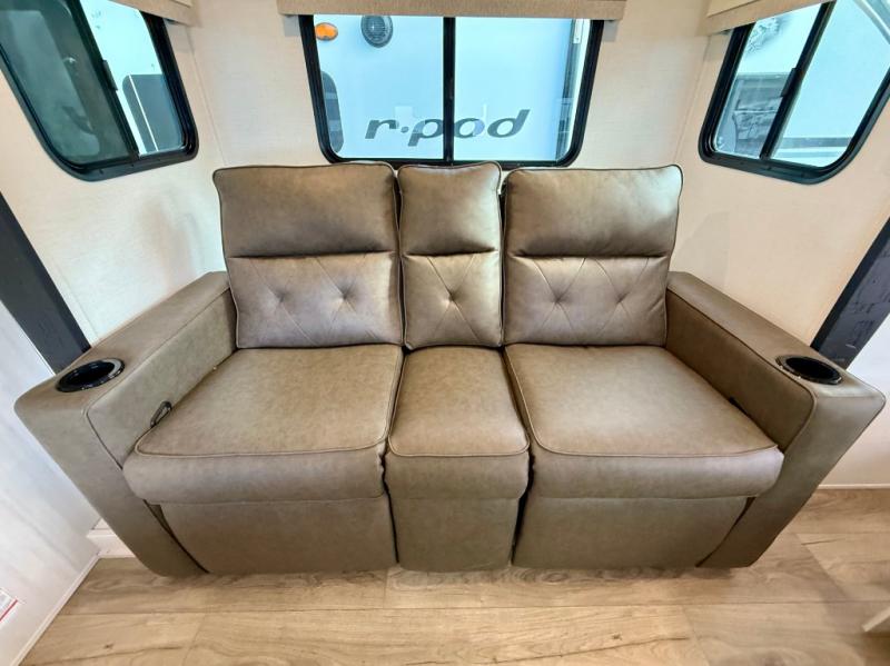 With any R-Pod travel trailer by Forest River, you will enjoy affordable luxury at the lowest tow weight in its class! There is a sealed underbelly with forced heat, a curved dual-pane acrylic front window with a bug screen and night shade, plus a large roof mounted solar panel for off-grid capabilities. The 15K A/C unit will keep you comfortable during the summer camping months, and the tankless water heater will provide endless hot showers after hiking, biking, swimming and more! Each model also includes a black glass friction hinge entrance door, roof ladder prep, exterior motion lighting, plus a hot and cold exterior spray port to wash off sand from the beach. Inside, you'll enjoy seamless Surf-X kitchen countertops, blackout roller shades, and a central vacuum system for hassle-free cleaning!