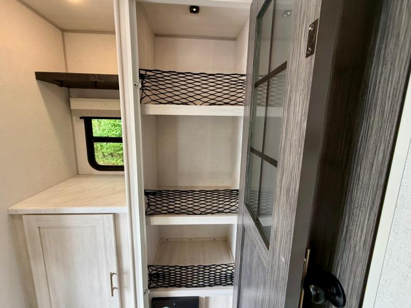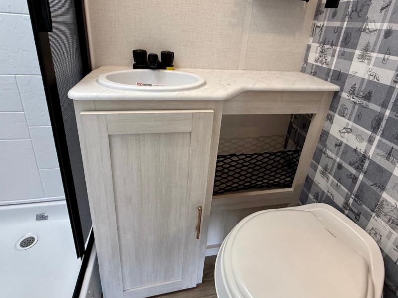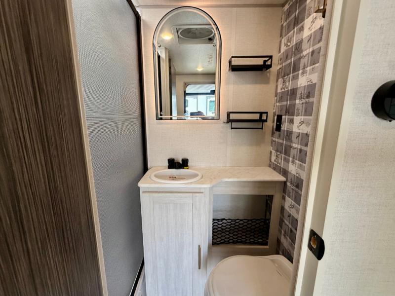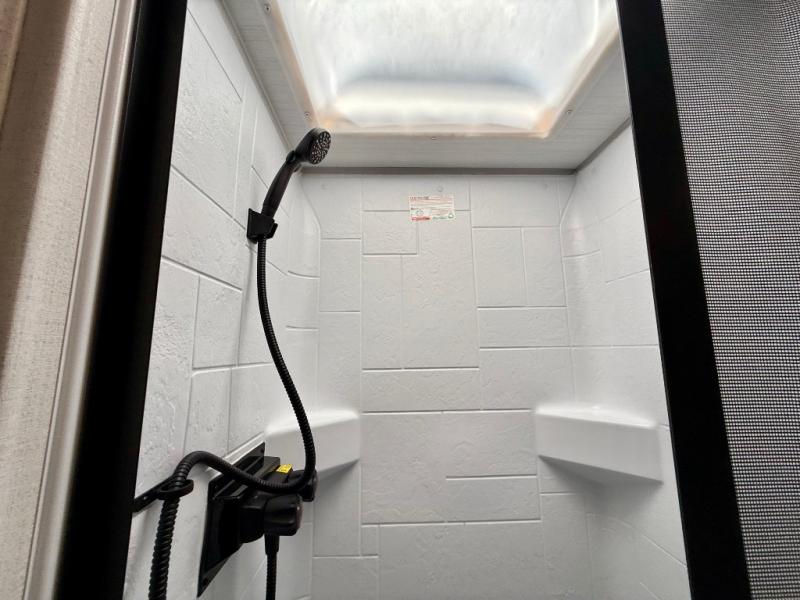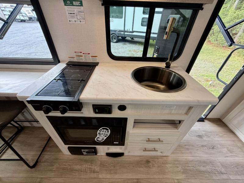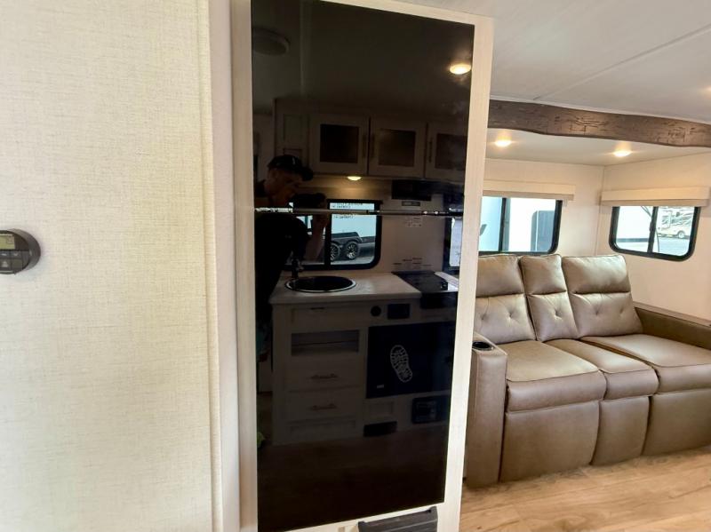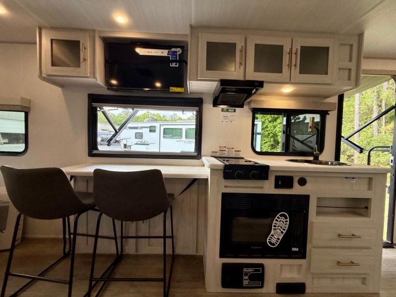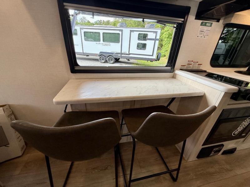 A front bedroom with a walk-around queen bed, a full bath, and a theater seat slide out are a few of the features that you are sure to want in your next RV! You can rest comfortably each night, plus all your clothing can be stored in the dual wardrobes to keep everything tidy. If you're needing more sleeping space, just choose the optional tri-fold sofa or optional booth dinette in place of the theater seat! The chef of your group can make meals on the two burner cooktop or in the convection microwave, and there is a 12V black glass refrigerator for perishables. And the bar top with two seats and the flip-up window provide a great view outdoors as you dine together.