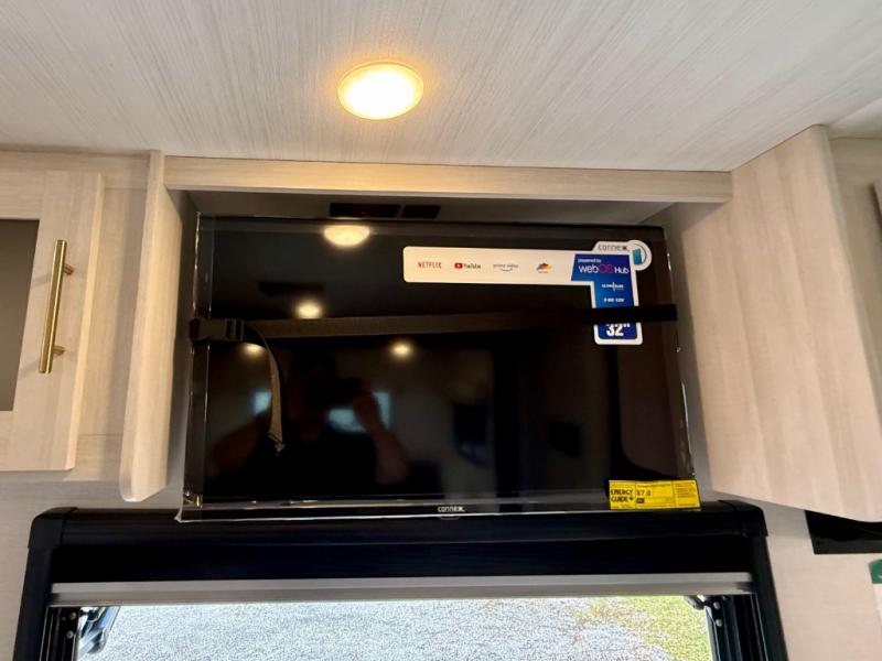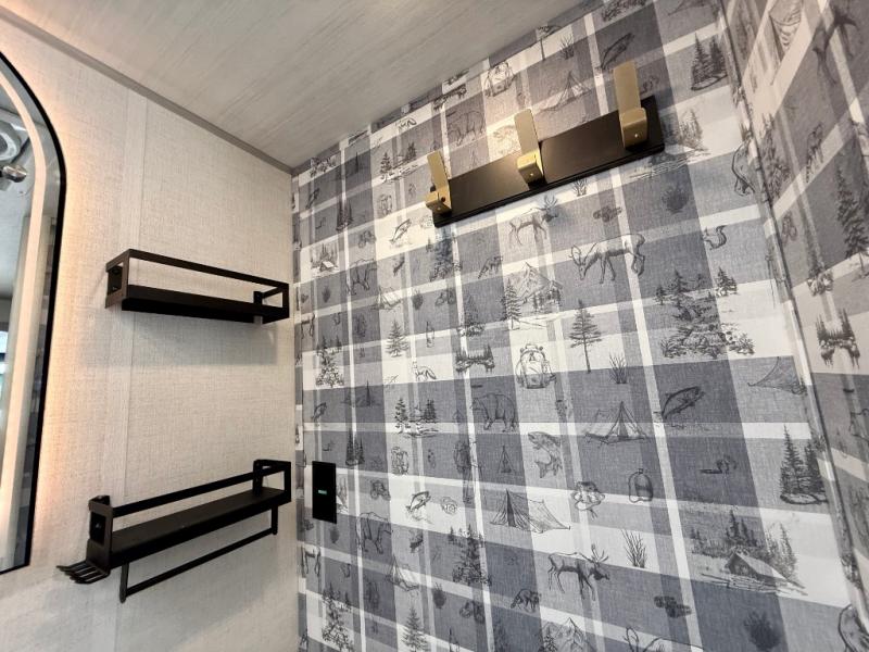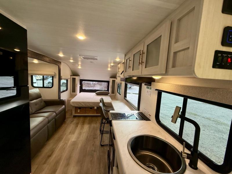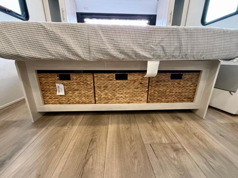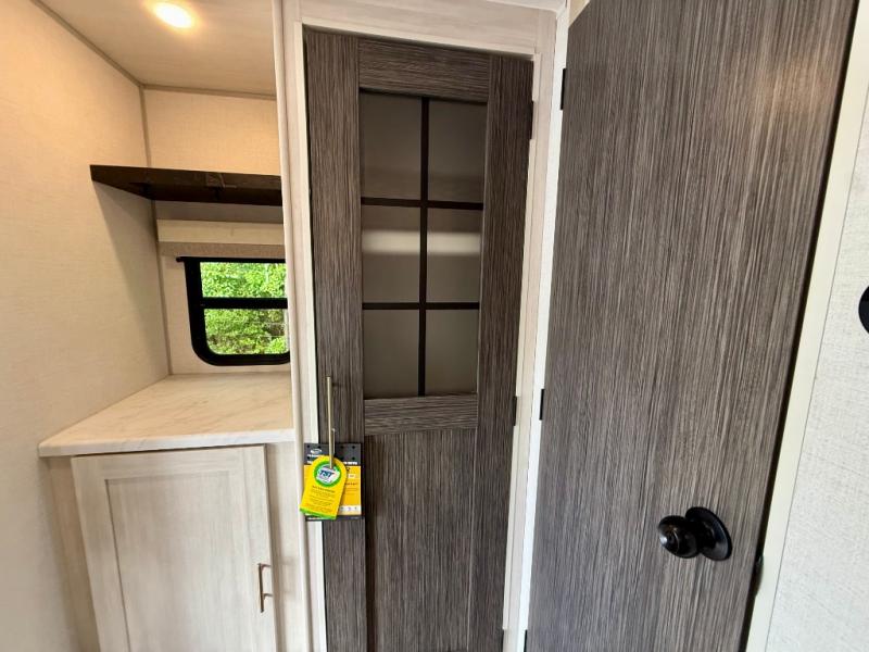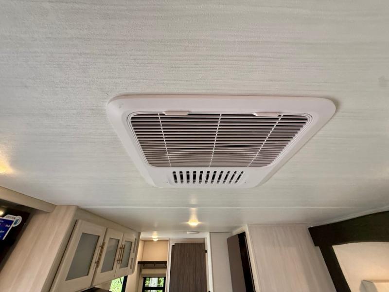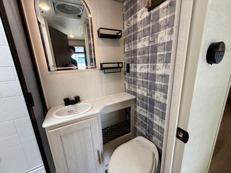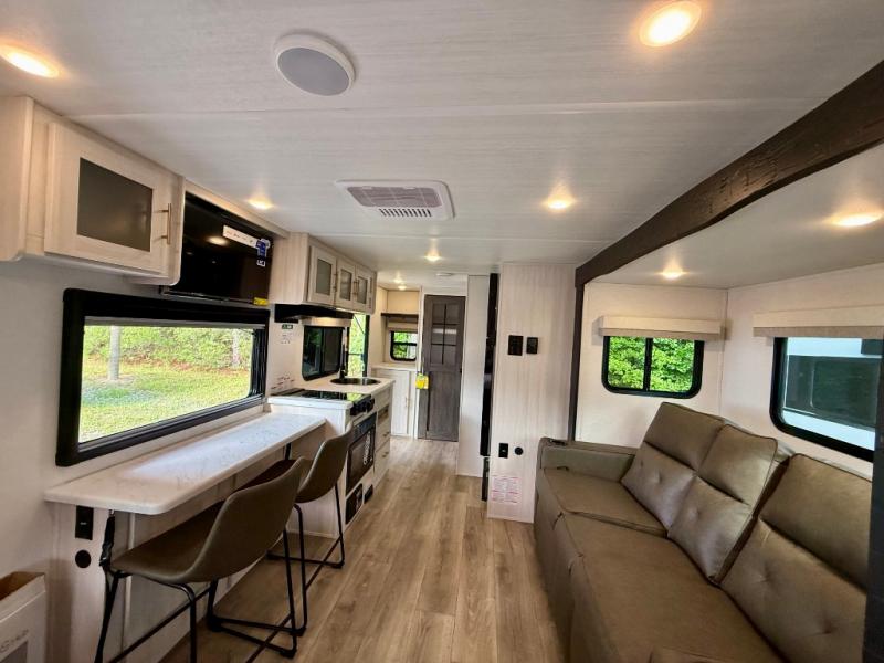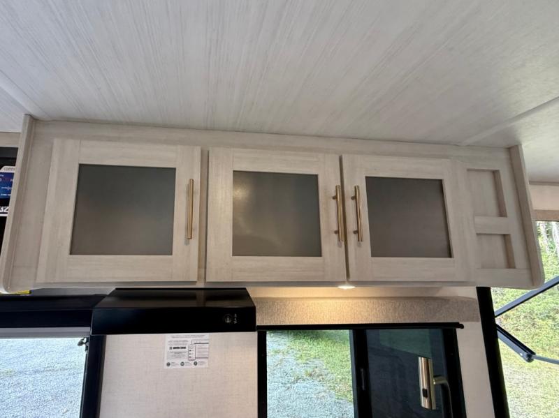 A front bedroom with a walk-around queen bed, a full bath, and a theater seat slide out are a few of the features that you are sure to want in your next RV! You can rest comfortably each night, plus all your clothing can be stored in the dual wardrobes to keep everything tidy. If you're needing more sleeping space, just choose the optional tri-fold sofa or optional booth dinette in place of the theater seat! The chef of your group can make meals on the two burner cooktop or in the convection microwave, and there is a 12V black glass refrigerator for perishables. And the bar top with two seats and the flip-up window provide a great view outdoors as you dine together.