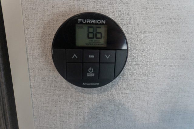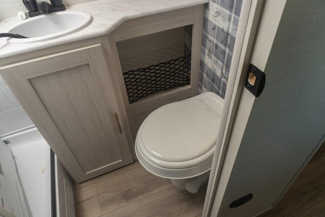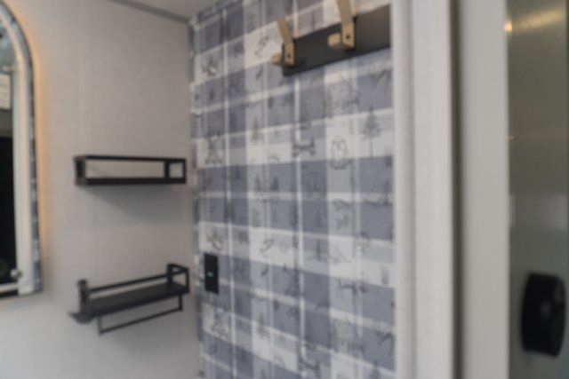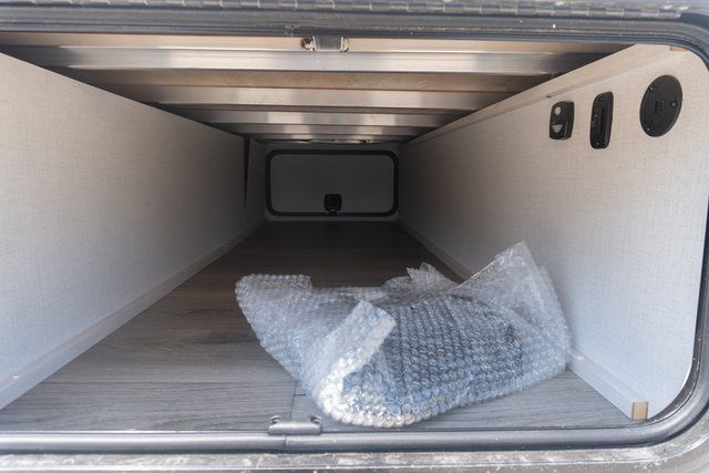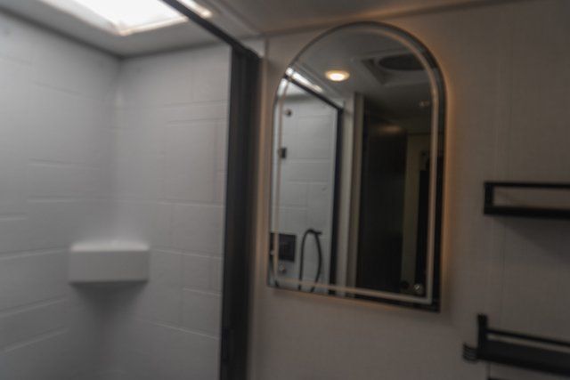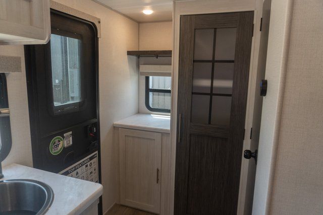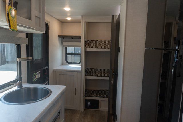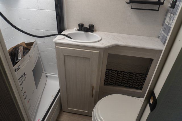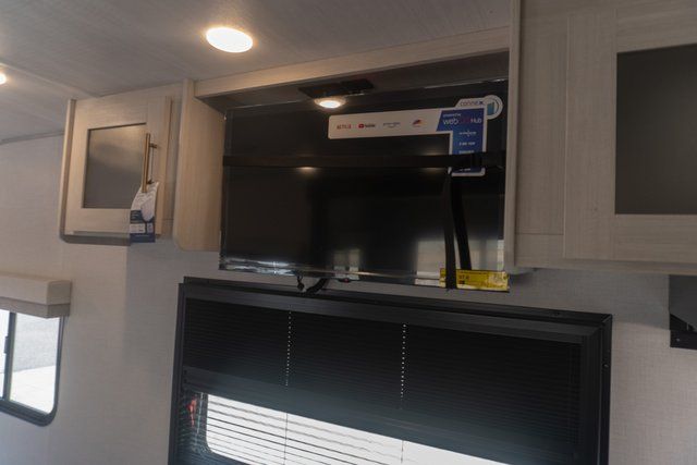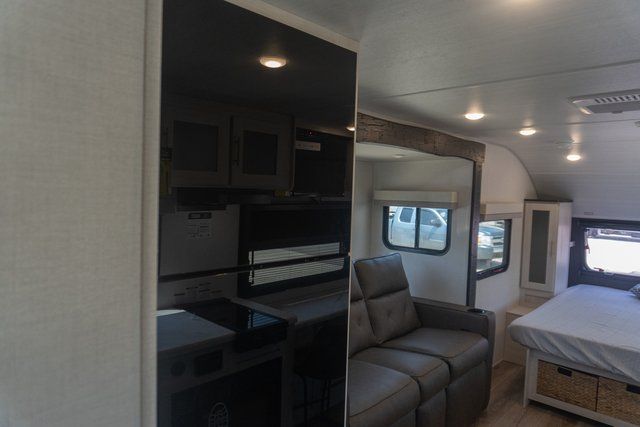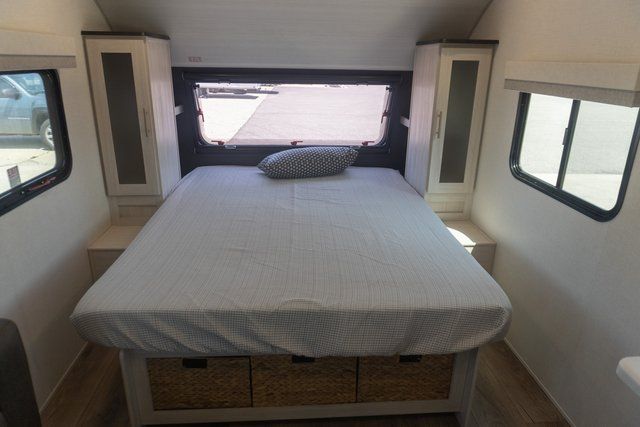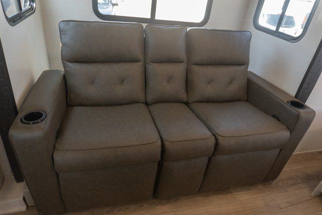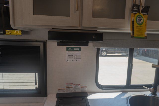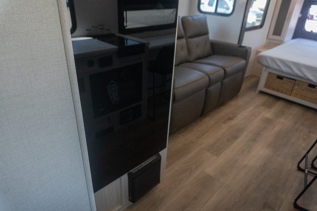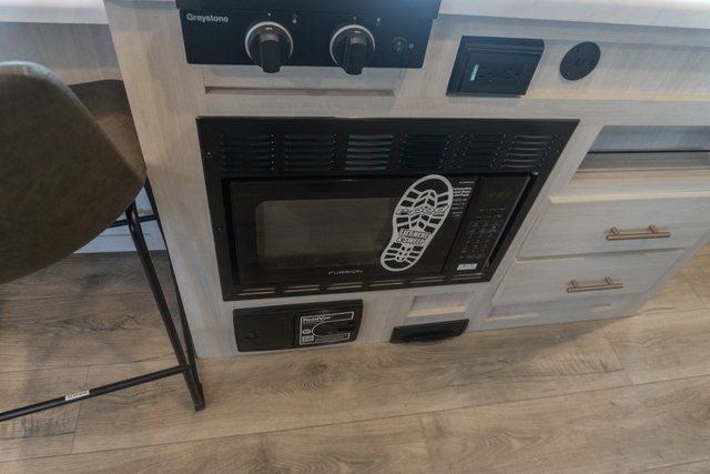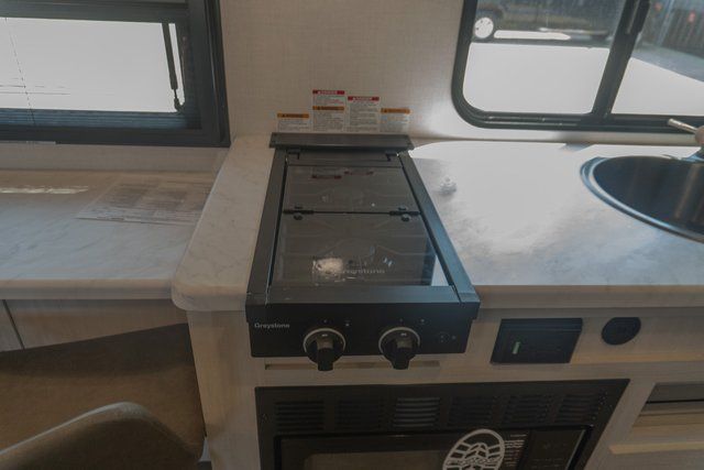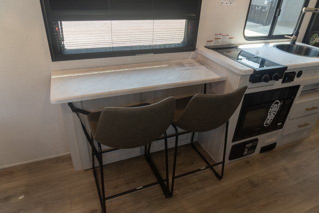 A front bedroom with a walk-around queen bed, a full bath, and a theater seat slide out are a few of the features that you are sure to want in your next RV! You can rest comfortably each night, plus all your clothing can be stored in the dual wardrobes to keep everything tidy. If you're needing more sleeping space, just choose the optional tri-fold sofa or optional booth dinette in place of the theater seat! The chef of your group can make meals on the two burner cooktop or in the convection microwave, and there is a 12V black glass refrigerator for perishables. And the bar top with two seats and the flip-up window provide a great view outdoors as you dine together.