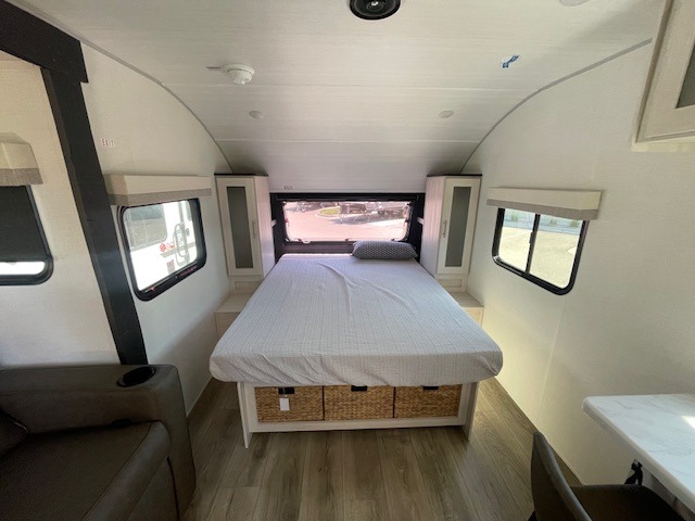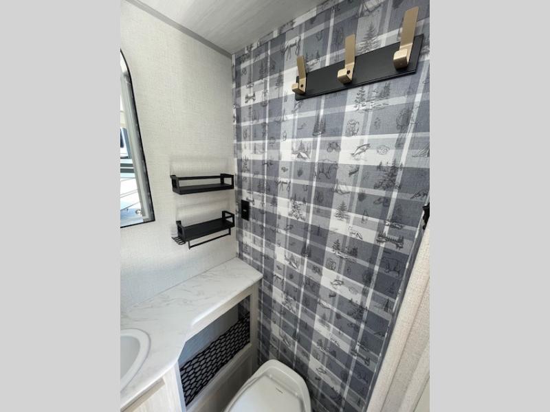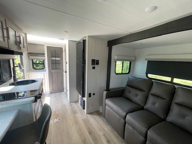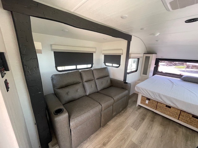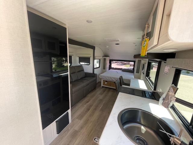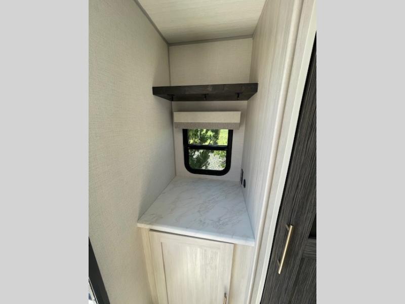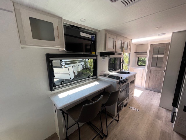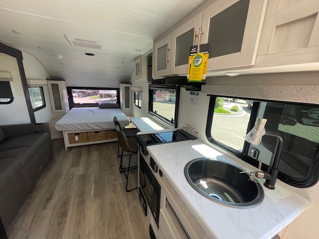 A front bedroom with a walk-around queen bed, a full bath, and a theater seat slide out are a few of the features that you are sure to want in your next RV! You can rest comfortably each night, plus all your clothing can be stored in the dual wardrobes to keep everything tidy. If you're needing more sleeping space, just choose the optional tri-fold sofa or optional booth dinette in place of the theater seat! The chef of your group can make meals on the two burner cooktop or in the convection microwave, and there is a 12V black glass refrigerator for perishables. And the bar top with two seats and the flip-up window provide a great view outdoors as you dine together.