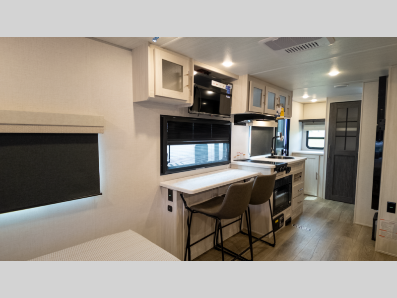 - Full kitchen & bath: Indoor cooktop, fridge, microwave, and wet bath layout