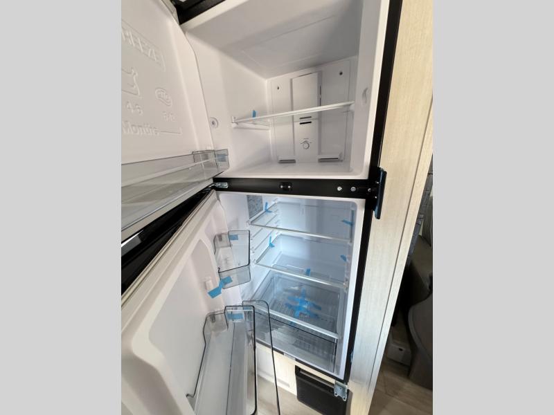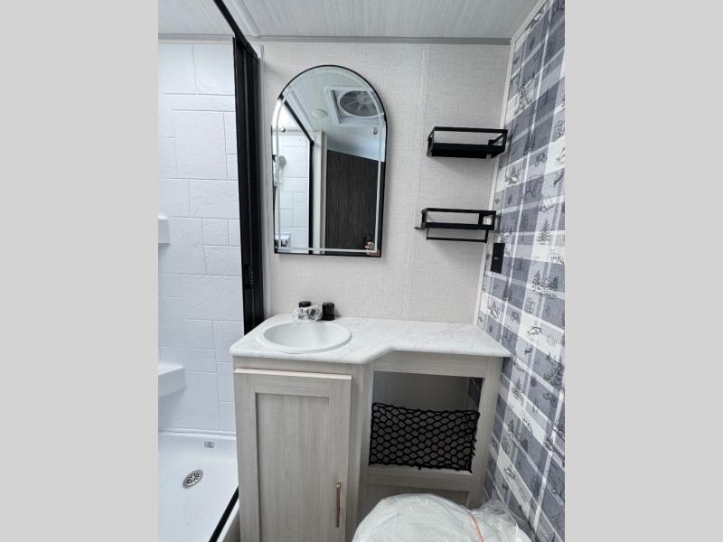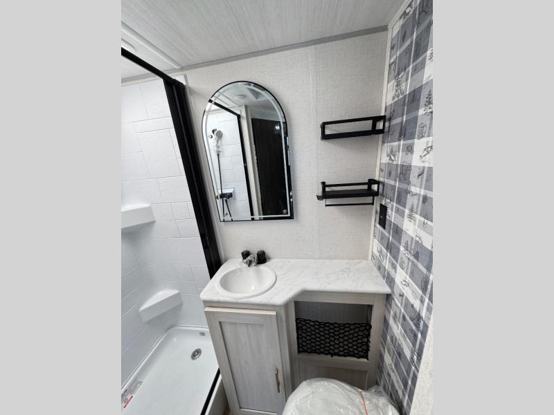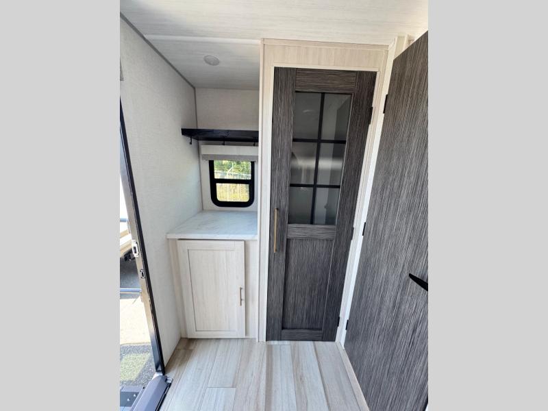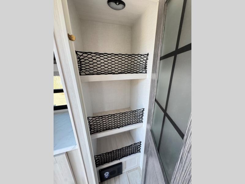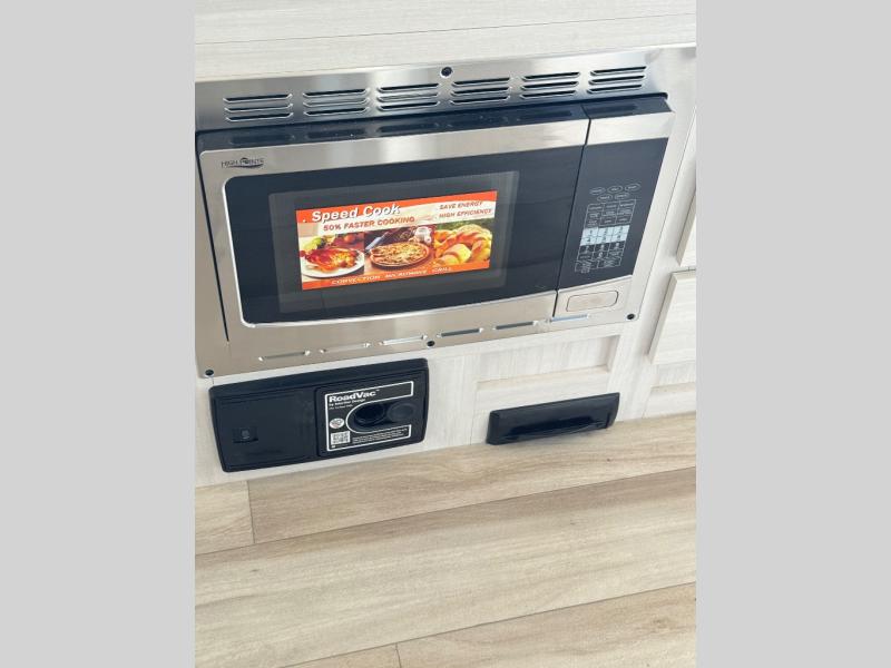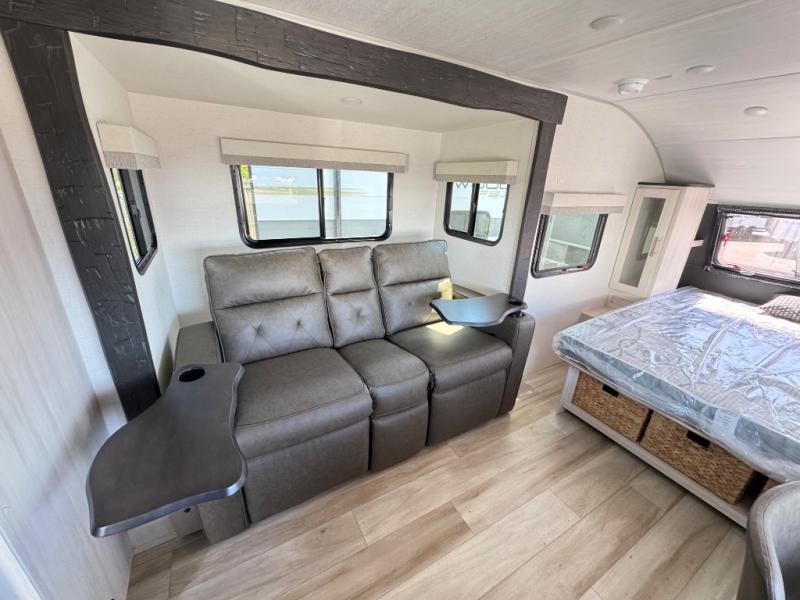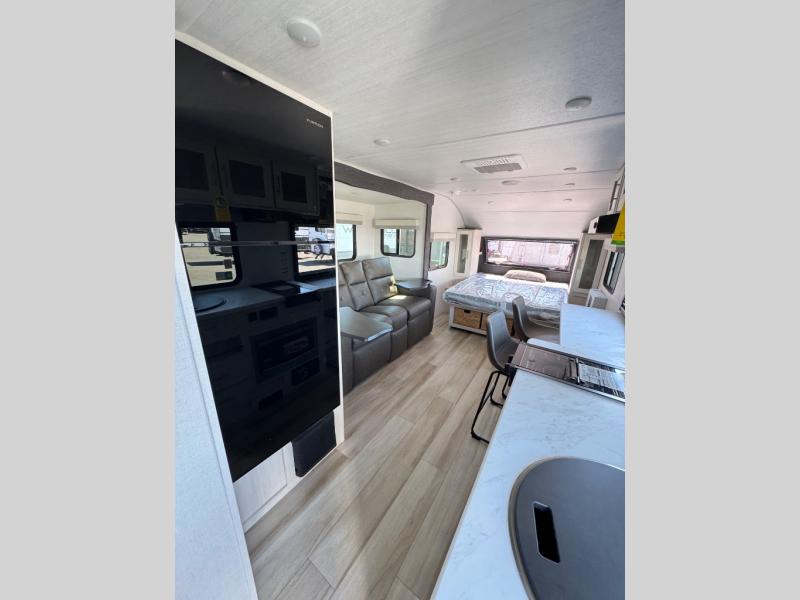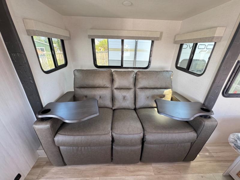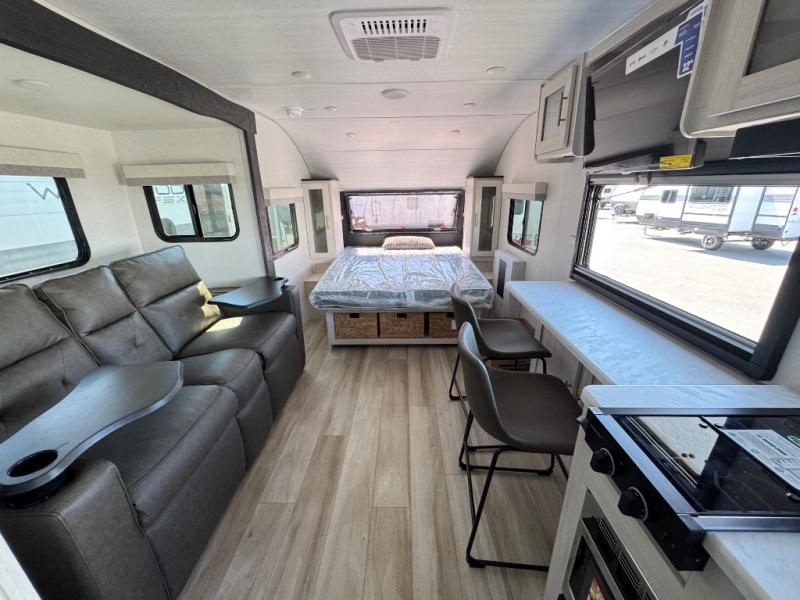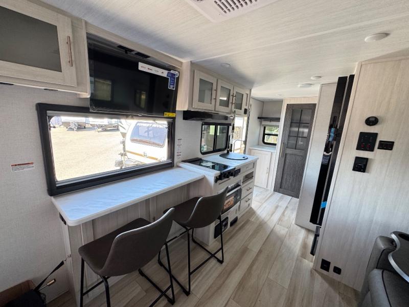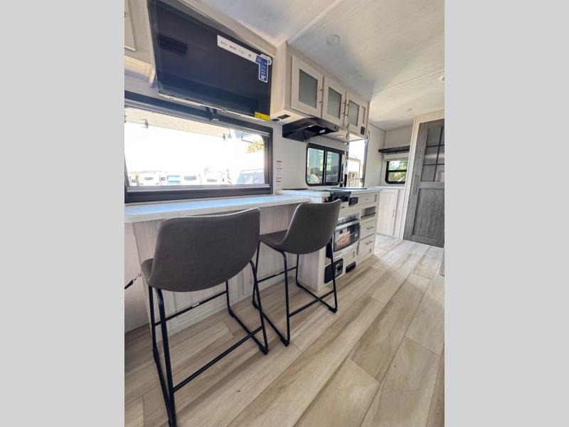 A front bedroom with a walk-around queen bed, a full bath, and a theater seat slide out are a few of the features that you are sure to want in your next RV! You can rest comfortably each night, plus all your clothing can be stored in the dual wardrobes to keep everything tidy. If you're needing more sleeping space, just choose the optional tri-fold sofa or optional booth dinette in place of the theater seat! The chef of your group can make meals on the two burner cooktop or in the convection microwave, and there is a 12V black glass refrigerator for perishables. And the bar top with two seats and the flip-up window provide a great view outdoors as you dine together.