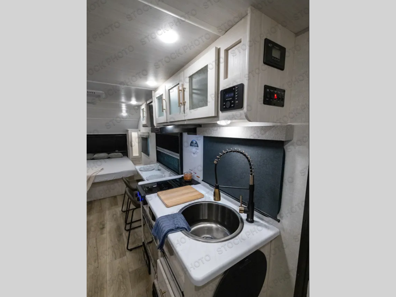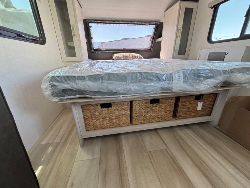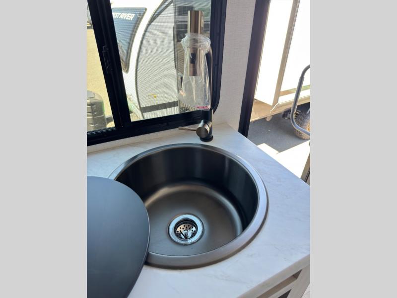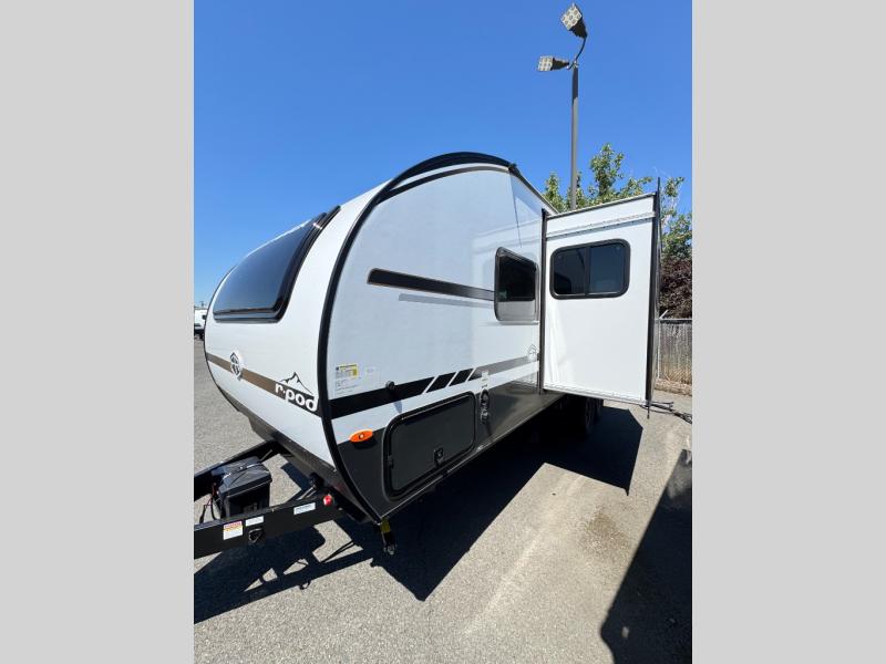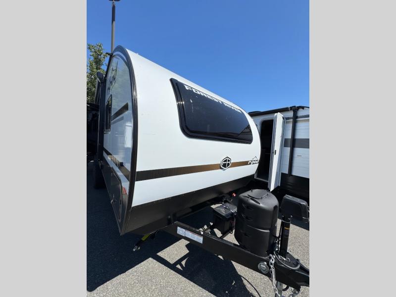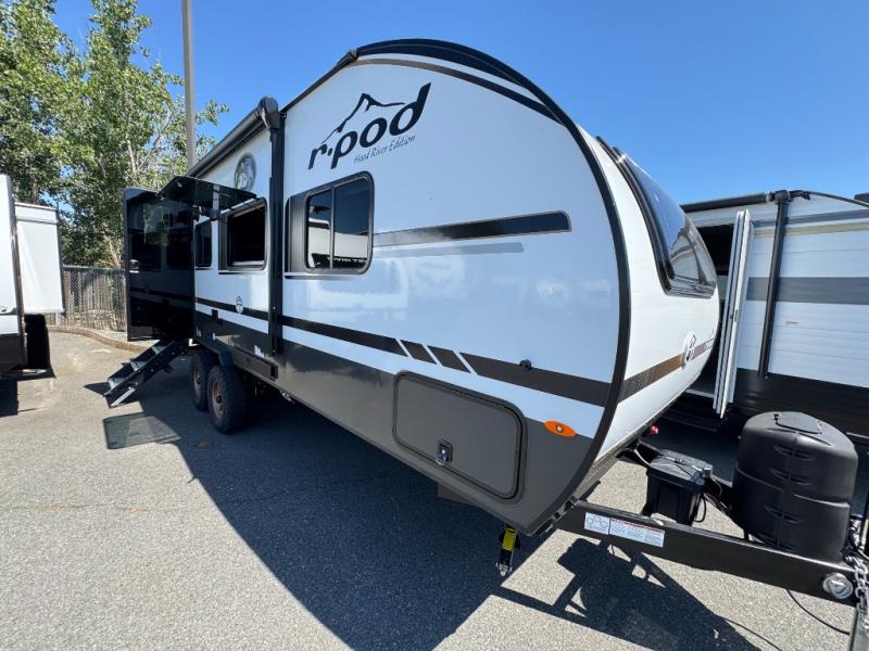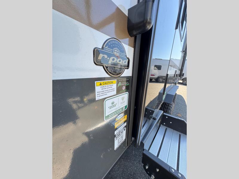 With any R-Pod travel trailer by Forest River, you will enjoy affordable luxury at the lowest tow weight in its class! There is a sealed underbelly with forced heat, a curved dual-pane acrylic front window with a bug screen and night shade, plus a large roof mounted solar panel for off-grid capabilities. The 15K A/C unit will keep you comfortable during the summer camping months, and the tankless water heater will provide endless hot showers after hiking, biking, swimming and more! Each model also includes a black glass friction hinge entrance door, roof ladder prep, exterior motion lighting, plus a hot and cold exterior spray port to wash off sand from the beach. Inside, you'll enjoy seamless Surf-X kitchen countertops, blackout roller shades, and a central vacuum system for hassle-free cleaning!