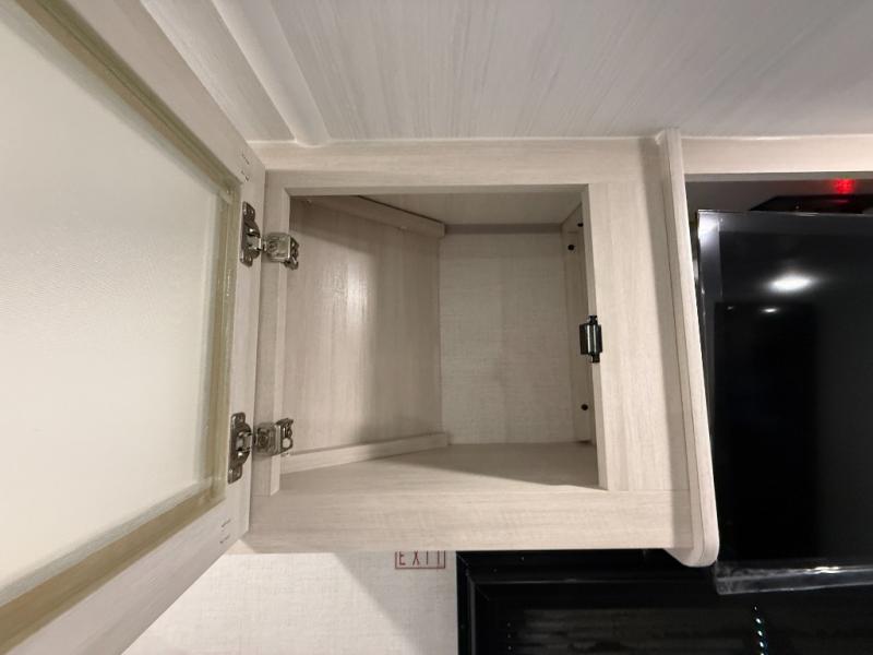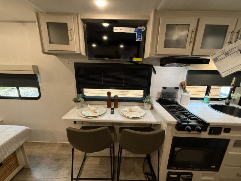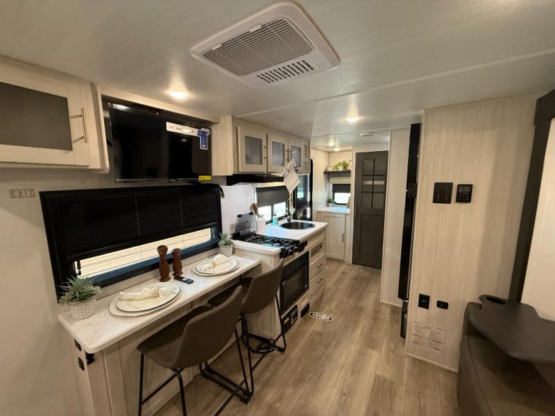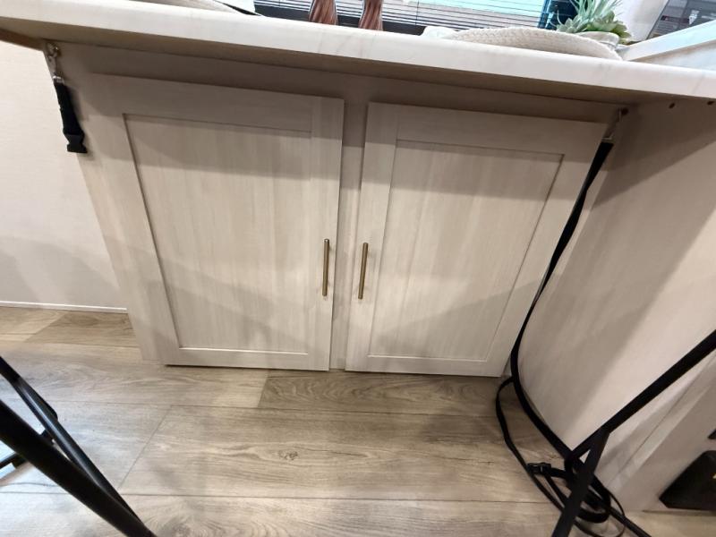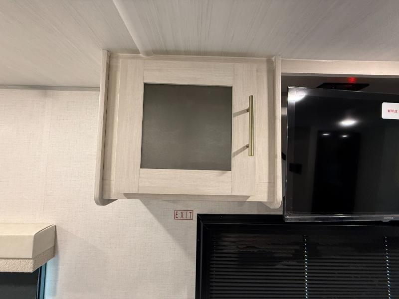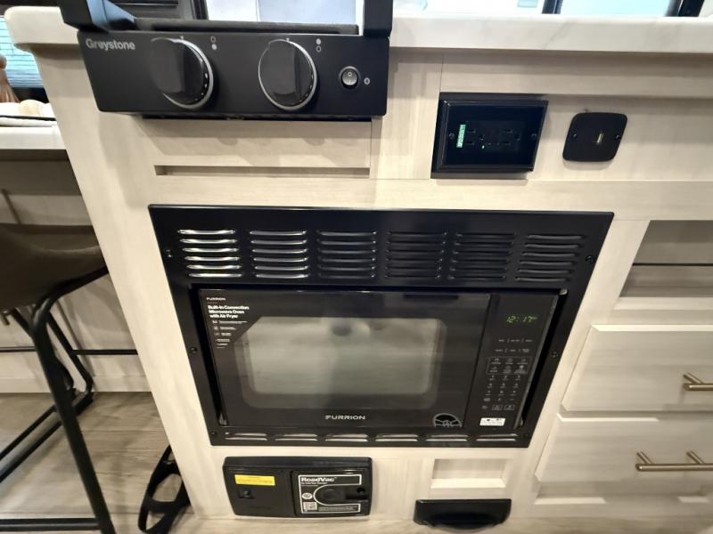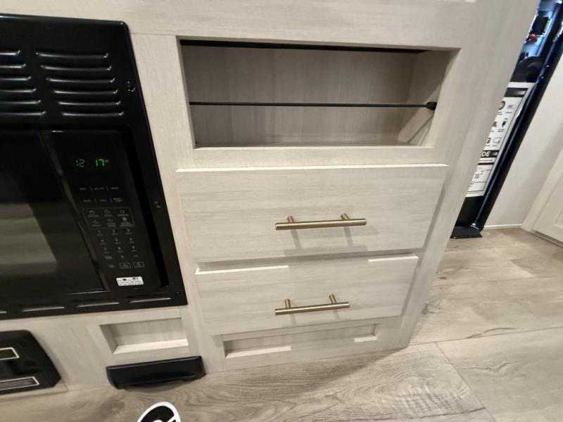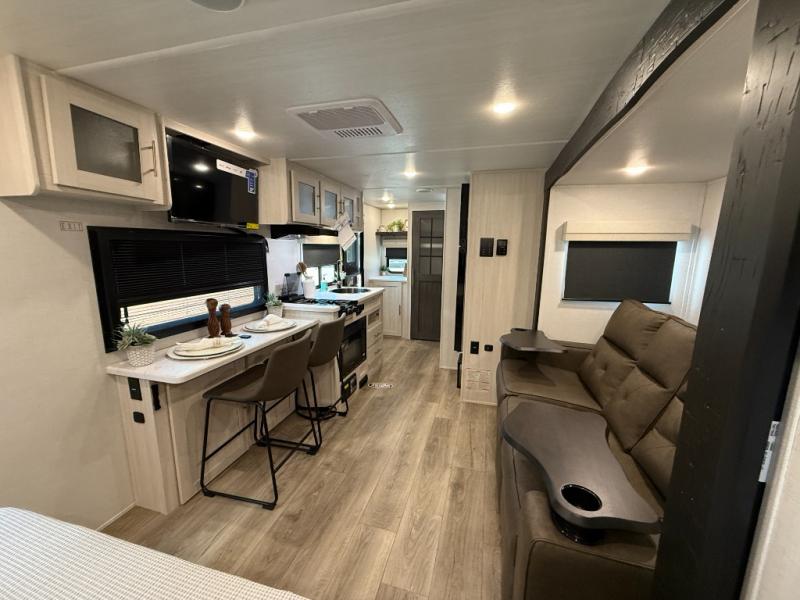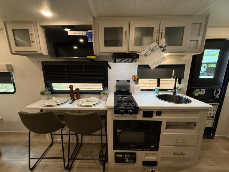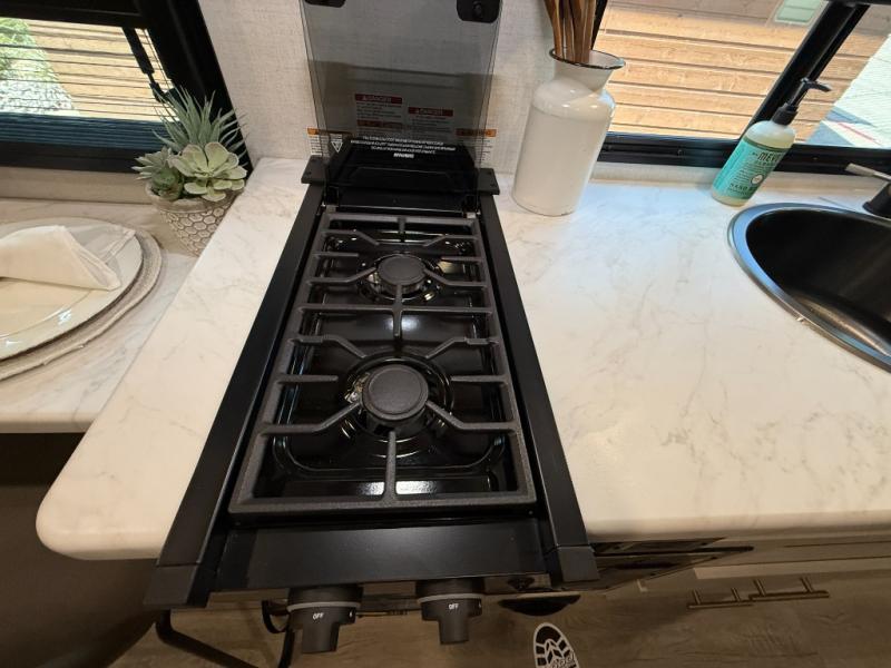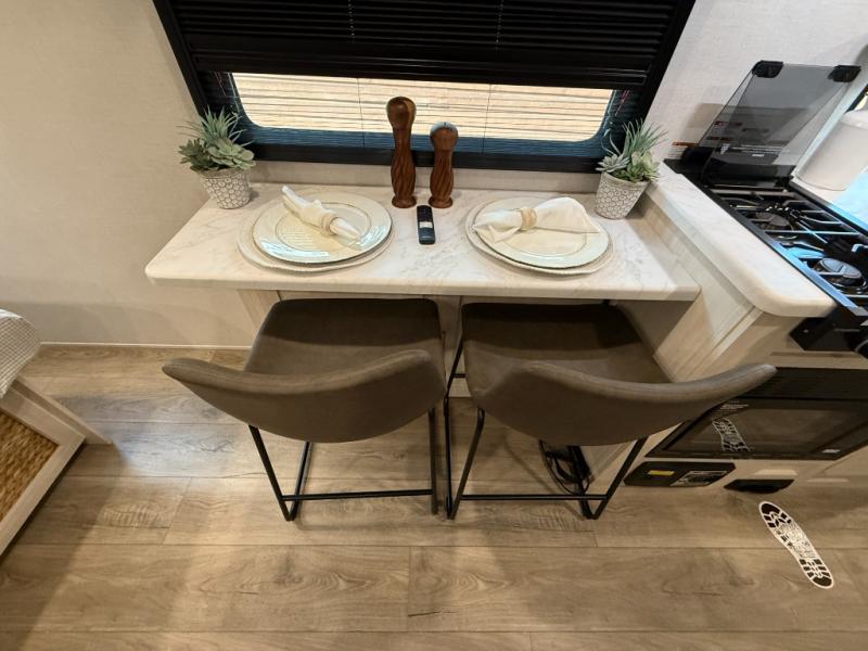 A front bedroom with a walk-around queen bed, a full bath, and a theater seat slide out are a few of the features that you are sure to want in your next RV! You can rest comfortably each night, plus all your clothing can be stored in the dual wardrobes to keep everything tidy. If you're needing more sleeping space, just choose the optional tri-fold sofa or optional booth dinette in place of the theater seat! The chef of your group can make meals on the two burner cooktop or in the convection microwave, and there is a 12V black glass refrigerator for perishables. And the bar top with two seats and the flip-up window provide a great view outdoors as you dine together.