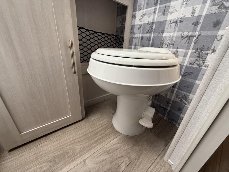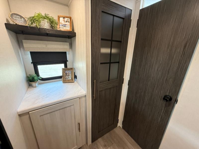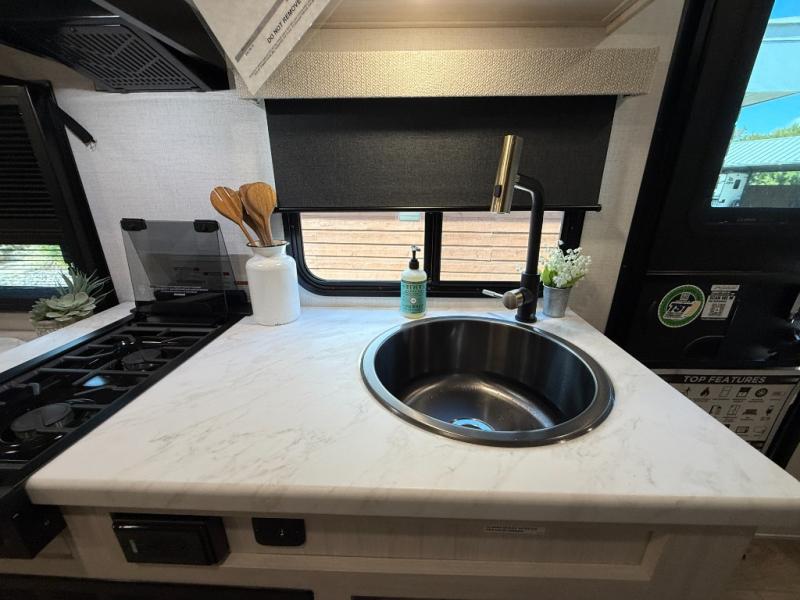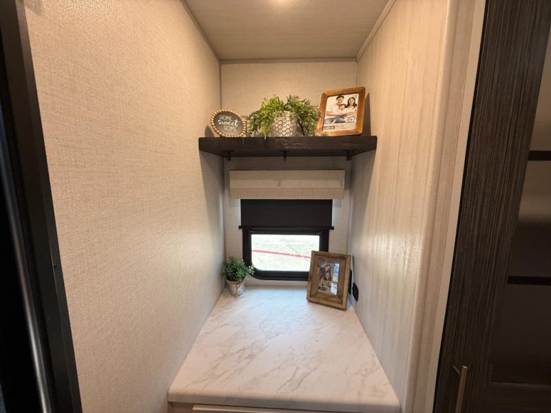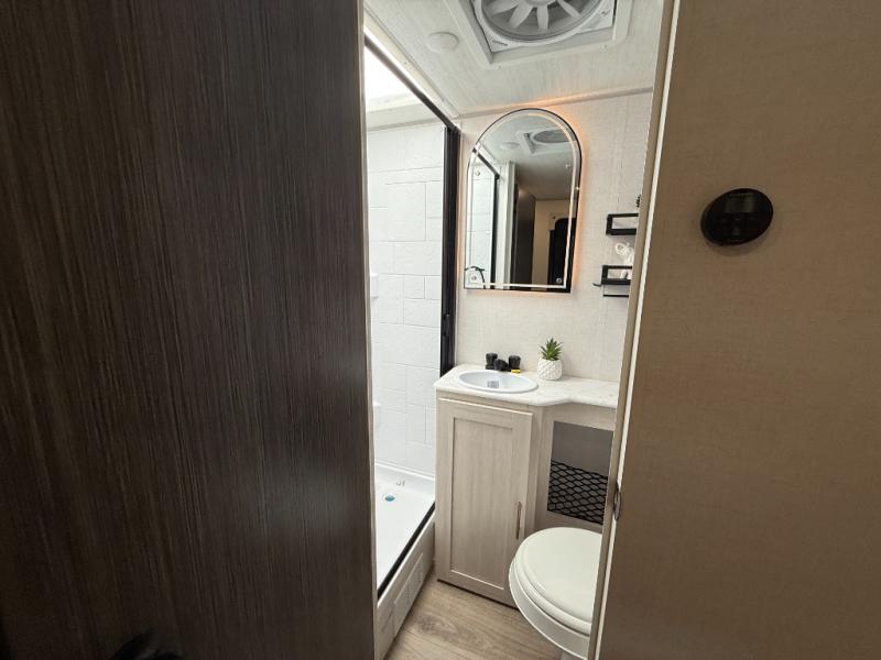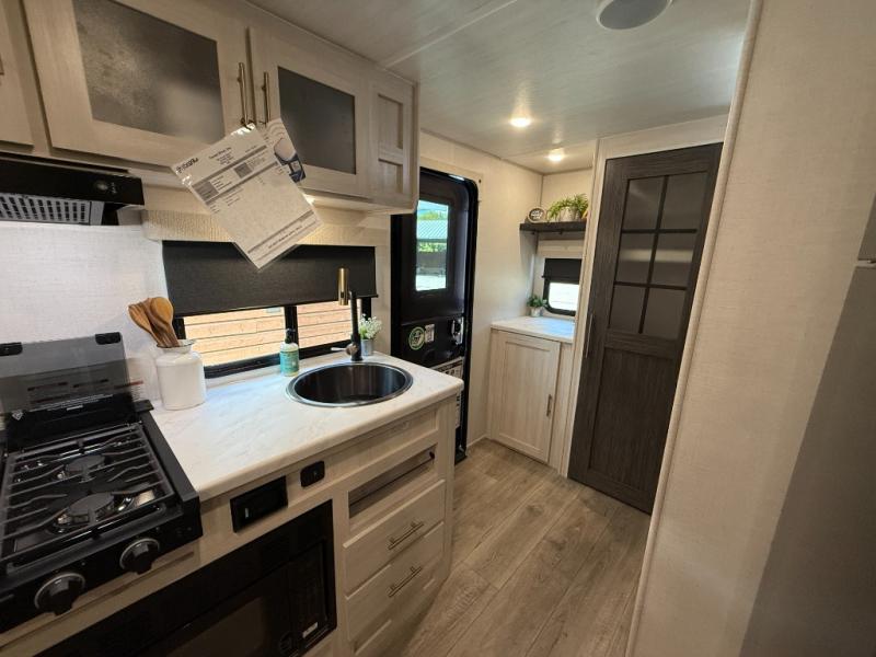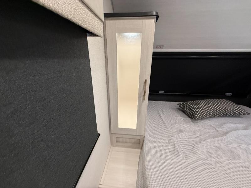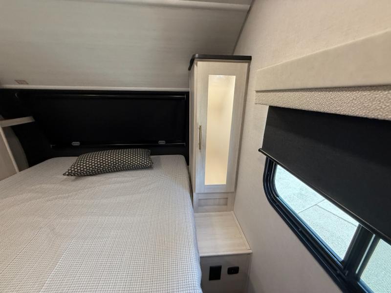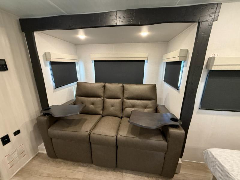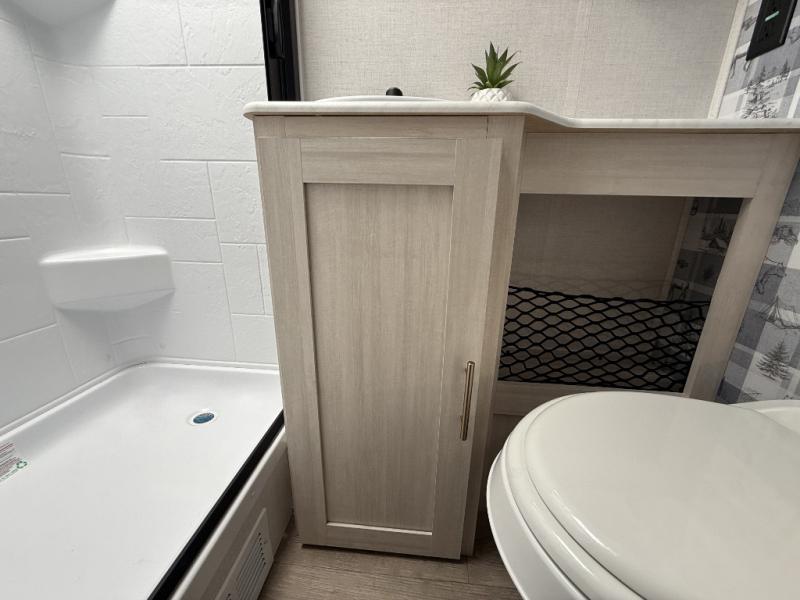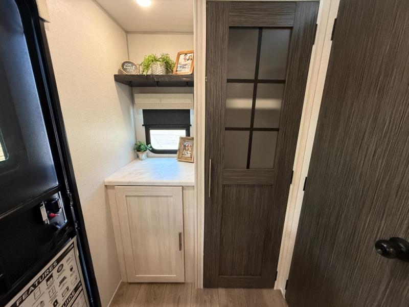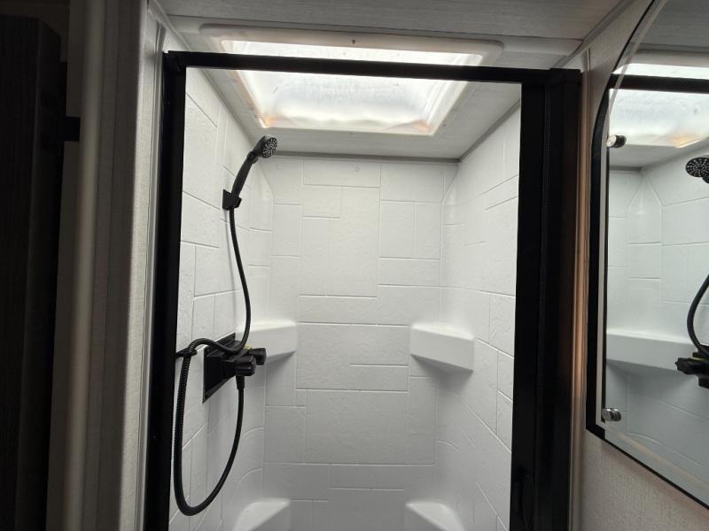 A front bedroom with a walk-around queen bed, a full bath, and a theater seat slide out are a few of the features that you are sure to want in your next RV! You can rest comfortably each night, plus all your clothing can be stored in the dual wardrobes to keep everything tidy. If you're needing more sleeping space, just choose the optional tri-fold sofa or optional booth dinette in place of the theater seat! The chef of your group can make meals on the two burner cooktop or in the convection microwave, and there is a 12V black glass refrigerator for perishables. And the bar top with two seats and the flip-up window provide a great view outdoors as you dine together.
