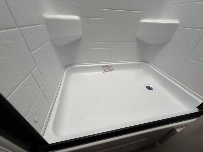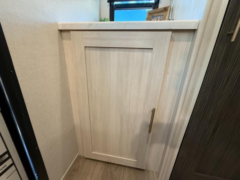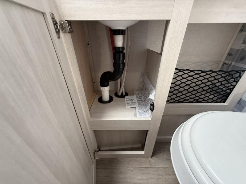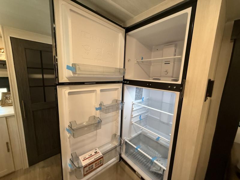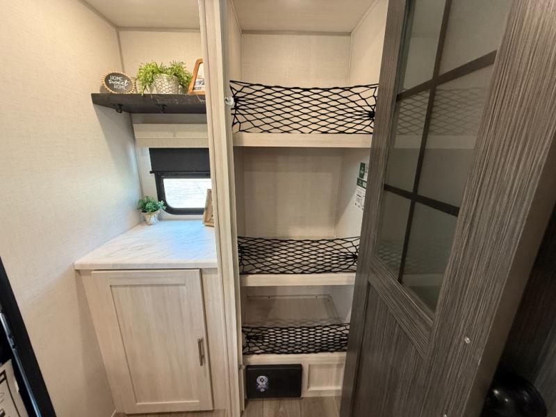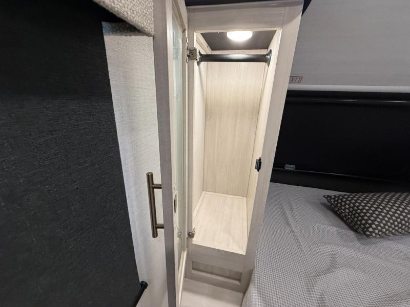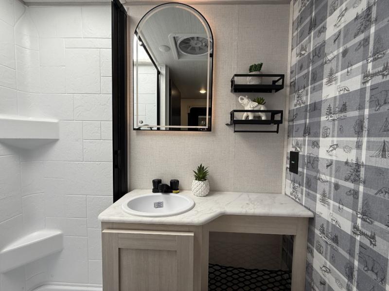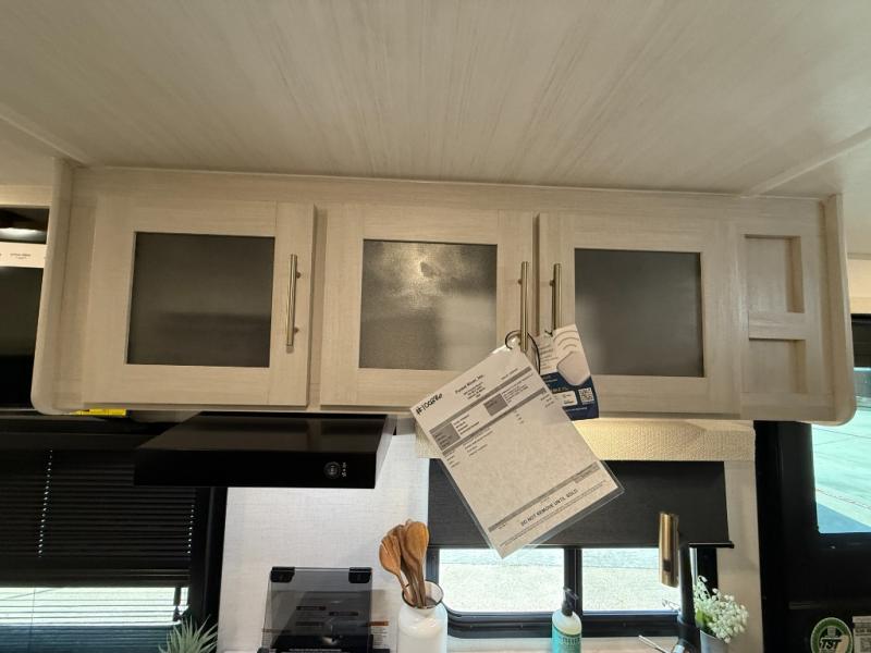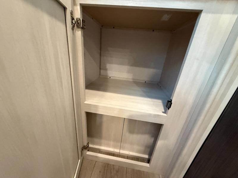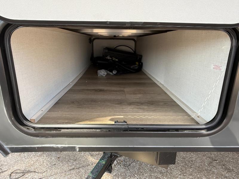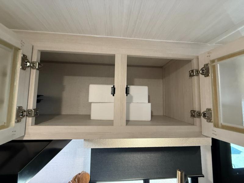 A front bedroom with a walk-around queen bed, a full bath, and a theater seat slide out are a few of the features that you are sure to want in your next RV! You can rest comfortably each night, plus all your clothing can be stored in the dual wardrobes to keep everything tidy. If you're needing more sleeping space, just choose the optional tri-fold sofa or optional booth dinette in place of the theater seat! The chef of your group can make meals on the two burner cooktop or in the convection microwave, and there is a 12V black glass refrigerator for perishables. And the bar top with two seats and the flip-up window provide a great view outdoors as you dine together.