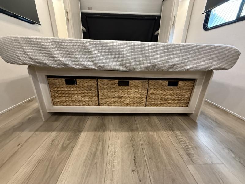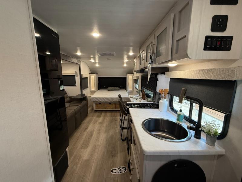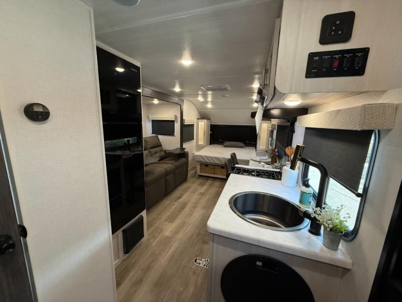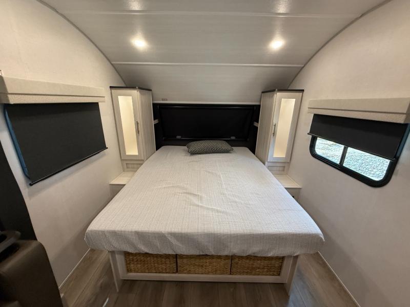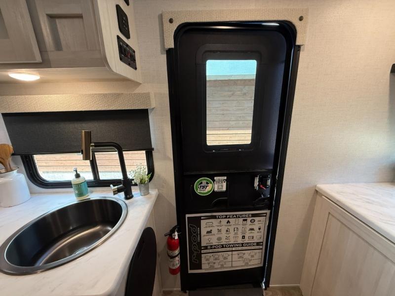 With any R-Pod travel trailer by Forest River, you will enjoy affordable luxury at the lowest tow weight in its class! There is a sealed underbelly with forced heat, a curved dual-pane acrylic front window with a bug screen and night shade, plus a large roof mounted solar panel for off-grid capabilities. The 15K A/C unit will keep you comfortable during the summer camping months, and the tankless water heater will provide endless hot showers after hiking, biking, swimming and more! Each model also includes a black glass friction hinge entrance door, roof ladder prep, exterior motion lighting, plus a hot and cold exterior spray port to wash off sand from the beach. Inside, you'll enjoy seamless Surf-X kitchen countertops, blackout roller shades, and a central vacuum system for hassle-free cleaning!