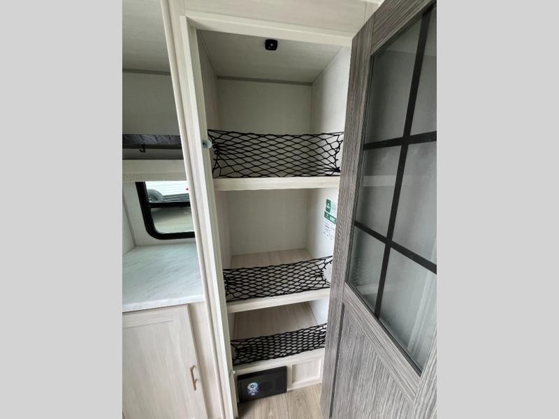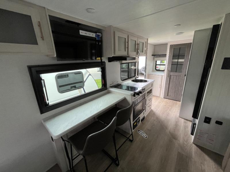 A front bedroom with a walk-around queen bed, a full bath, and a theater seat slide out are a few of the features that you are sure to want in your next RV! You can rest comfortably each night, plus all your clothing can be stored in the dual wardrobes to keep everything tidy. If you're needing more sleeping space, just choose the optional tri-fold sofa or optional booth dinette in place of the theater seat! The chef of your group can make meals on the two burner cooktop or in the convection microwave, and there is a 12V black glass refrigerator for perishables. And the bar top with two seats and the flip-up window provide a great view outdoors as you dine together.