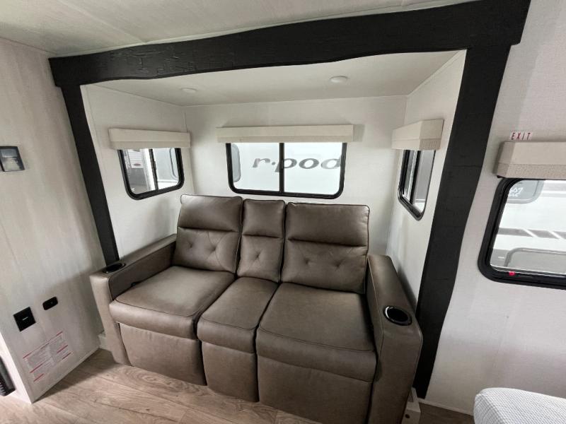 With any R-Pod travel trailer by Forest River, you will enjoy affordable luxury at the lowest tow weight in its class! There is a sealed underbelly with forced heat, a curved dual-pane acrylic front window with a bug screen and night shade, plus a large roof mounted solar panel for off-grid capabilities. The 15K A/C unit will keep you comfortable during the summer camping months, and the tankless water heater will provide endless hot showers after hiking, biking, swimming and more! Each model also includes a black glass friction hinge entrance door, roof ladder prep, exterior motion lighting, plus a hot and cold exterior spray port to wash off sand from the beach. Inside, you'll enjoy seamless Surf-X kitchen countertops, blackout roller shades, and a central vacuum system for hassle-free cleaning!