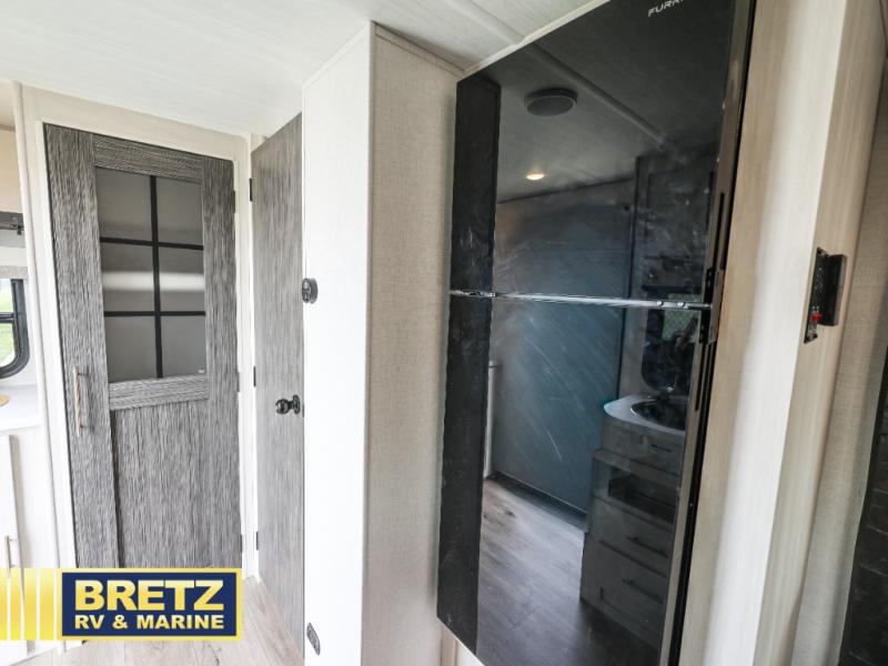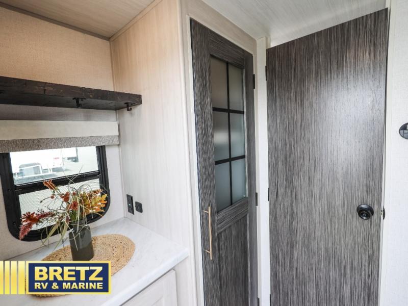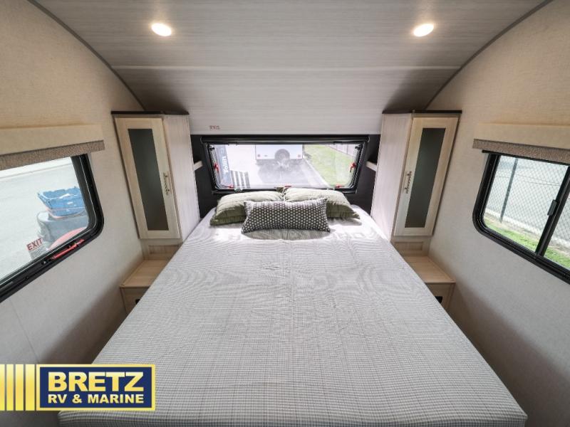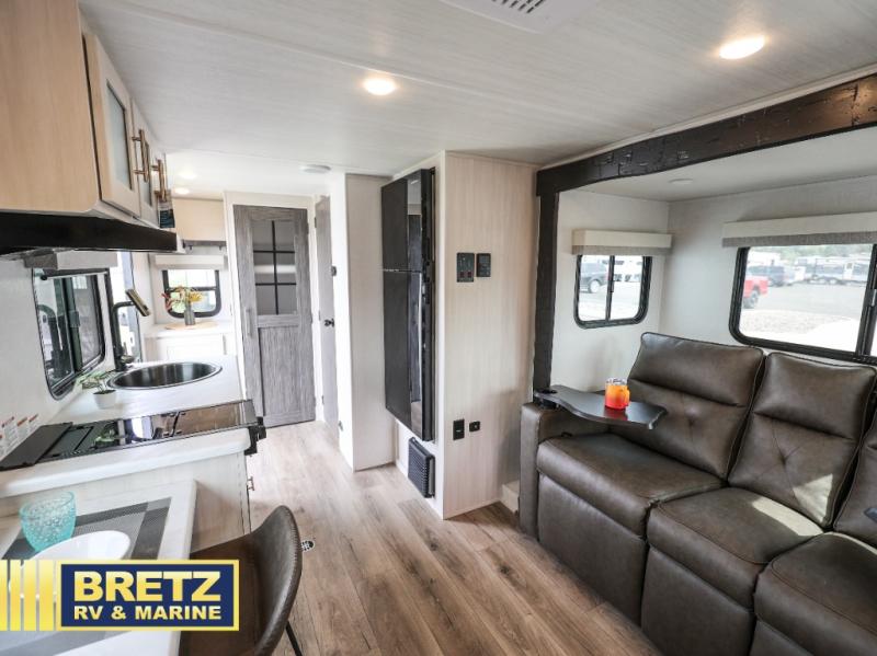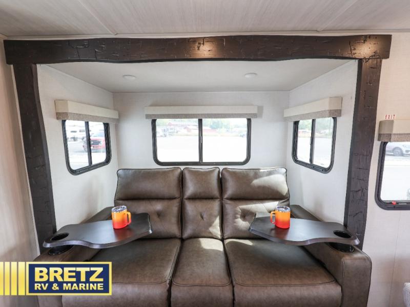 A front bedroom with a walk-around queen bed, a full bath, and a theater seat slide out are a few of the features that you are sure to want in your next RV! You can rest comfortably each night, plus all your clothing can be stored in the dual wardrobes to keep everything tidy. If you're needing more sleeping space, just choose the optional tri-fold sofa or optional booth dinette in place of the theater seat! The chef of your group can make meals on the two burner cooktop or in the convection microwave, and there is a 12V black glass refrigerator for perishables. And the bar top with two seats and the flip-up window provide a great view outdoors as you dine together.