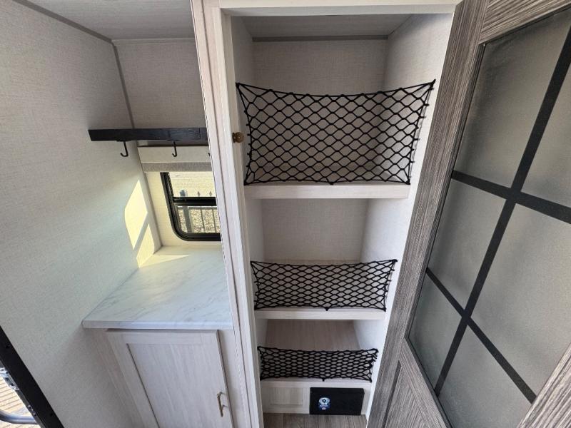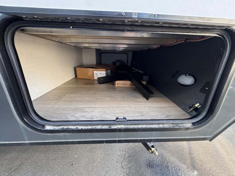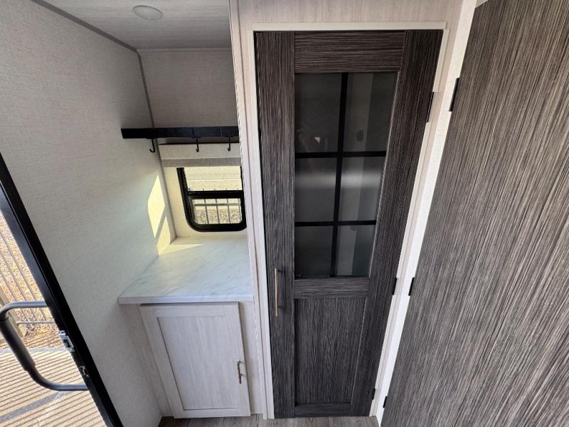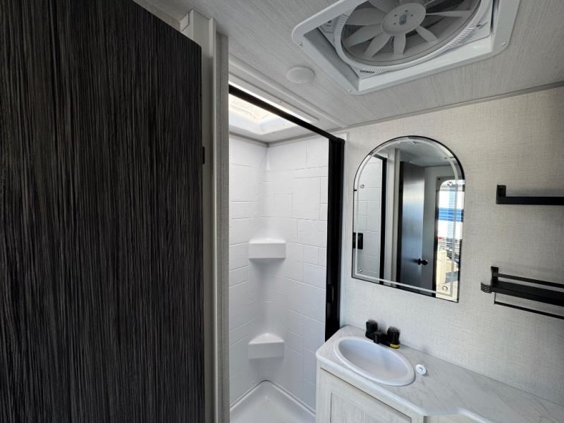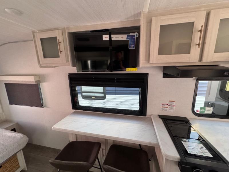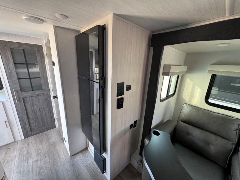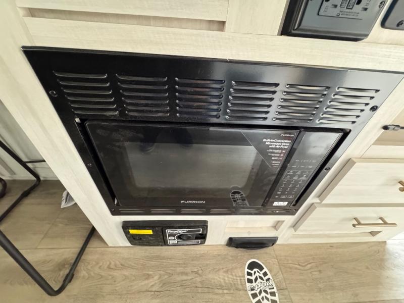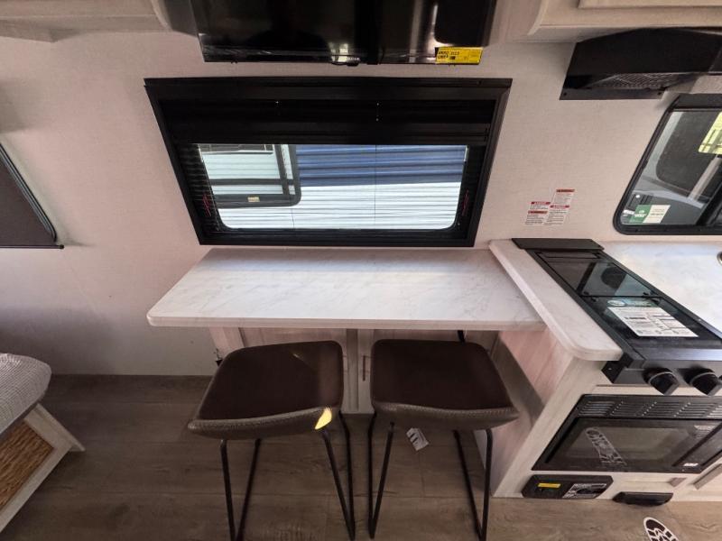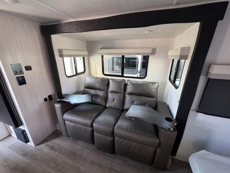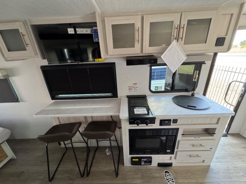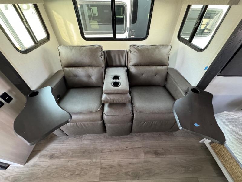 A front bedroom with a walk-around queen bed, a full bath, and a theater seat slide out are a few of the features that you are sure to want in your next RV! You can rest comfortably each night, plus all your clothing can be stored in the dual wardrobes to keep everything tidy. If you're needing more sleeping space, just choose the optional tri-fold sofa or optional booth dinette in place of the theater seat! The chef of your group can make meals on the two burner cooktop or in the convection microwave, and there is a 12V black glass refrigerator for perishables. And the bar top with two seats and the flip-up window provide a great view outdoors as you dine together.