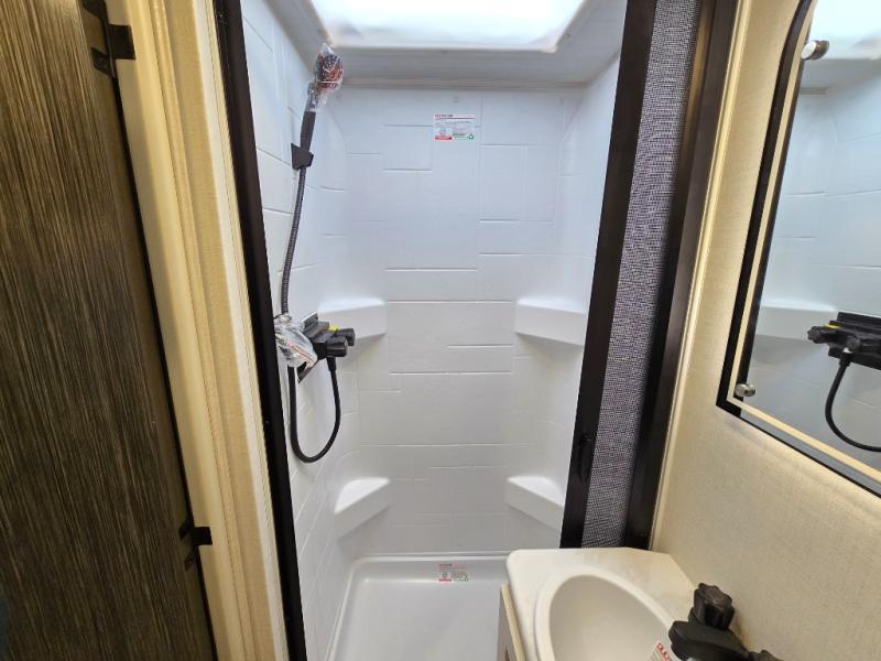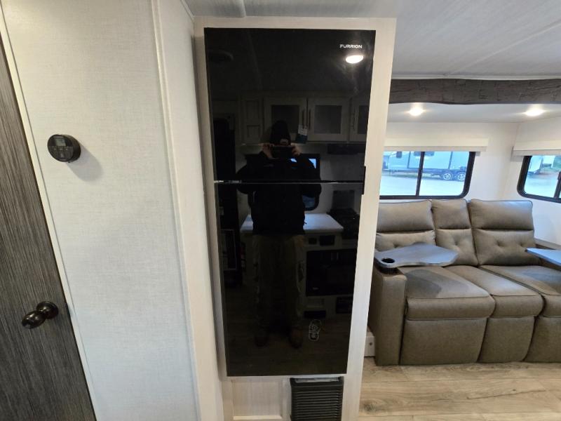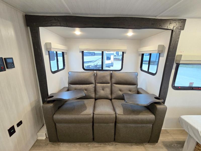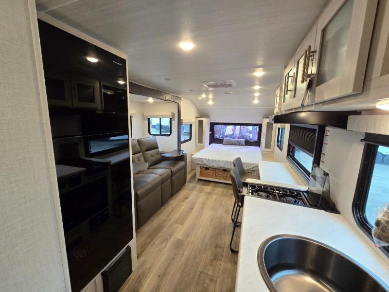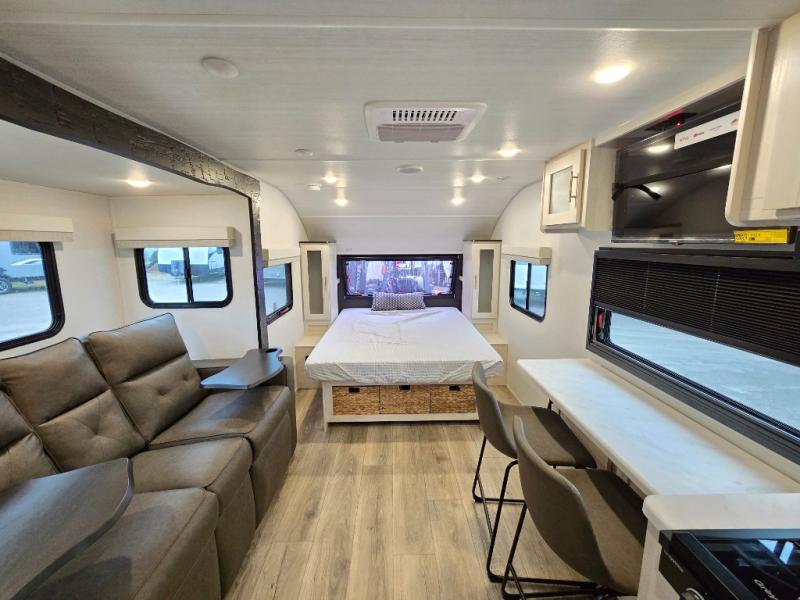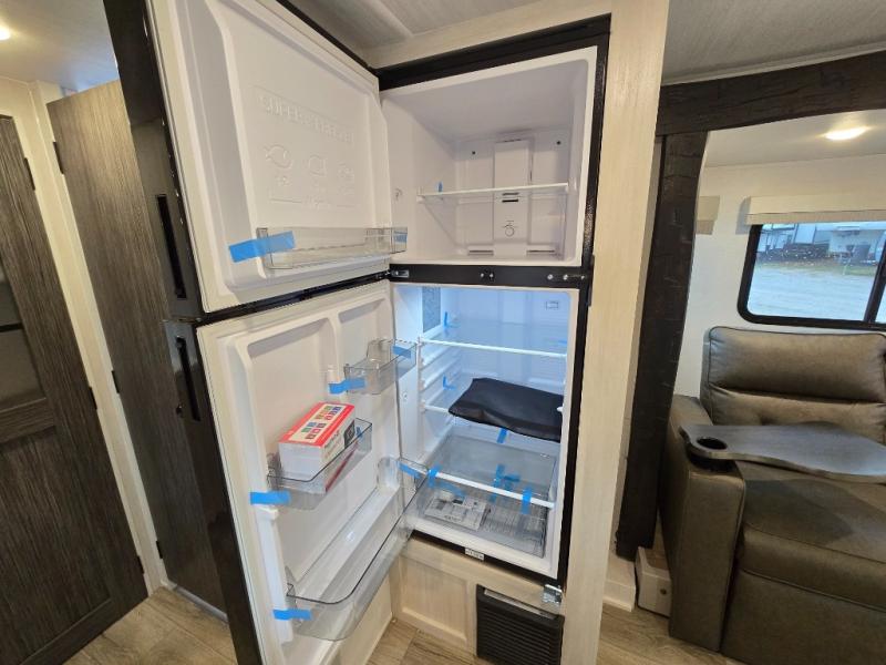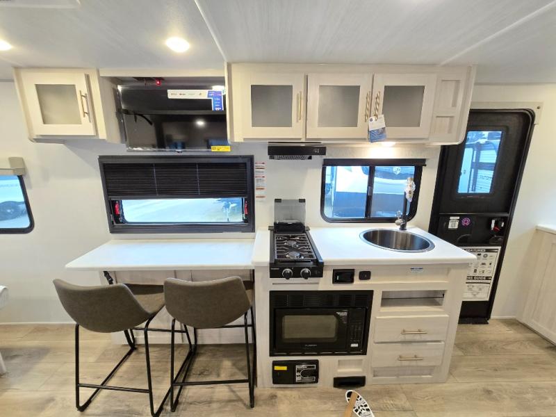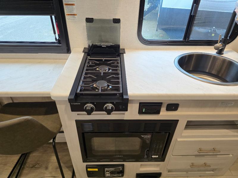 A front bedroom with a walk-around queen bed, a full bath, and a theater seat slide out are a few of the features that you are sure to want in your next RV! You can rest comfortably each night, plus all your clothing can be stored in the dual wardrobes to keep everything tidy. If you're needing more sleeping space, just choose the optional tri-fold sofa or optional booth dinette in place of the theater seat! The chef of your group can make meals on the two burner cooktop or in the convection microwave, and there is a 12V black glass refrigerator for perishables. And the bar top with two seats and the flip-up window provide a great view outdoors as you dine together.