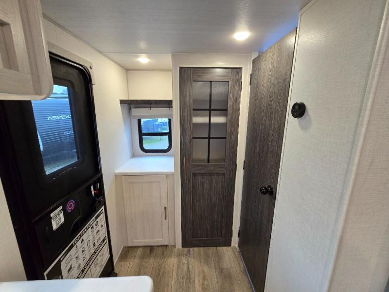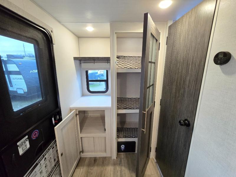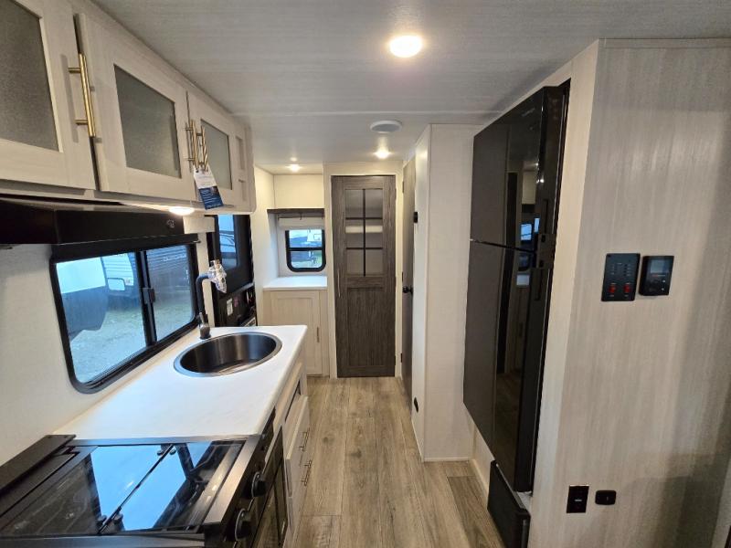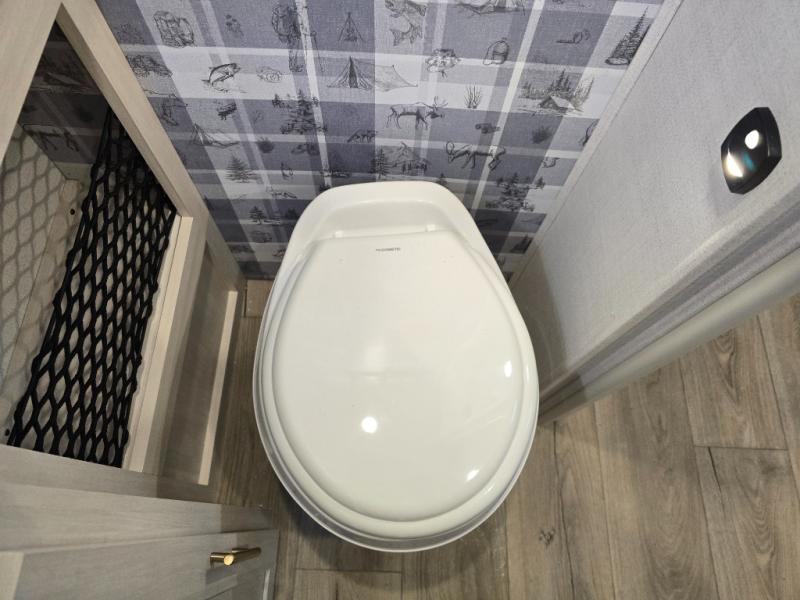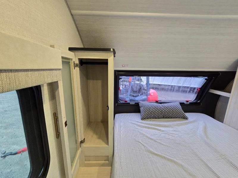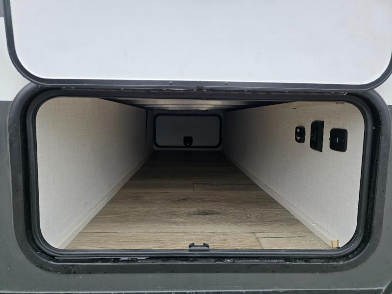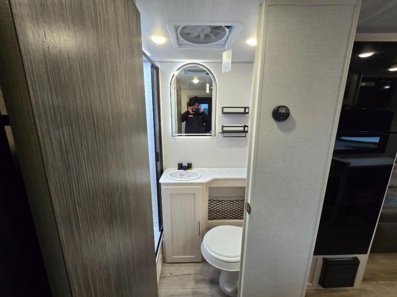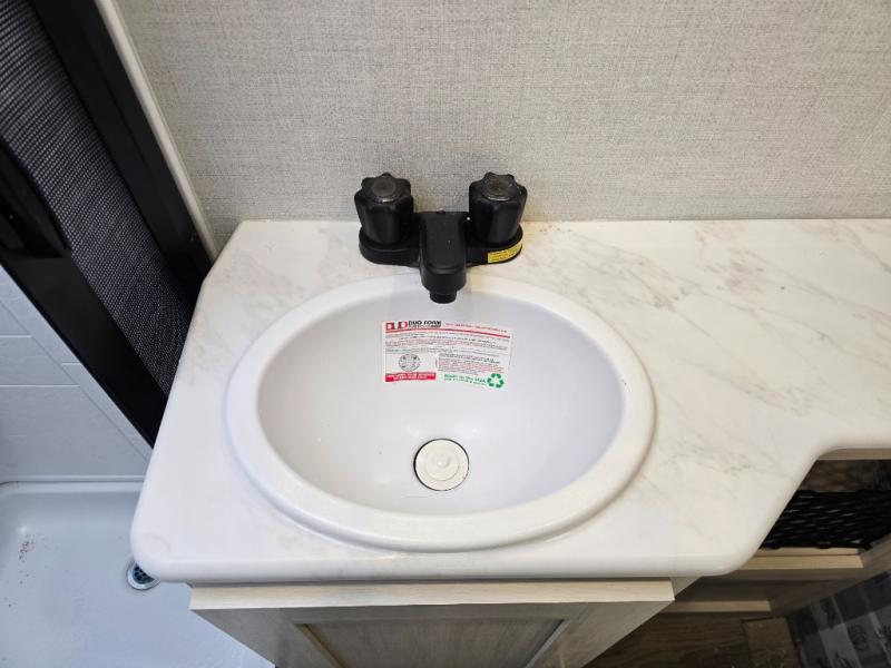 A front bedroom with a walk-around queen bed, a full bath, and a theater seat slide out are a few of the features that you are sure to want in your next RV! You can rest comfortably each night, plus all your clothing can be stored in the dual wardrobes to keep everything tidy. If you're needing more sleeping space, just choose the optional tri-fold sofa or optional booth dinette in place of the theater seat! The chef of your group can make meals on the two burner cooktop or in the convection microwave, and there is a 12V black glass refrigerator for perishables. And the bar top with two seats and the flip-up window provide a great view outdoors as you dine together.