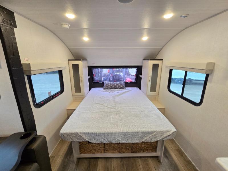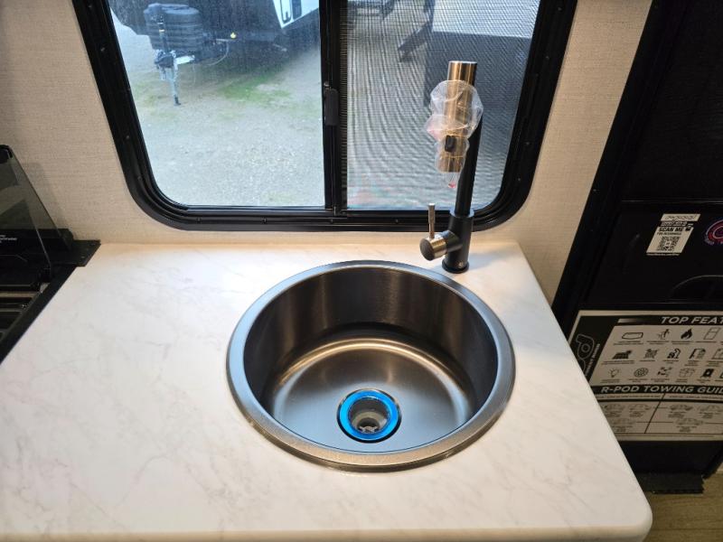With any R-Pod travel trailer by Forest River, you will enjoy affordable luxury at the lowest tow weight in its class! There is a sealed underbelly with forced heat, a curved dual-pane acrylic front window with a bug screen and night shade, plus a large roof mounted solar panel for off-grid capabilities. The 15K A/C unit will keep you comfortable during the summer camping months, and the tankless water heater will provide endless hot showers after hiking, biking, swimming and more! Each model also includes a black glass friction hinge entrance door, roof ladder prep, exterior motion lighting, plus a hot and cold exterior spray port to wash off sand from the beach. Inside, you'll enjoy seamless Surf-X kitchen countertops, blackout roller shades, and a central vacuum system for hassle-free cleaning!