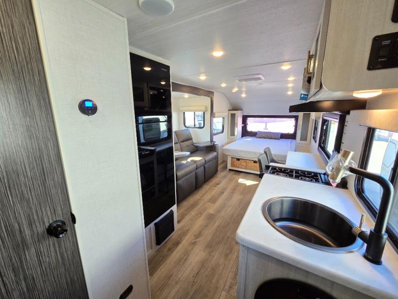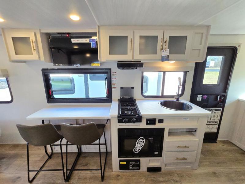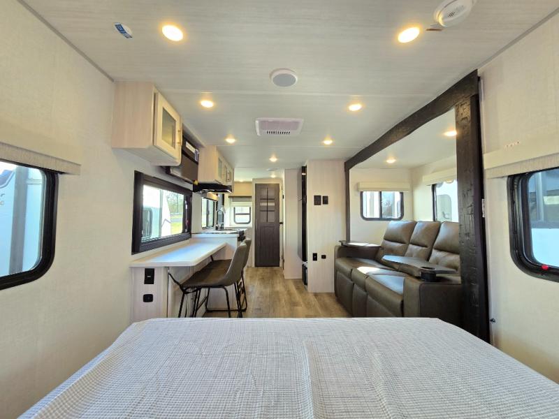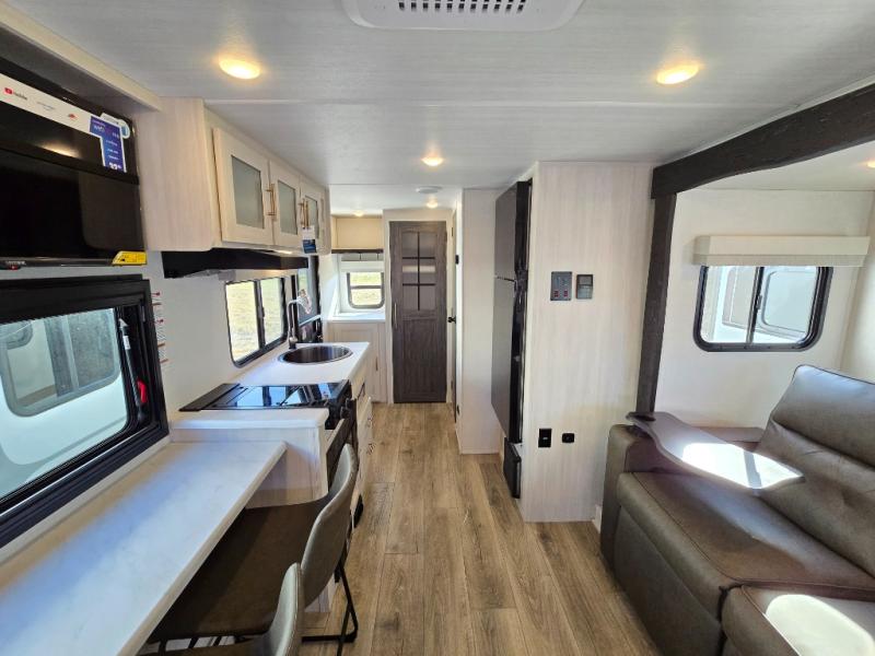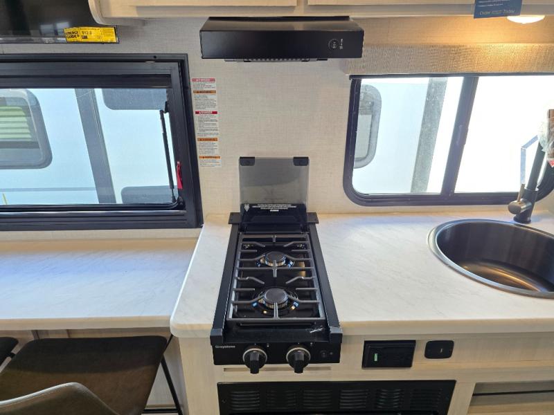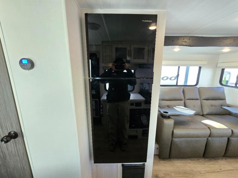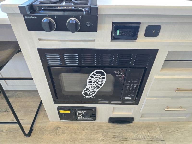 A front bedroom with a walk-around queen bed, a full bath, and a theater seat slide out are a few of the features that you are sure to want in your next RV! You can rest comfortably each night, plus all your clothing can be stored in the dual wardrobes to keep everything tidy. If you're needing more sleeping space, just choose the optional tri-fold sofa or optional booth dinette in place of the theater seat! The chef of your group can make meals on the two burner cooktop or in the convection microwave, and there is a 12V black glass refrigerator for perishables. And the bar top with two seats and the flip-up window provide a great view outdoors as you dine together.