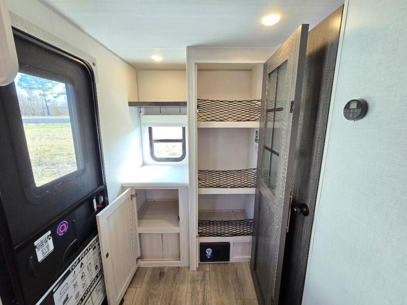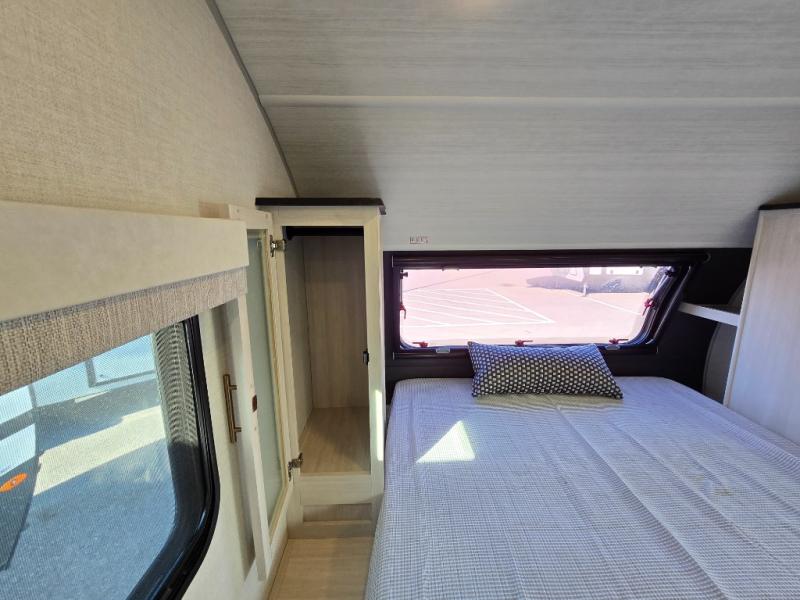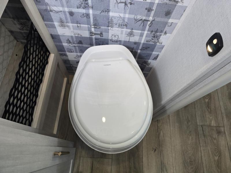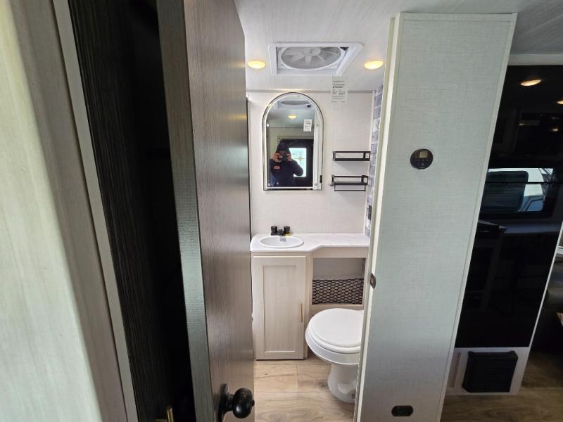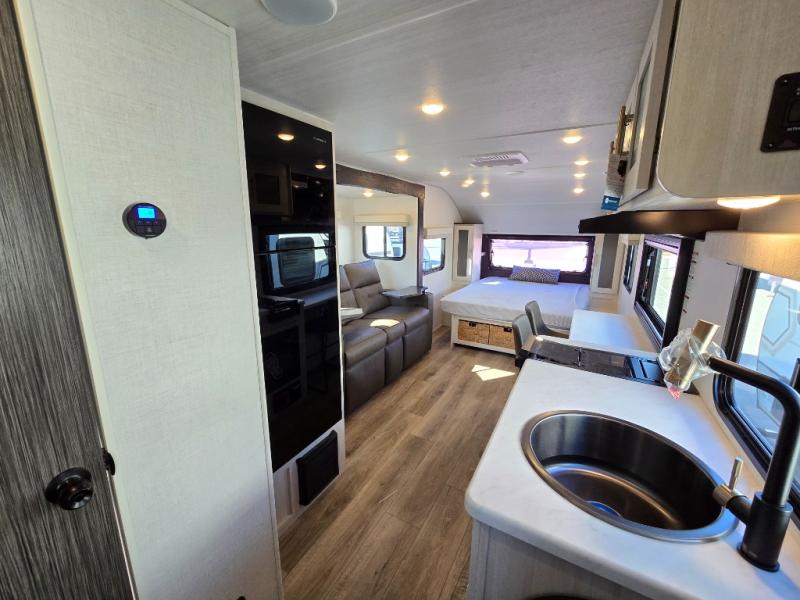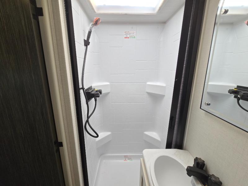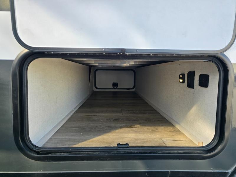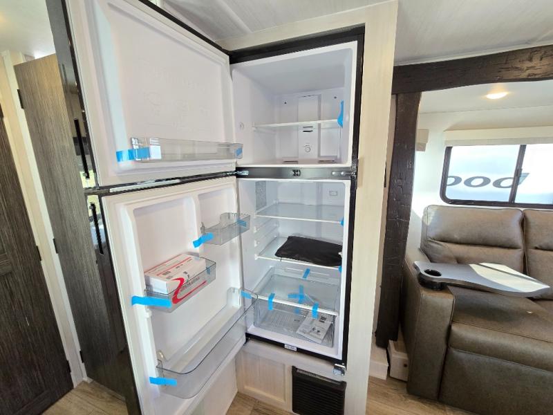 A front bedroom with a walk-around queen bed, a full bath, and a theater seat slide out are a few of the features that you are sure to want in your next RV! You can rest comfortably each night, plus all your clothing can be stored in the dual wardrobes to keep everything tidy. If you're needing more sleeping space, just choose the optional tri-fold sofa or optional booth dinette in place of the theater seat! The chef of your group can make meals on the two burner cooktop or in the convection microwave, and there is a 12V black glass refrigerator for perishables. And the bar top with two seats and the flip-up window provide a great view outdoors as you dine together.