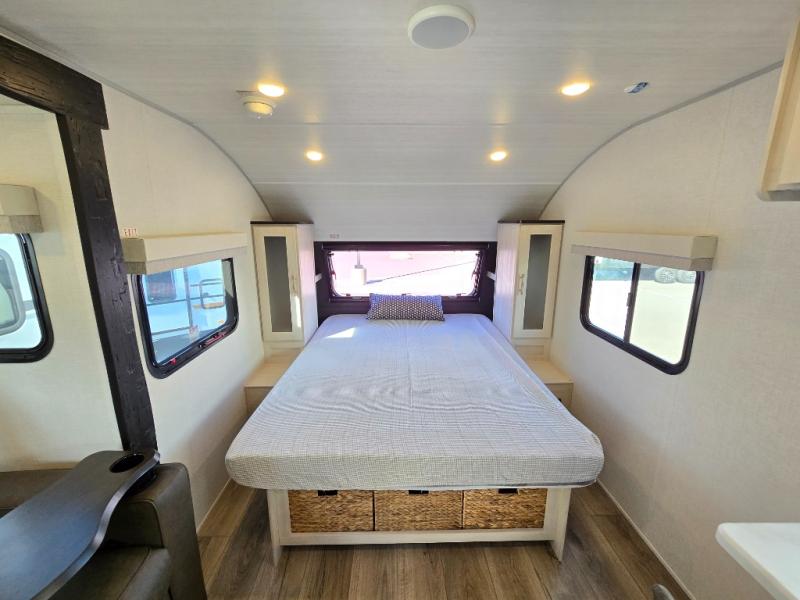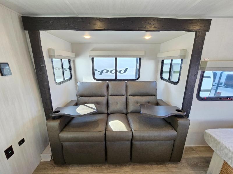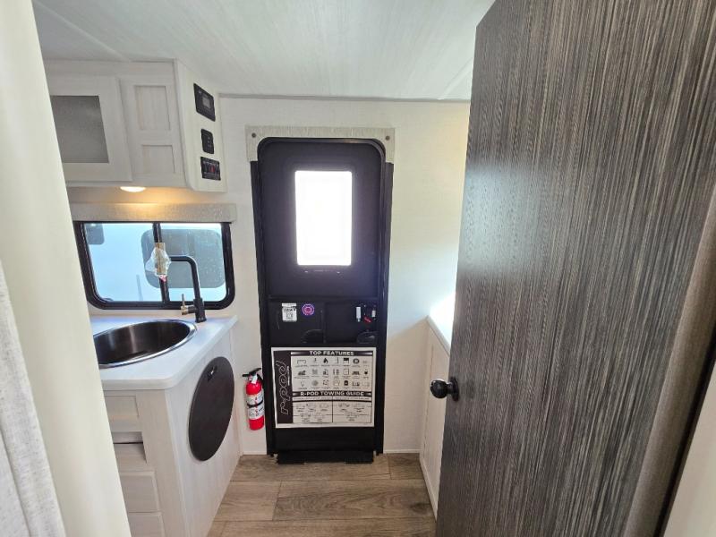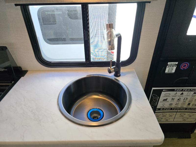 With any R-Pod travel trailer by Forest River, you will enjoy affordable luxury at the lowest tow weight in its class! There is a sealed underbelly with forced heat, a curved dual-pane acrylic front window with a bug screen and night shade, plus a large roof mounted solar panel for off-grid capabilities. The 15K A/C unit will keep you comfortable during the summer camping months, and the tankless water heater will provide endless hot showers after hiking, biking, swimming and more! Each model also includes a black glass friction hinge entrance door, roof ladder prep, exterior motion lighting, plus a hot and cold exterior spray port to wash off sand from the beach. Inside, you'll enjoy seamless Surf-X kitchen countertops, blackout roller shades, and a central vacuum system for hassle-free cleaning!