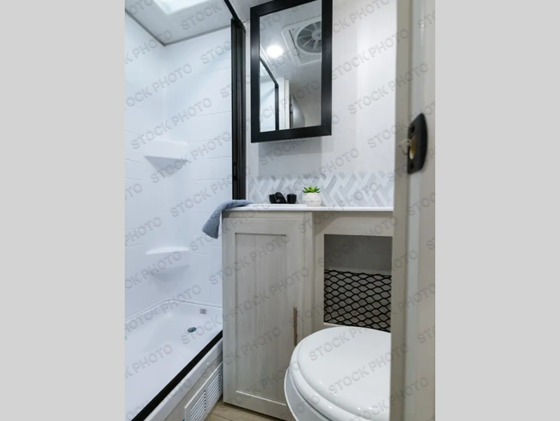 A front bedroom with a walk-around queen bed, a full bath, and a theater seat slide out are a few of the features that you are sure to want in your next RV! You can rest comfortably each night, plus all your clothing can be stored in the dual wardrobes to keep everything tidy. If you're needing more sleeping space, just choose the optional tri-fold sofa or optional booth dinette in place of the theater seat! The chef of your group can make meals on the two burner cooktop or in the convection microwave, and there is a 12V black glass refrigerator for perishables. And the bar top with two seats and the flip-up window provide a great view outdoors as you dine together.