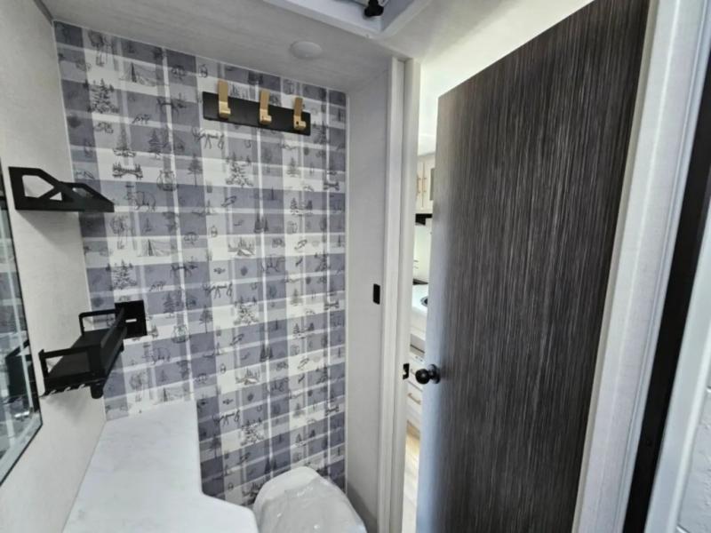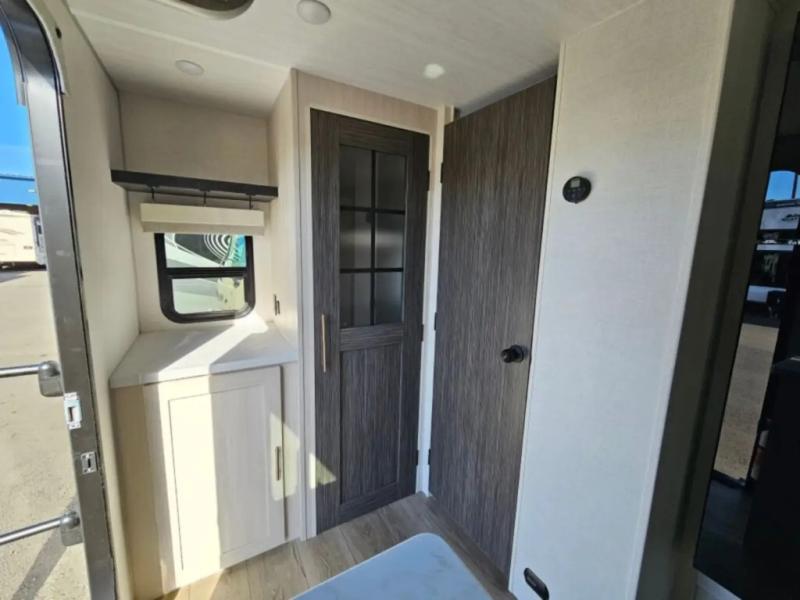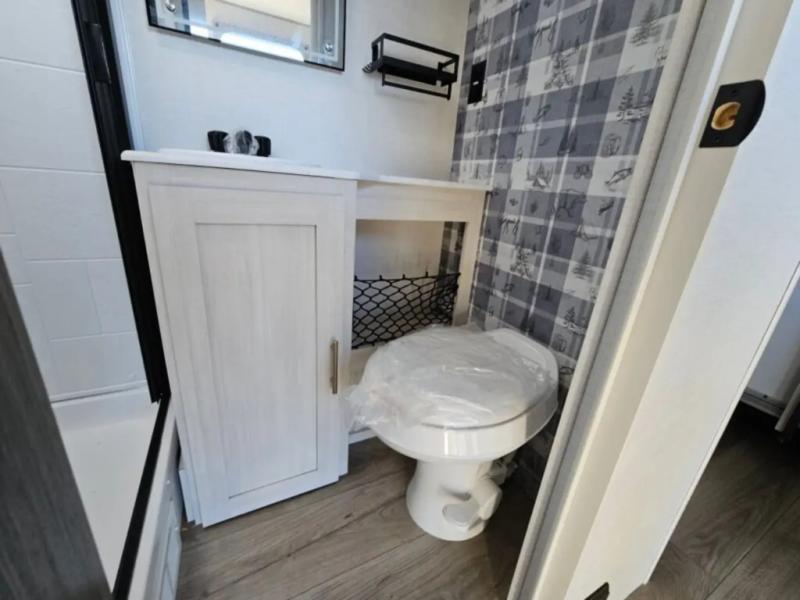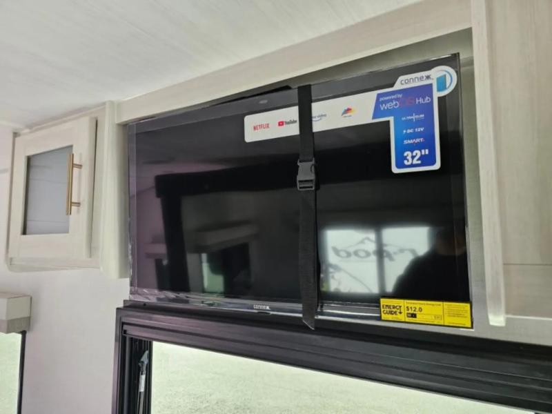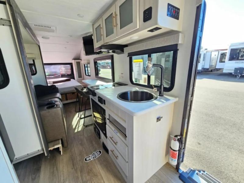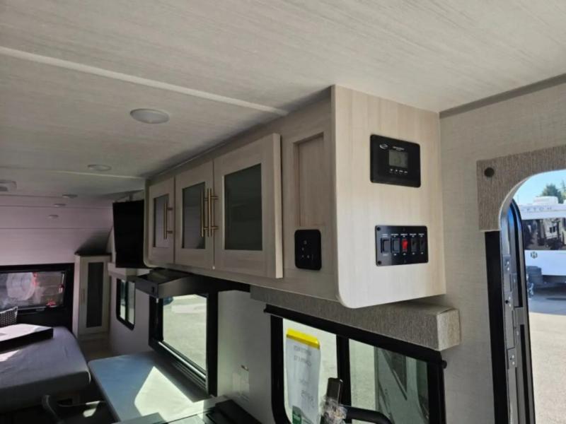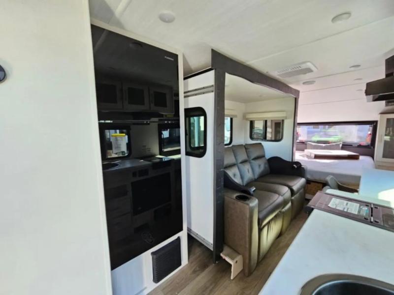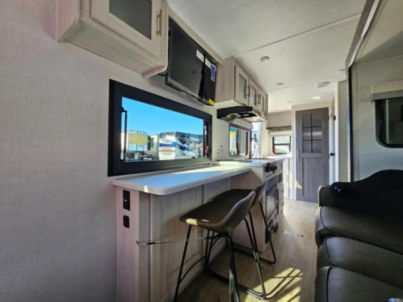 A front bedroom with a walk-around queen bed, a full bath, and a theater seat slide out are a few of the features that you are sure to want in your next RV! You can rest comfortably each night, plus all your clothing can be stored in the dual wardrobes to keep everything tidy. If you're needing more sleeping space, just choose the optional tri-fold sofa or optional booth dinette in place of the theater seat! The chef of your group can make meals on the two burner cooktop or in the convection microwave, and there is a 12V black glass refrigerator for perishables. And the bar top with two seats and the flip-up window provide a great view outdoors as you dine together.