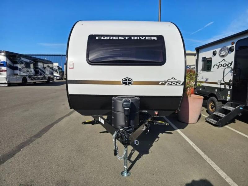 With any R-Pod travel trailer by Forest River, you will enjoy affordable luxury at the lowest tow weight in its class! There is a sealed underbelly with forced heat, a curved dual-pane acrylic front window with a bug screen and night shade, plus a large roof mounted solar panel for off-grid capabilities. The 15K A/C unit will keep you comfortable during the summer camping months, and the tankless water heater will provide endless hot showers after hiking, biking, swimming and more! Each model also includes a black glass friction hinge entrance door, roof ladder prep, exterior motion lighting, plus a hot and cold exterior spray port to wash off sand from the beach. Inside, you'll enjoy seamless Surf-X kitchen countertops, blackout roller shades, and a central vacuum system for hassle-free cleaning!