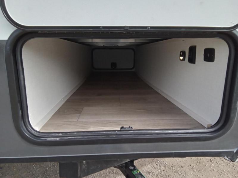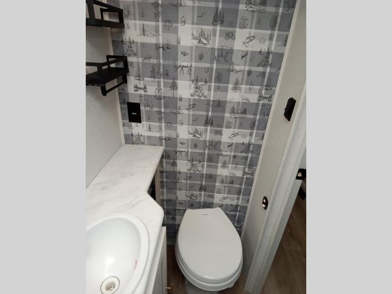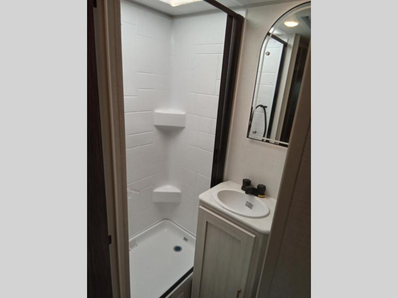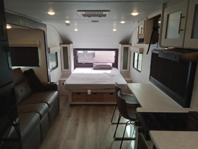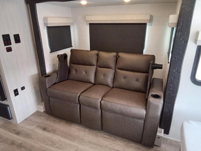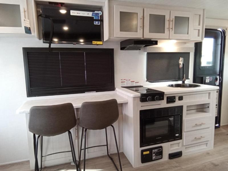 A front bedroom with a walk-around queen bed, a full bath, and a theater seat slide out are a few of the features that you are sure to want in your next RV! You can rest comfortably each night, plus all your clothing can be stored in the dual wardrobes to keep everything tidy. If you're needing more sleeping space, just choose the optional tri-fold sofa or optional booth dinette in place of the theater seat! The chef of your group can make meals on the two-burner cooktop or in the air fryer microwave, and there is a 12V black glass refrigerator for perishables. And the bar top with two seats and the flip-up window provide a great view outdoors as you dine together.