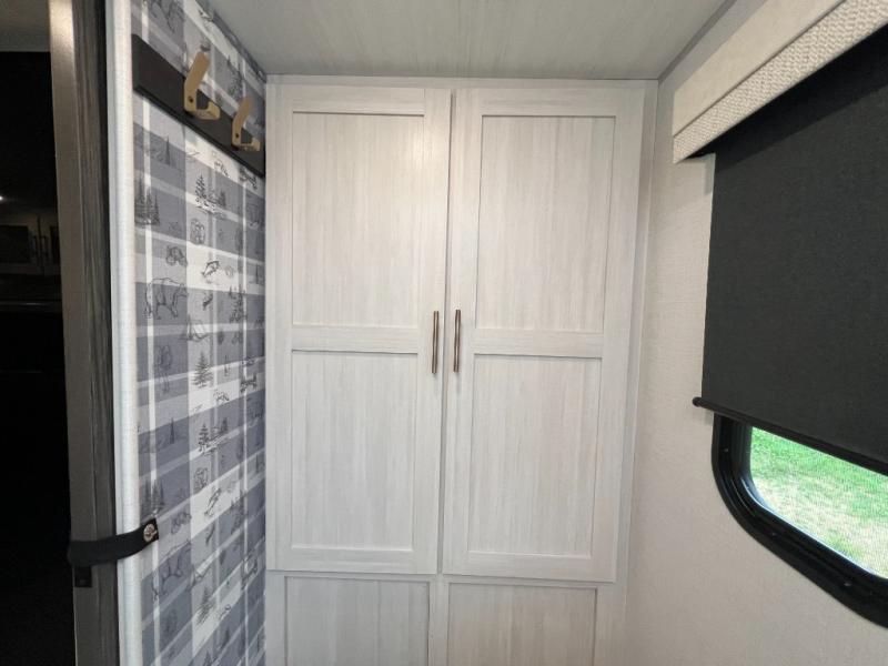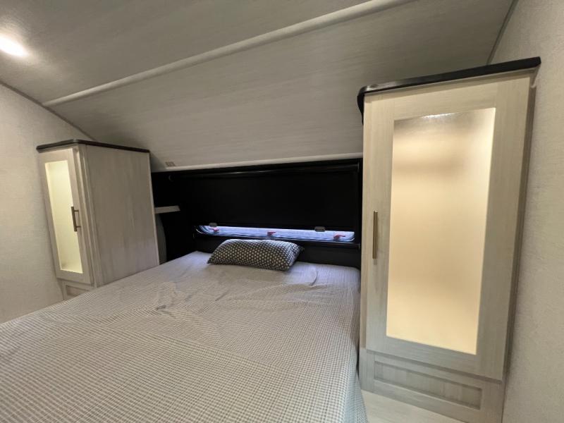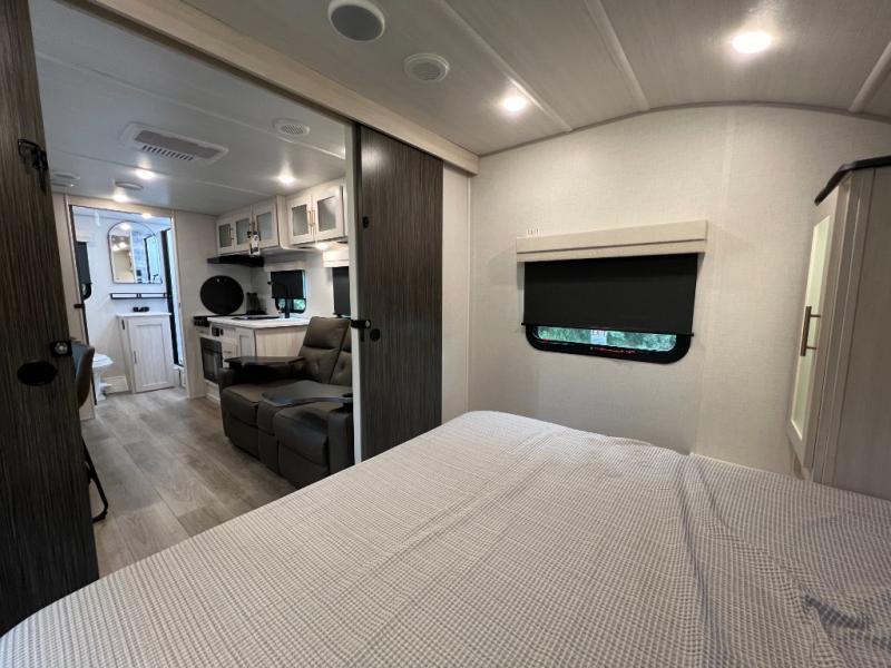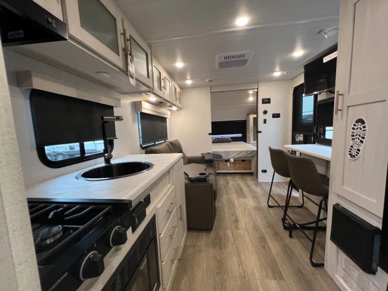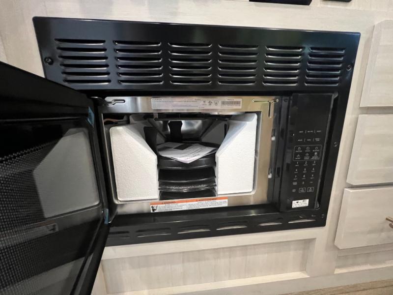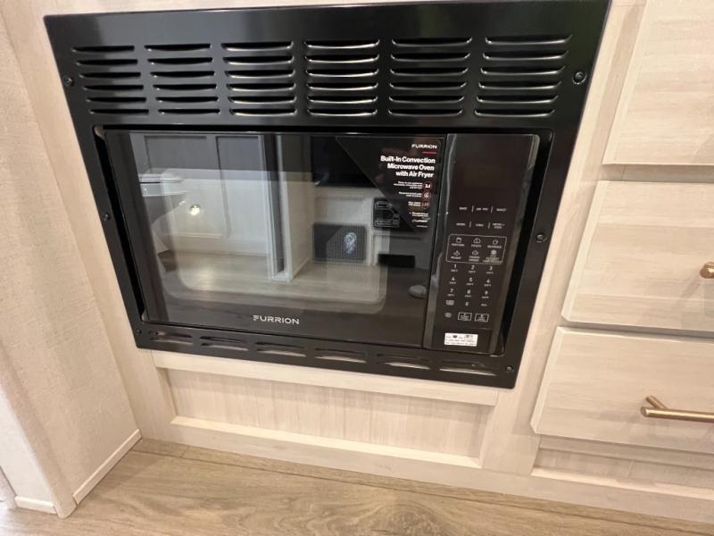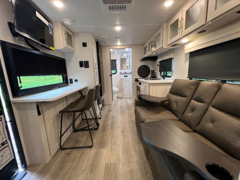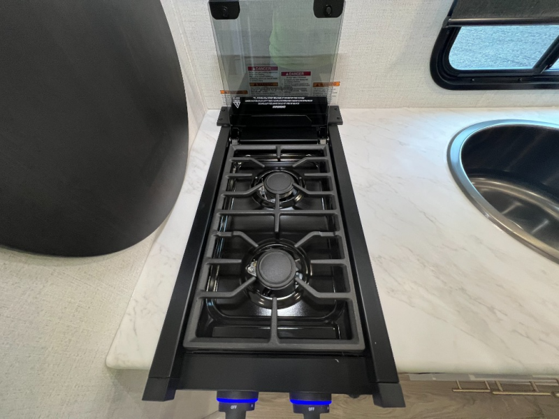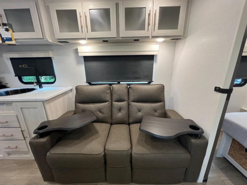 A front private bedroom with a walk-around queen bed, a full rear bath, and a theater seat are a few of the features that you are sure to want in your next RV! You can rest comfortably each night, plus all your clothing can be stored in the dual wardrobes to keep everything tidy. If you're needing more sleeping space, just choose the optional tri-fold sofa in place of the theater seat! The chef of your group can make meals on the two burner cooktop or in the air fryer/microwave, and there is a refrigerator for perishables. And the bar top with two seats and the flip-up window provide a great view outdoors as you dine together.