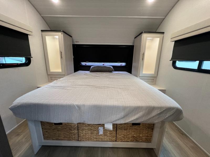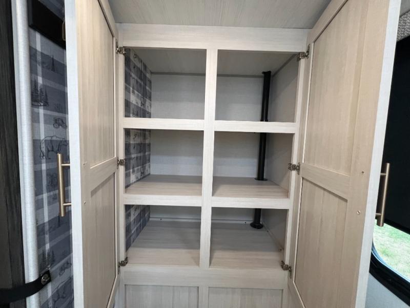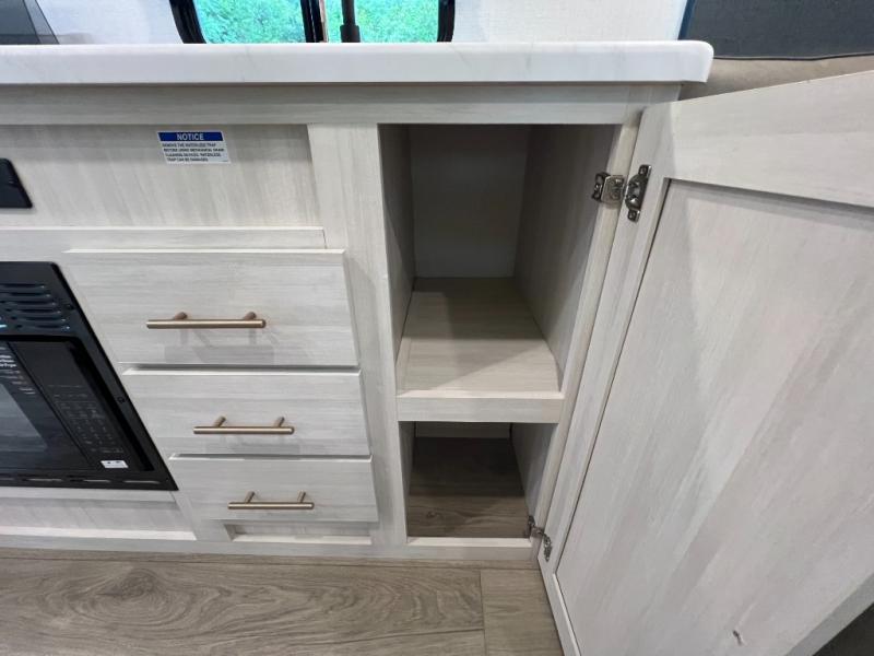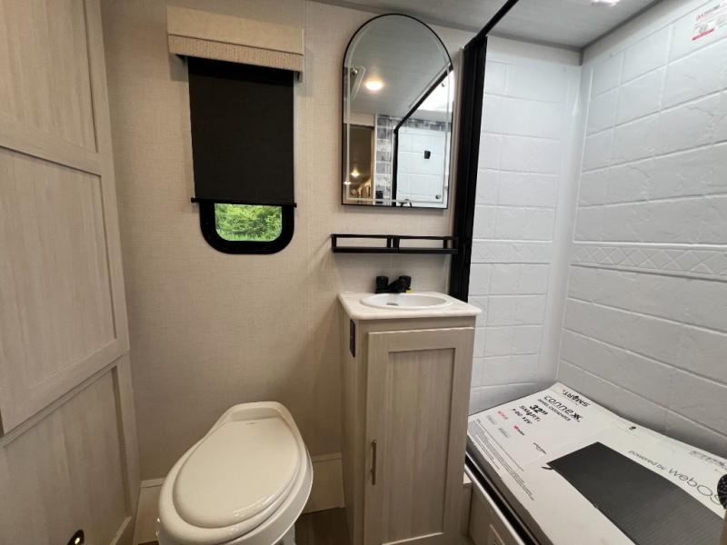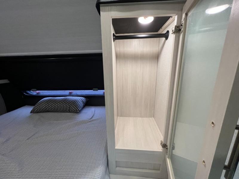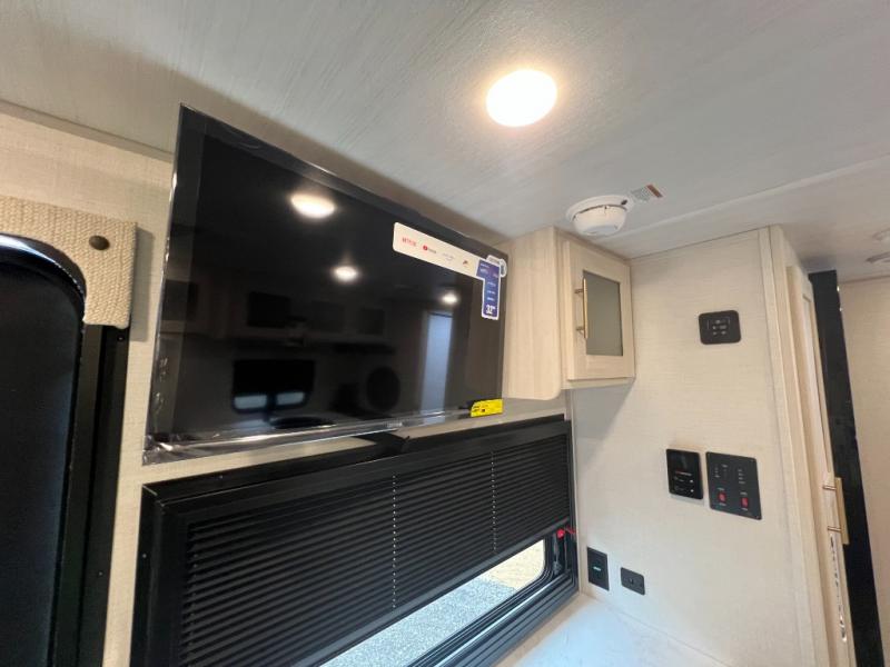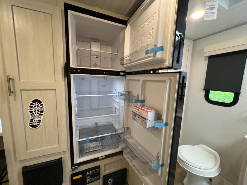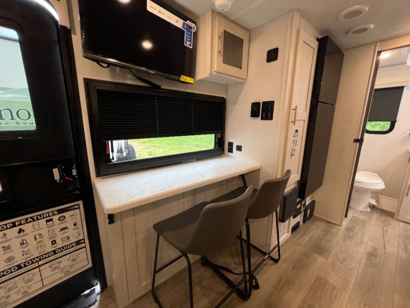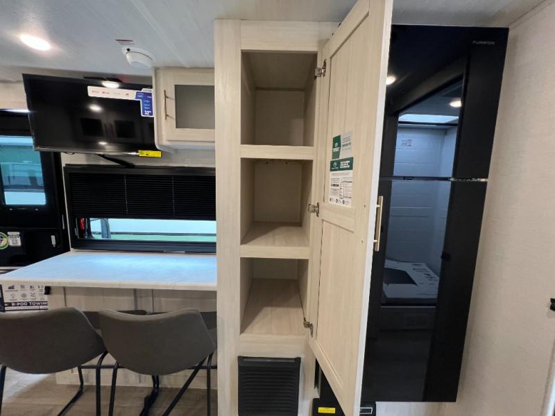 A front private bedroom with a walk-around queen bed, a full rear bath, and a theater seat are a few of the features that you are sure to want in your next RV! You can rest comfortably each night, plus all your clothing can be stored in the dual wardrobes to keep everything tidy. If you're needing more sleeping space, just choose the optional tri-fold sofa in place of the theater seat! The chef of your group can make meals on the two burner cooktop or in the air fryer/microwave, and there is a refrigerator for perishables. And the bar top with two seats and the flip-up window provide a great view outdoors as you dine together.