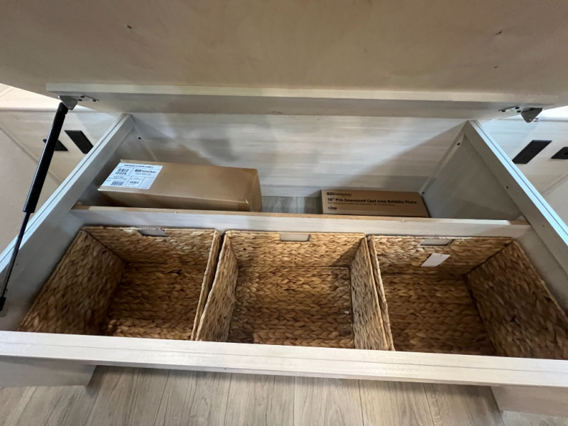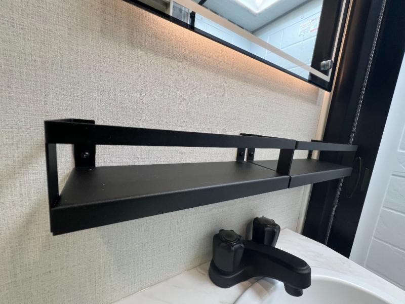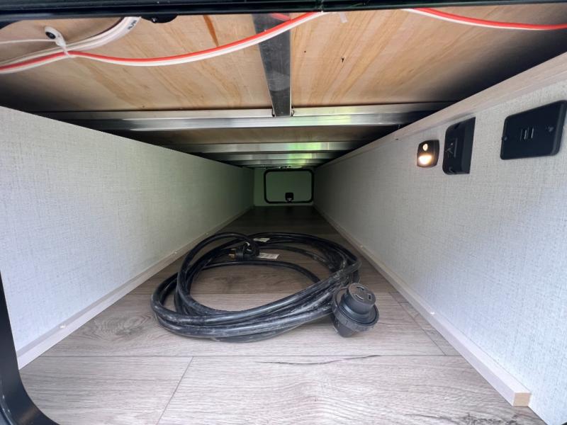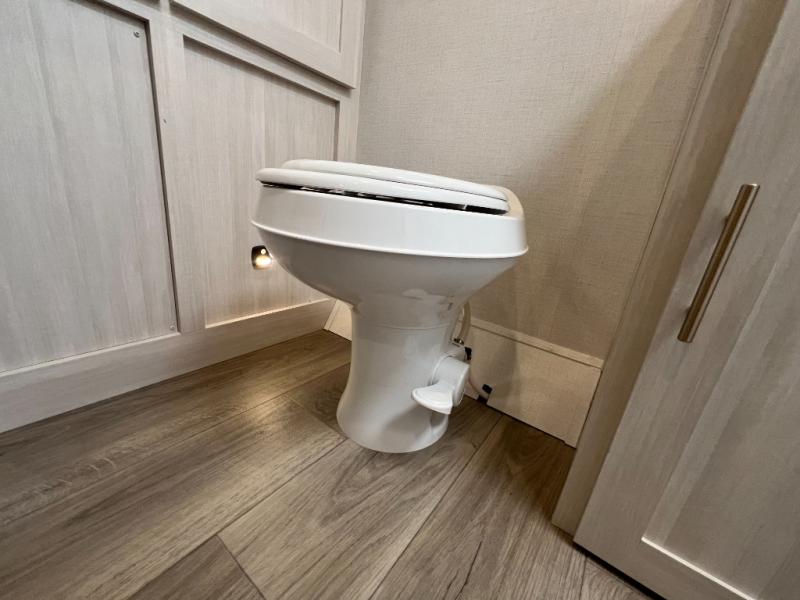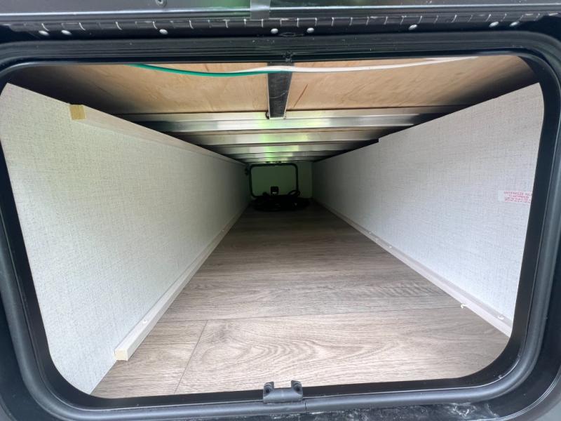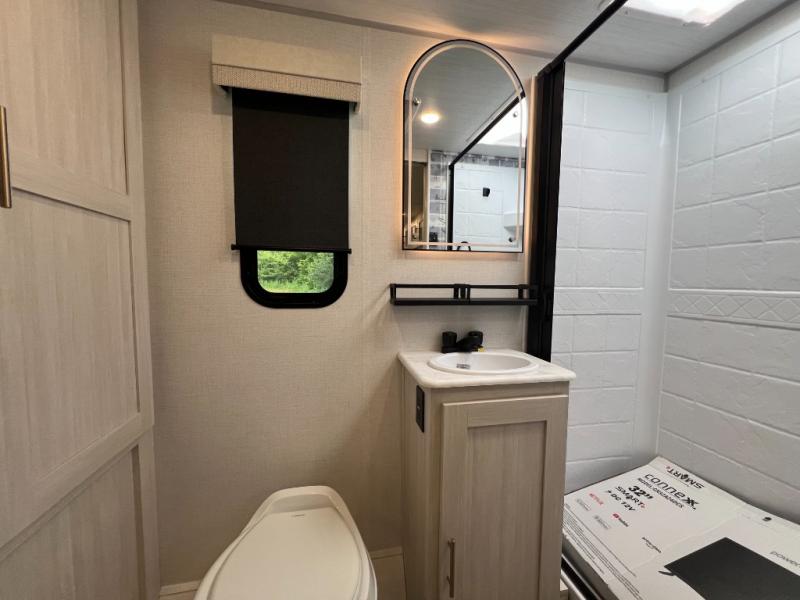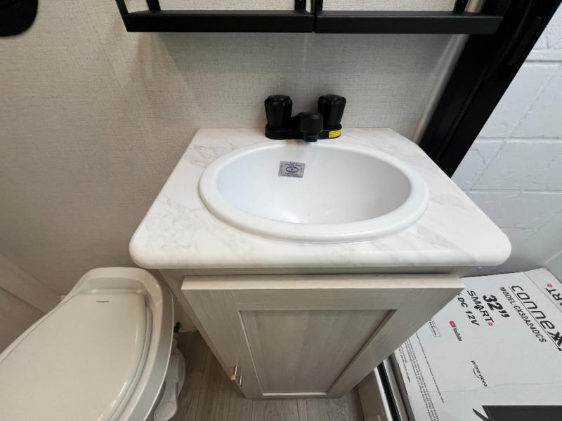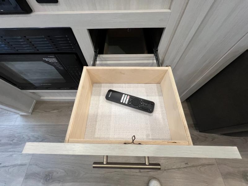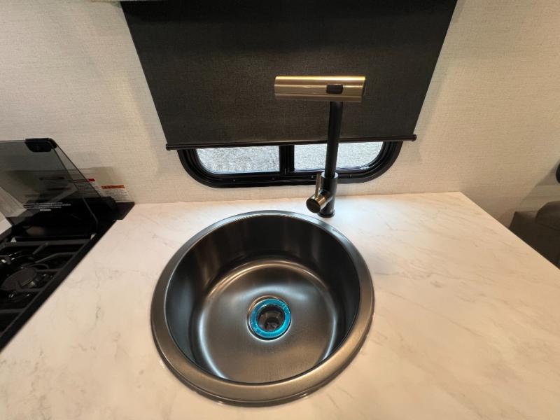A front private bedroom with a walk-around queen bed, a full rear bath, and a theater seat are a few of the features that you are sure to want in your next RV! You can rest comfortably each night, plus all your clothing can be stored in the dual wardrobes to keep everything tidy. If you're needing more sleeping space, just choose the optional tri-fold sofa in place of the theater seat! The chef of your group can make meals on the two burner cooktop or in the air fryer/microwave, and there is a refrigerator for perishables. And the bar top with two seats and the flip-up window provide a great view outdoors as you dine together.