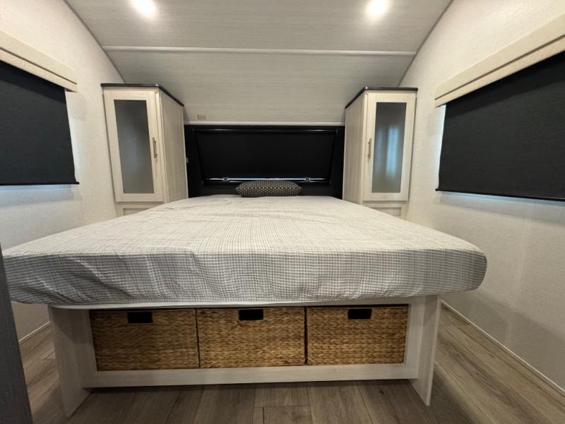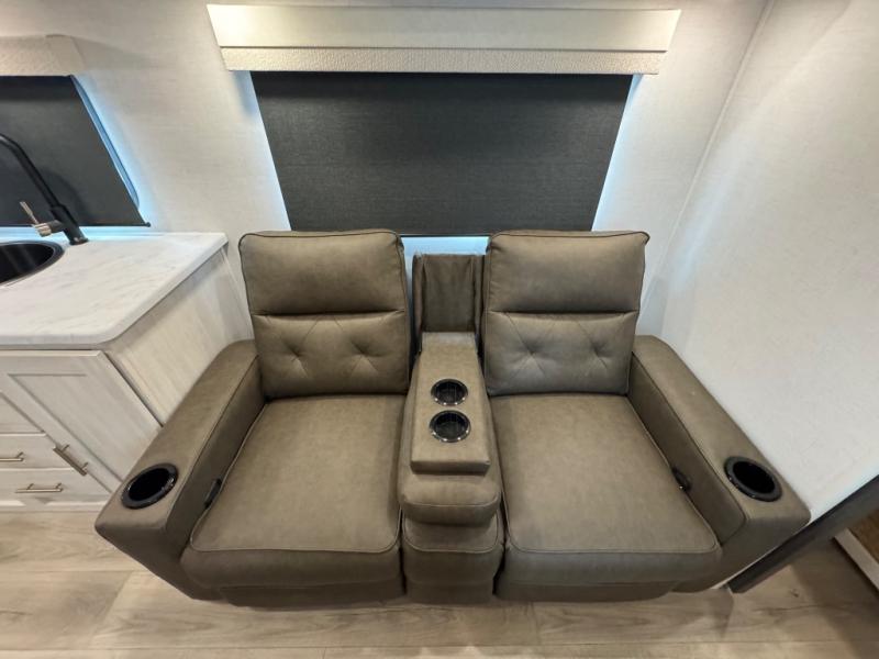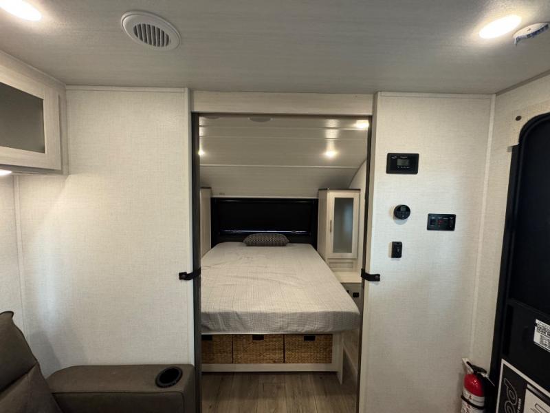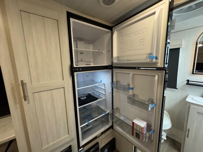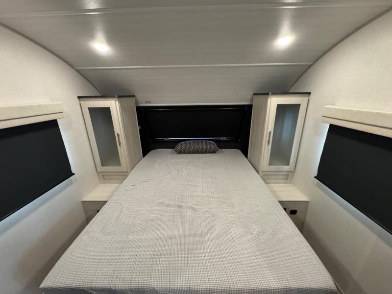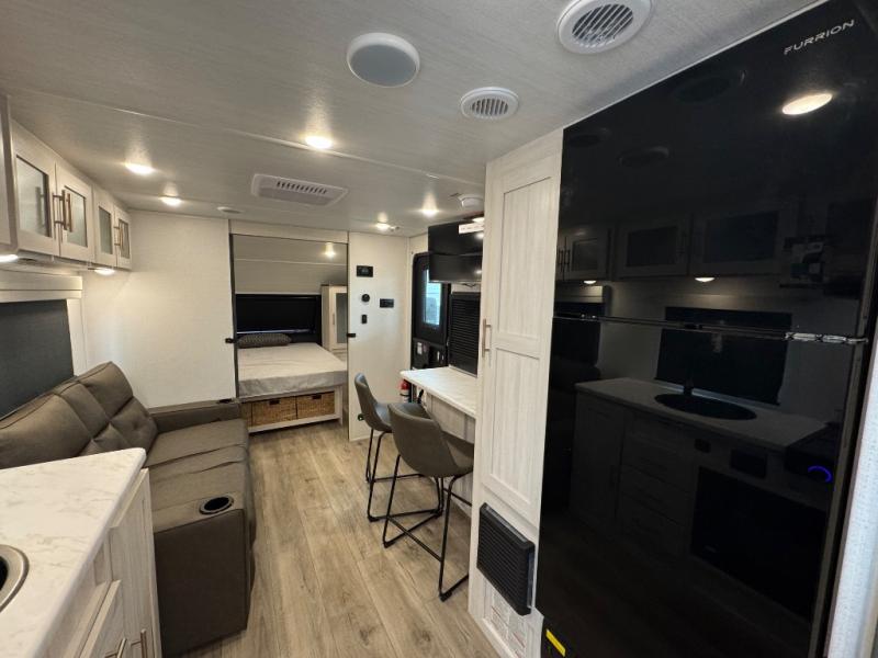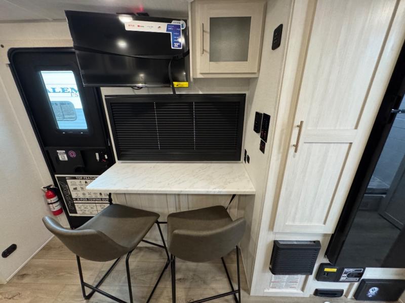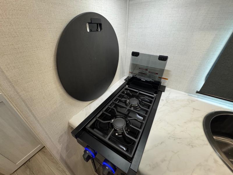 A front private bedroom with a walk-around queen bed, a full rear bath, and a theater seat are a few of the features that you are sure to want in your next RV! You can rest comfortably each night, plus all your clothing can be stored in the dual wardrobes to keep everything tidy. If you're needing more sleeping space, just choose the optional tri-fold sofa in place of the theater seat! The chef of your group can make meals on the two burner cooktop or in the air fryer/microwave, and there is a refrigerator for perishables. And the bar top with two seats and the flip-up window provide a great view outdoors as you dine together.