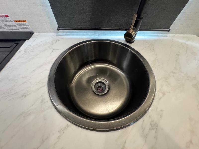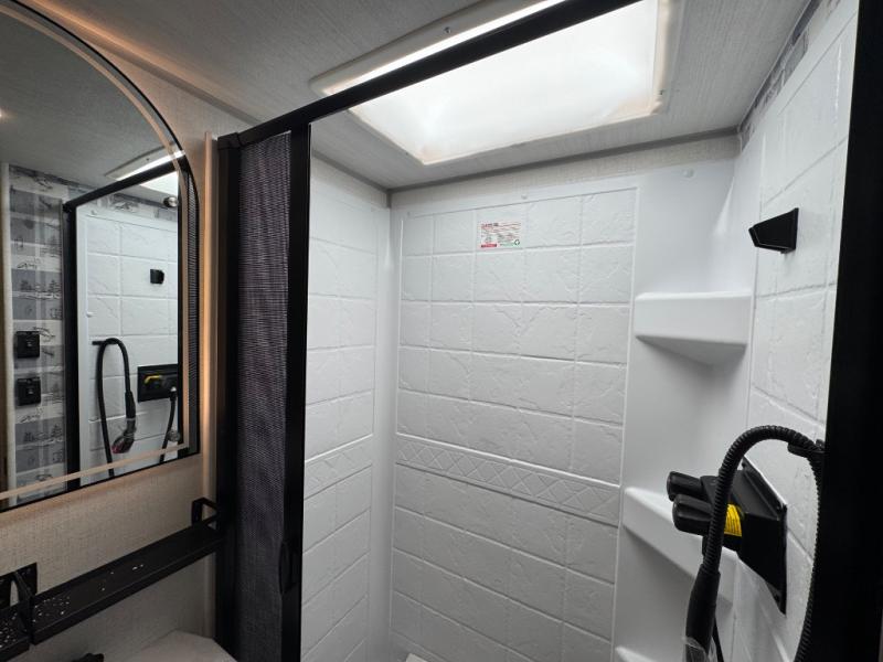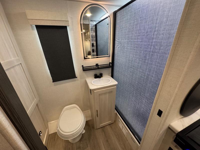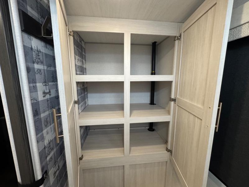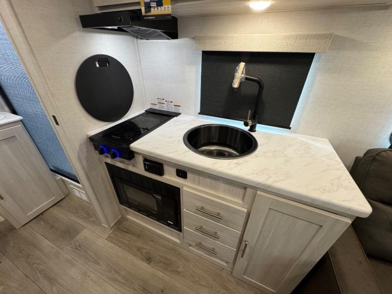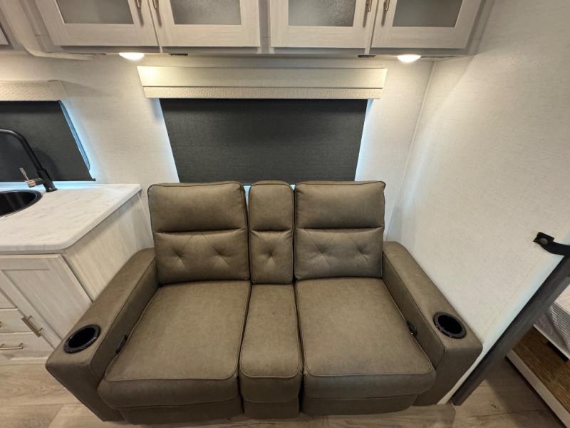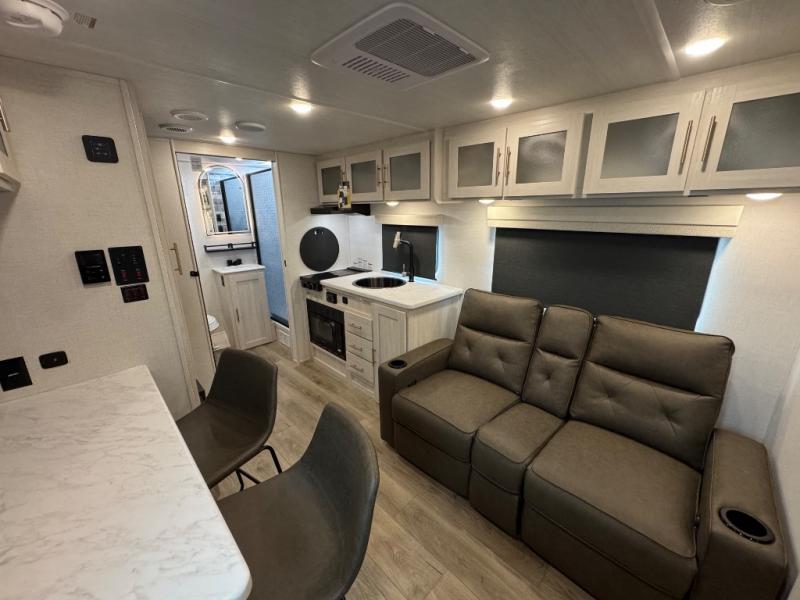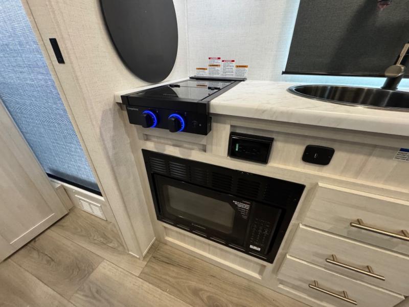 A front private bedroom with a walk-around queen bed, a full rear bath, and a theater seat are a few of the features that you are sure to want in your next RV! You can rest comfortably each night, plus all your clothing can be stored in the dual wardrobes to keep everything tidy. If you're needing more sleeping space, just choose the optional tri-fold sofa in place of the theater seat! The chef of your group can make meals on the two burner cooktop or in the air fryer/microwave, and there is a refrigerator for perishables. And the bar top with two seats and the flip-up window provide a great view outdoors as you dine together.
