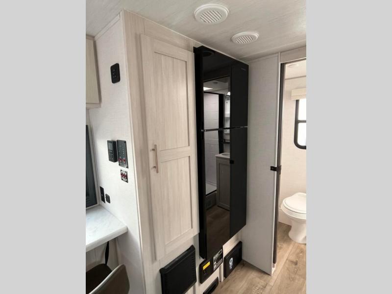 A front private bedroom with a walk-around queen bed, a full rear bath, and a theater seat are a few of the features that you are sure to want in your next RV! You can rest comfortably each night, plus all your clothing can be stored in the dual wardrobes to keep everything tidy. If you're needing more sleeping space, just choose the optional tri-fold sofa in place of the theater seat! The chef of your group can make meals on the two burner cooktop or in the air fryer/microwave, and there is a refrigerator for perishables. And the bar top with two seats and the flip-up window provide a great view outdoors as you dine together.