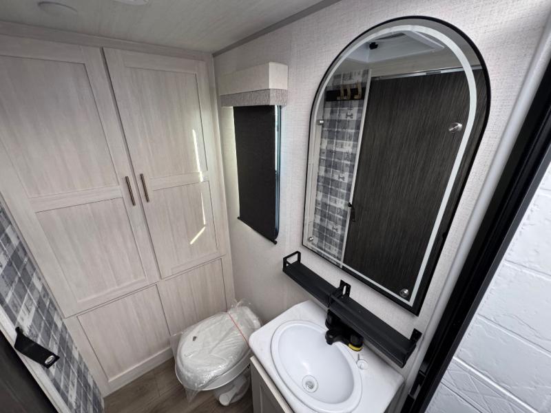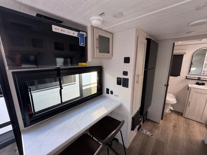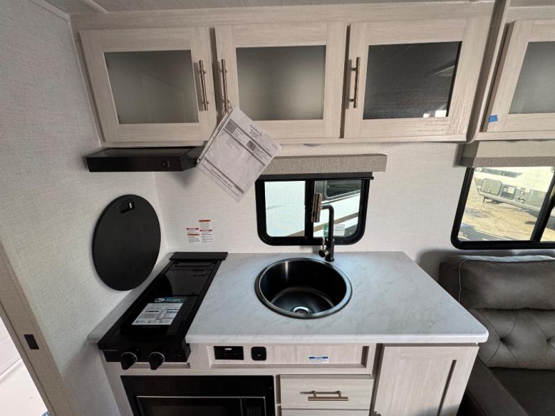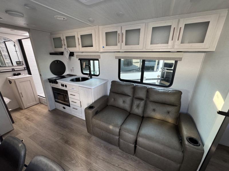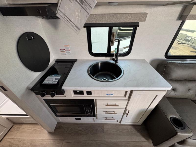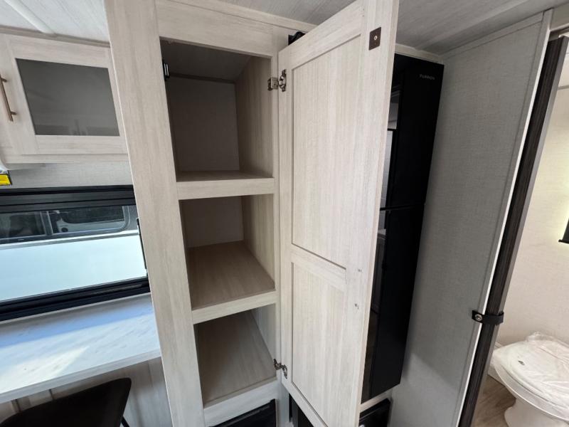 A front private bedroom with a walk-around queen bed, a full rear bath, and a theater seat are a few of the features that you are sure to want in your next RV! You can rest comfortably each night, plus all your clothing can be stored in the dual wardrobes to keep everything tidy. If you're needing more sleeping space, just choose the optional tri-fold sofa in place of the theater seat! The chef of your group can make meals on the two burner cooktop or in the air fryer/microwave, and there is a refrigerator for perishables. And the bar top with two seats and the flip-up window provide a great view outdoors as you dine together.