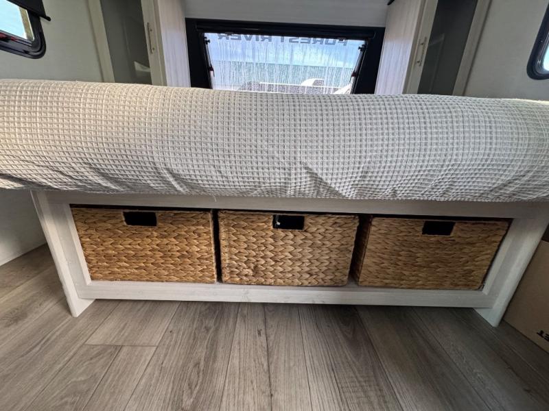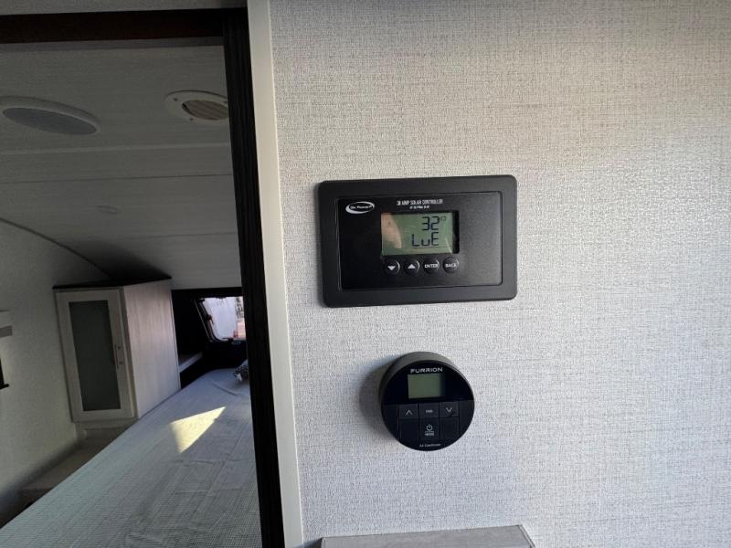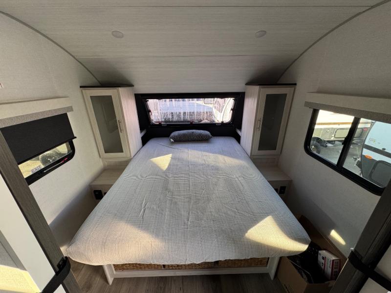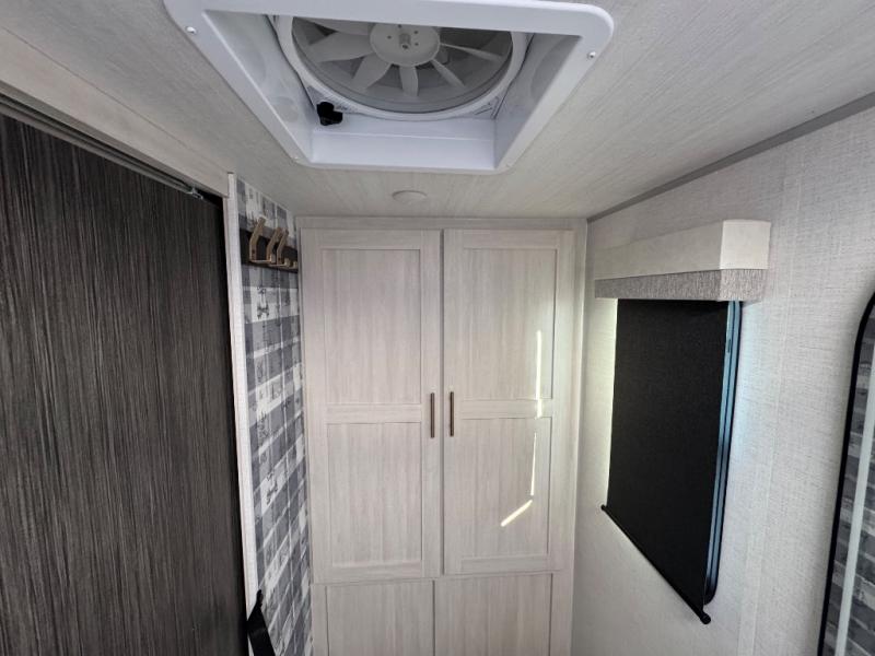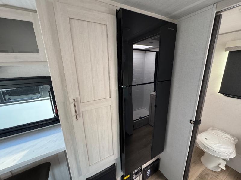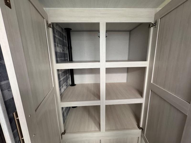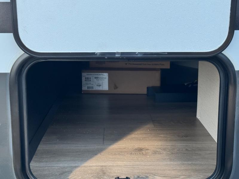 A front private bedroom with a walk-around queen bed, a full rear bath, and a theater seat are a few of the features that you are sure to want in your next RV! You can rest comfortably each night, plus all your clothing can be stored in the dual wardrobes to keep everything tidy. If you're needing more sleeping space, just choose the optional tri-fold sofa in place of the theater seat! The chef of your group can make meals on the two burner cooktop or in the air fryer/microwave, and there is a refrigerator for perishables. And the bar top with two seats and the flip-up window provide a great view outdoors as you dine together.