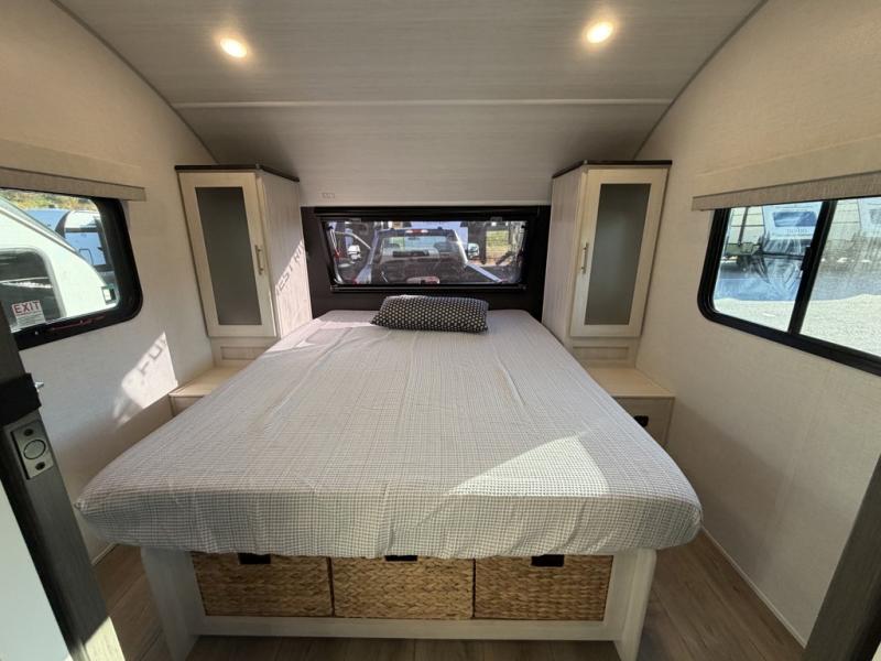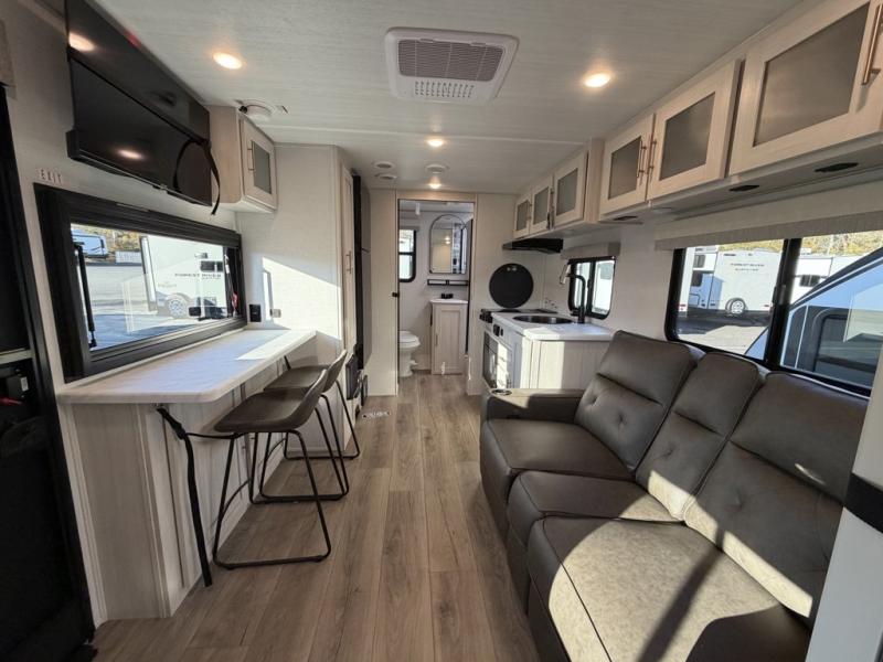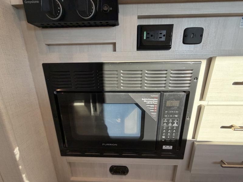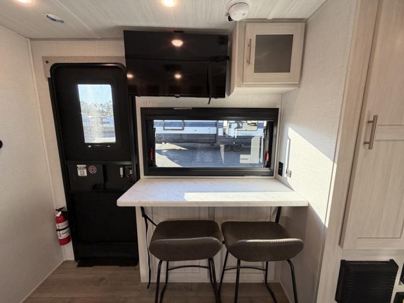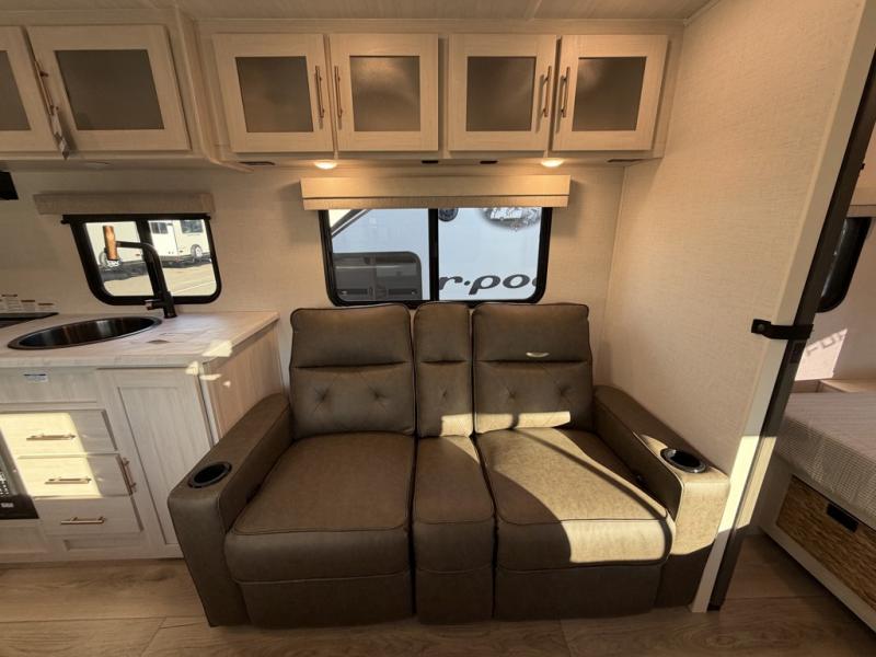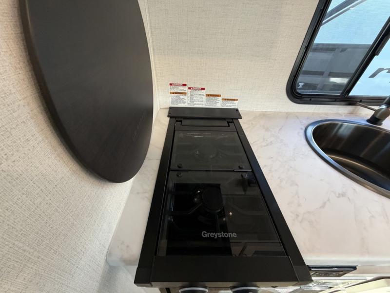 A front private bedroom with a walk-around queen bed, a full rear bath, and a theater seat are a few of the features that you are sure to want in your next RV! You can rest comfortably each night, plus all your clothing can be stored in the dual wardrobes to keep everything tidy. If you're needing more sleeping space, just choose the optional tri-fold sofa in place of the theater seat! The chef of your group can make meals on the two burner cooktop or in the air fryer/microwave, and there is a refrigerator for perishables. And the bar top with two seats and the flip-up window provide a great view outdoors as you dine together.
