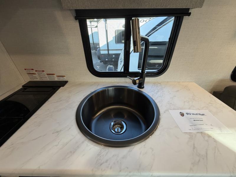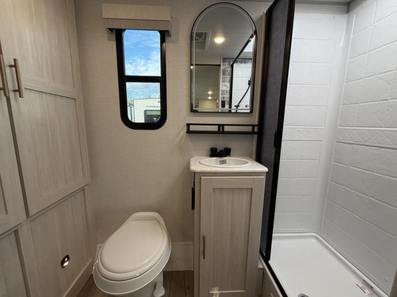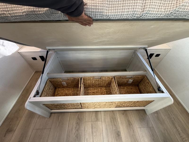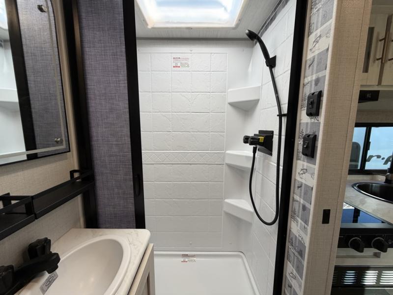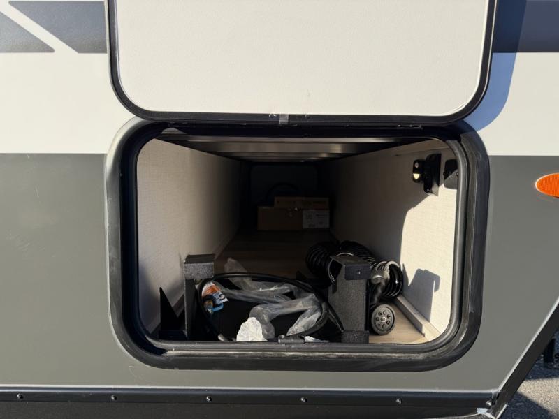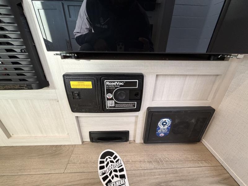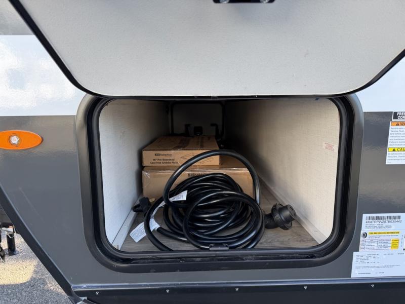 A front private bedroom with a walk-around queen bed, a full rear bath, and a theater seat are a few of the features that you are sure to want in your next RV! You can rest comfortably each night, plus all your clothing can be stored in the dual wardrobes to keep everything tidy. If you're needing more sleeping space, just choose the optional tri-fold sofa in place of the theater seat! The chef of your group can make meals on the two burner cooktop or in the air fryer/microwave, and there is a refrigerator for perishables. And the bar top with two seats and the flip-up window provide a great view outdoors as you dine together.