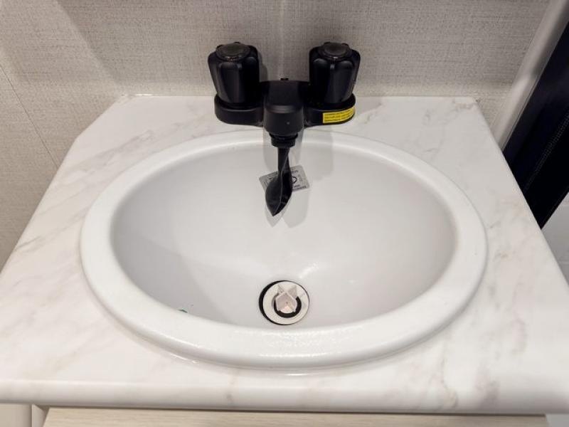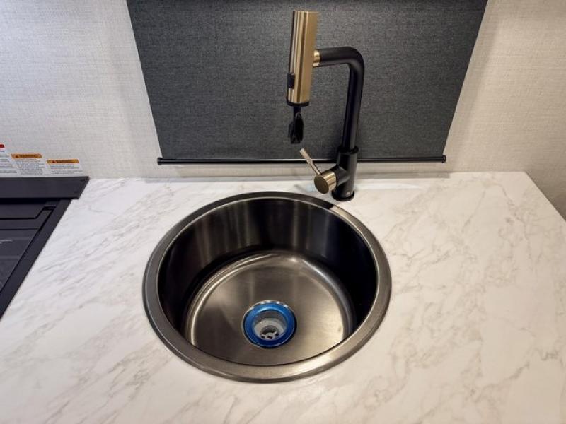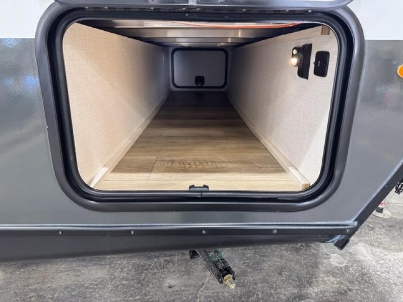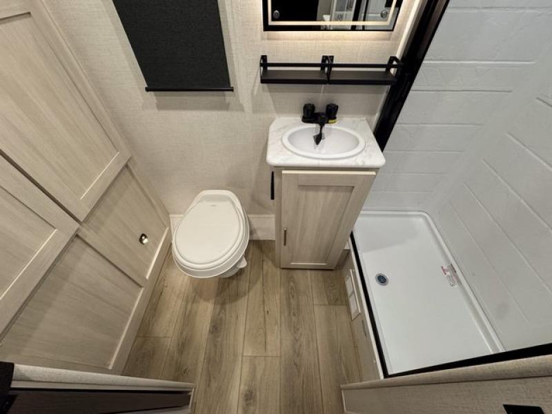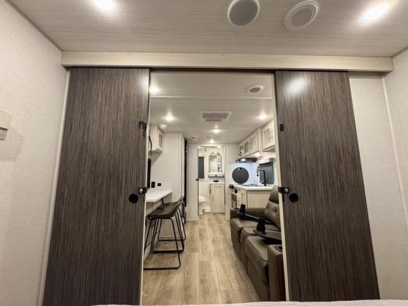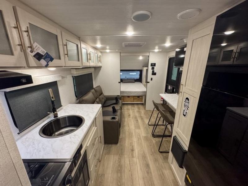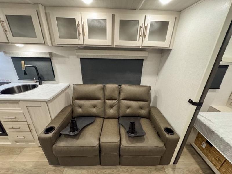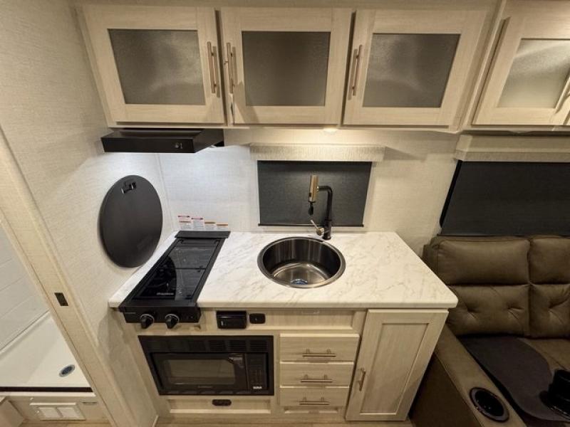 A front private bedroom with a walk-around queen bed, a full rear bath, and a theater seat are a few of the features that you are sure to want in your next RV! You can rest comfortably each night, plus all your clothing can be stored in the dual wardrobes to keep everything tidy. If you're needing more sleeping space, just choose the optional tri-fold sofa in place of the theater seat! The chef of your group can make meals on the two burner cooktop or in the air fryer/microwave, and there is a refrigerator for perishables. And the bar top with two seats and the flip-up window provide a great view outdoors as you dine together.