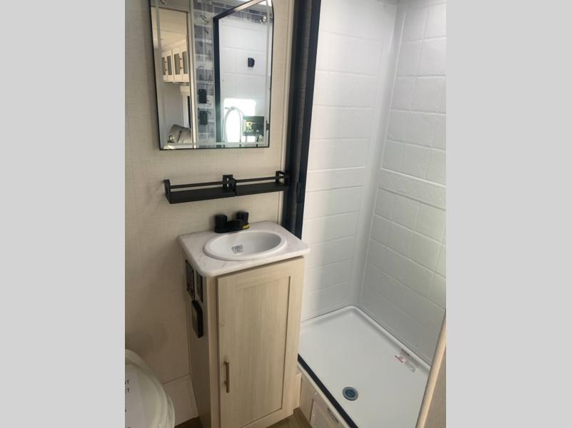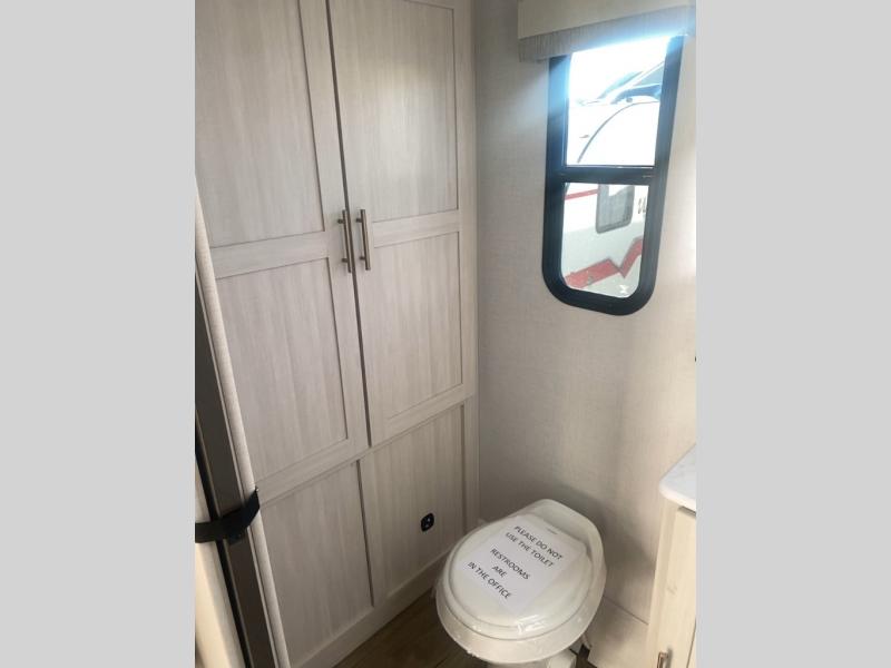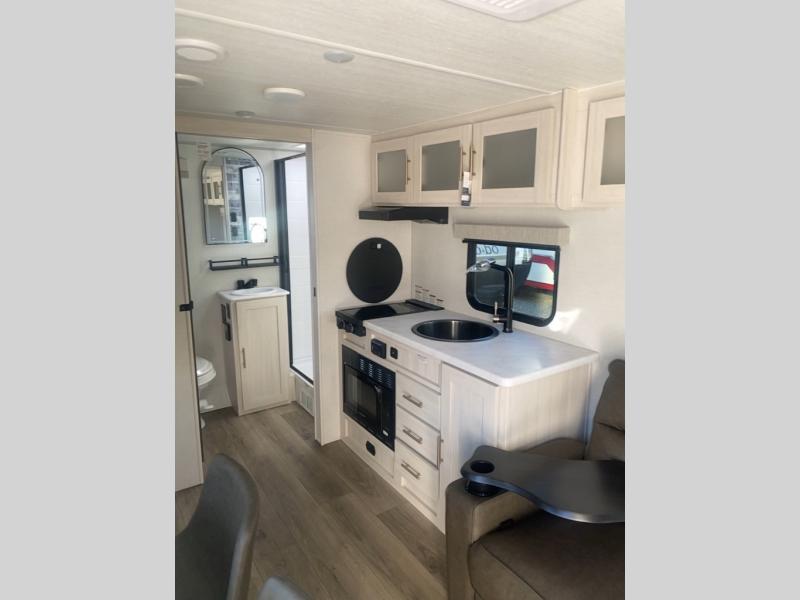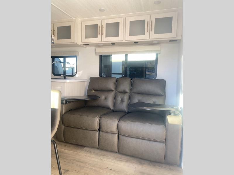 A front private bedroom with a walk-around queen bed, a full rear bath, and a theater seat are a few of the features that you are sure to want in your next RV! You can rest comfortably each night, plus all your clothing can be stored in the dual wardrobes to keep everything tidy. If you're needing more sleeping space, just choose the optional tri-fold sofa in place of the theater seat! The chef of your group can make meals on the two burner cooktop or in the air fryer/microwave, and there is a refrigerator for perishables. And the bar top with two seats and the flip-up window provide a great view outdoors as you dine together.