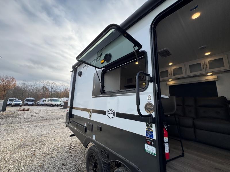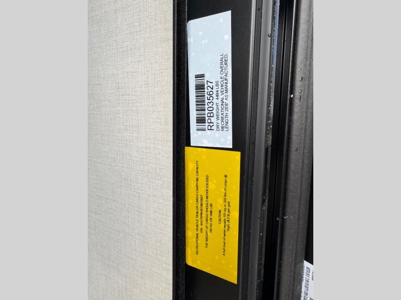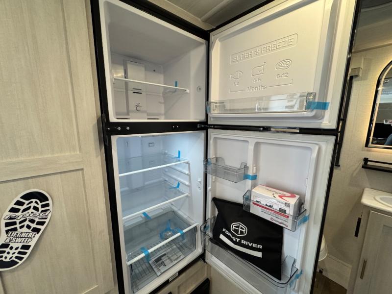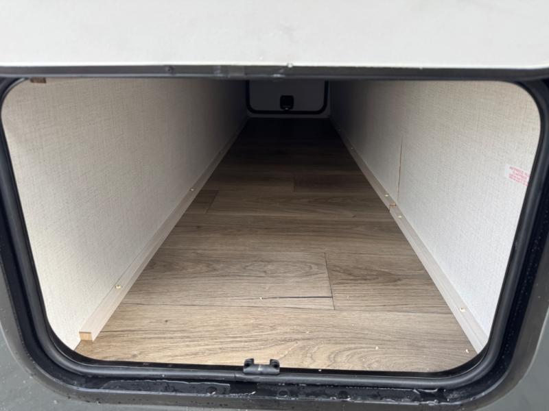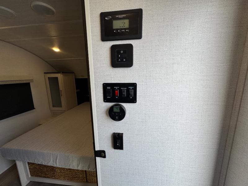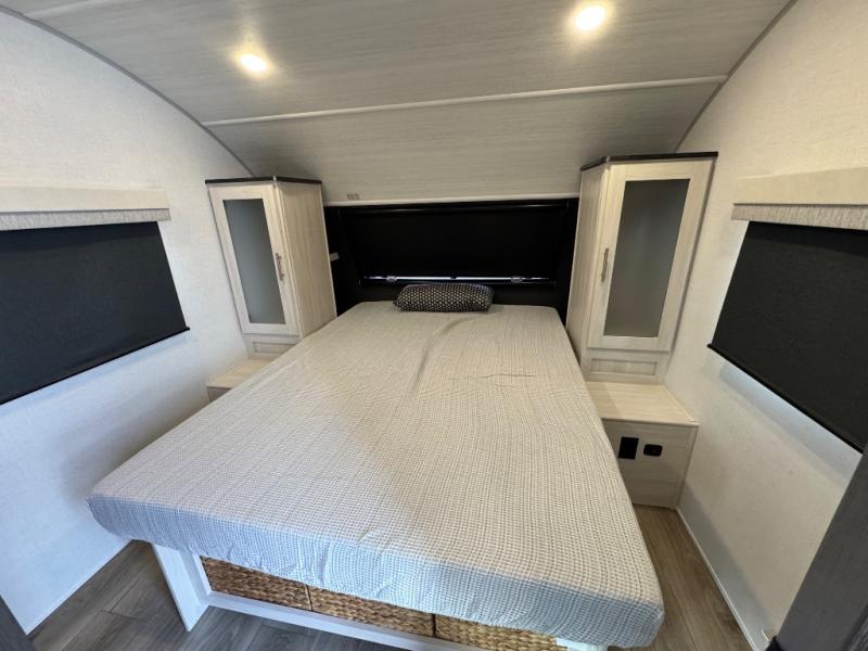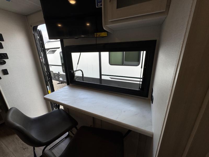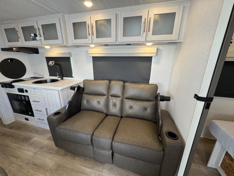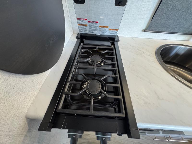 A front private bedroom with a walk-around queen bed, a full rear bath, and a theater seat are a few of the features that you are sure to want in your next RV! You can rest comfortably each night, plus all your clothing can be stored in the dual wardrobes to keep everything tidy. If you're needing more sleeping space, just choose the optional tri-fold sofa in place of the theater seat! The chef of your group can make meals on the two burner cooktop or in the air fryer/microwave, and there is a refrigerator for perishables. And the bar top with two seats and the flip-up window provide a great view outdoors as you dine together.