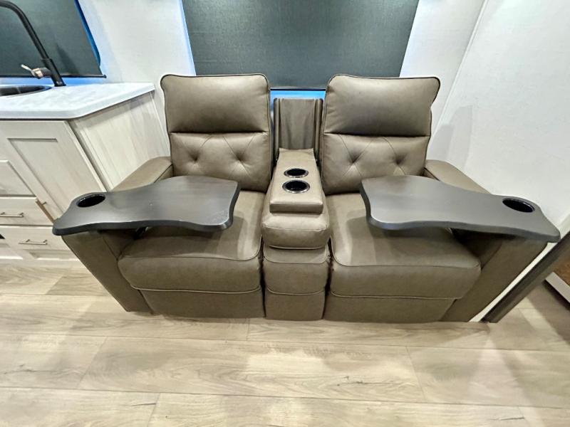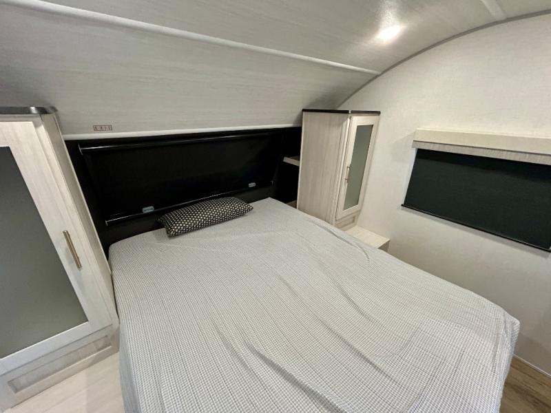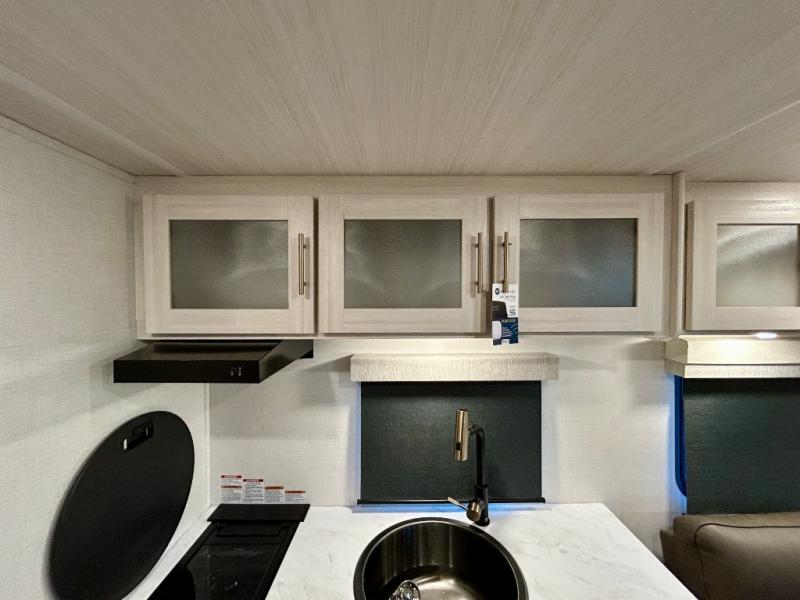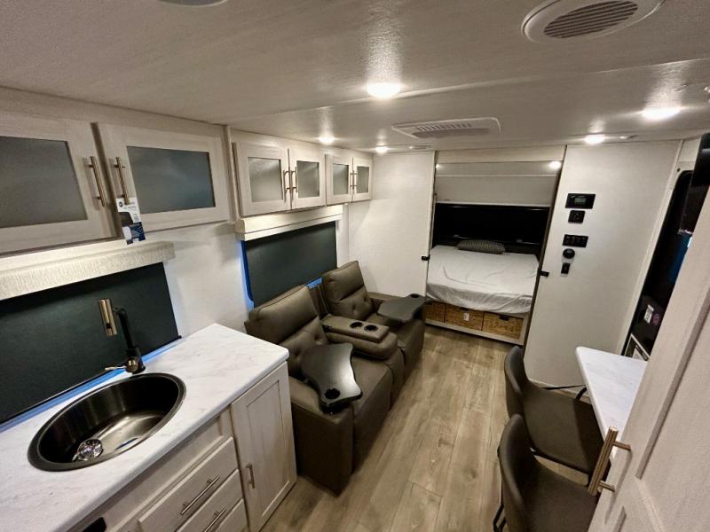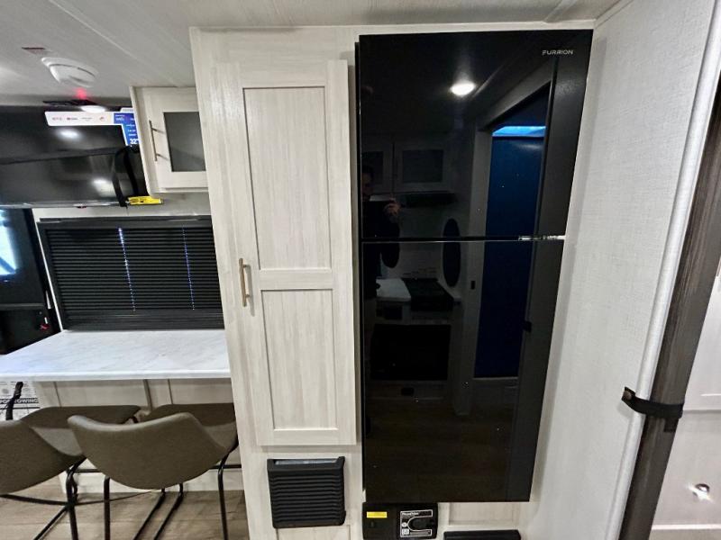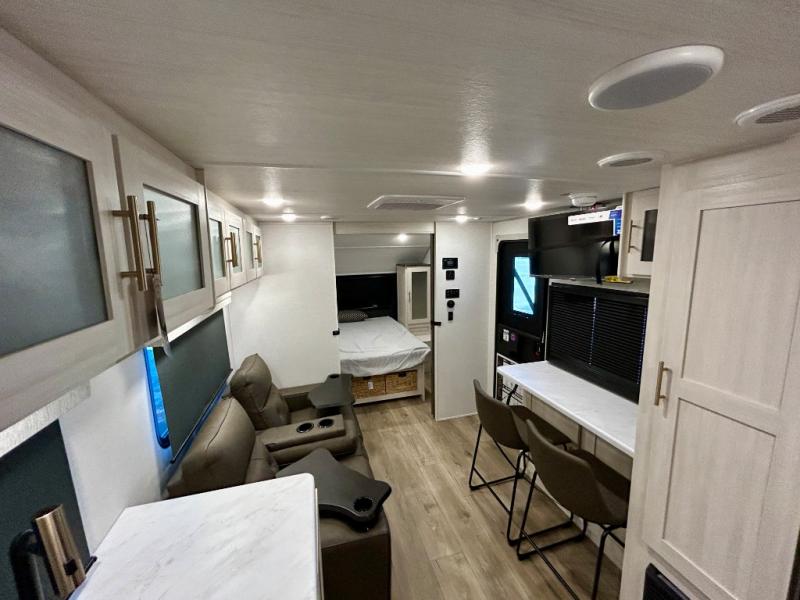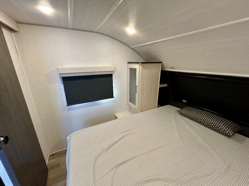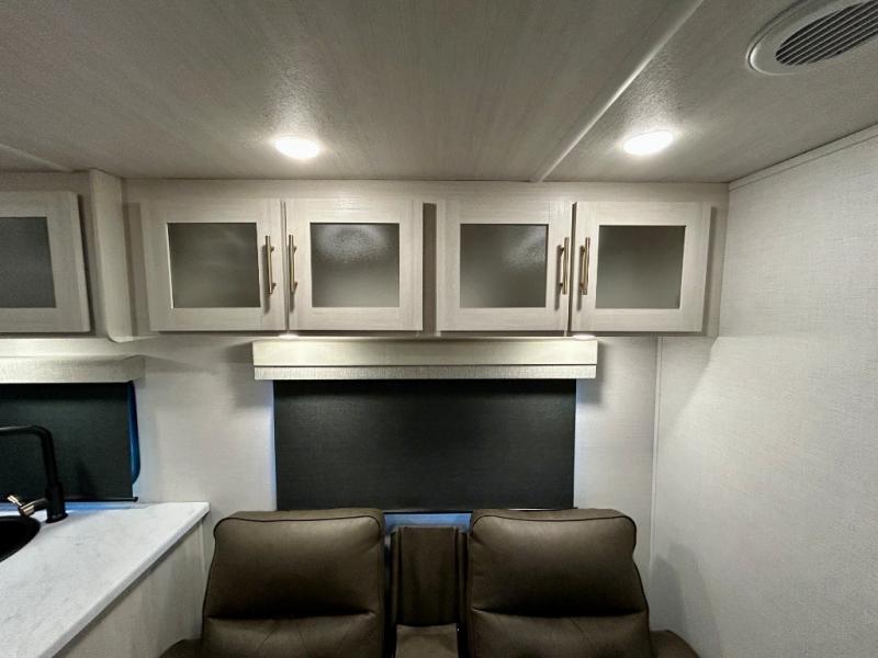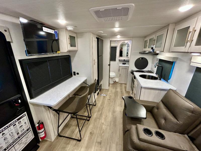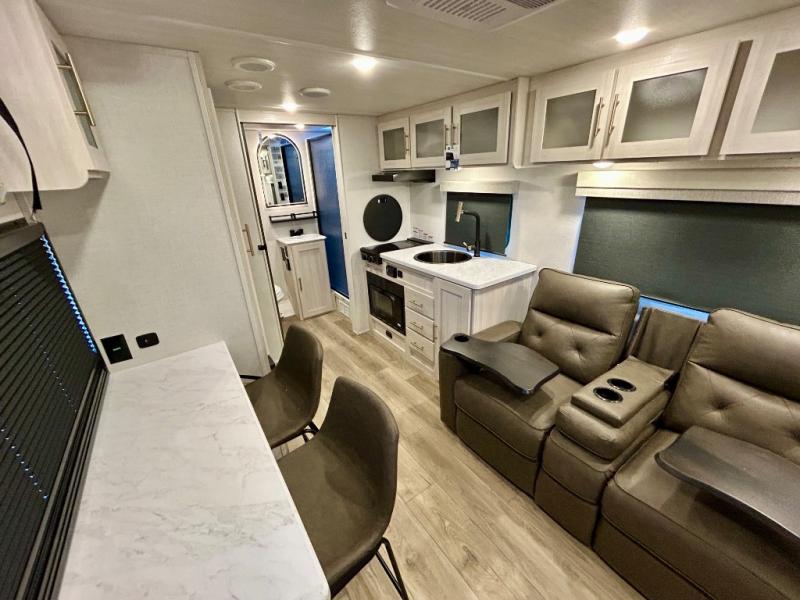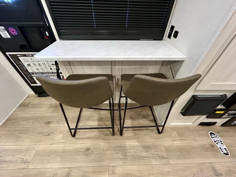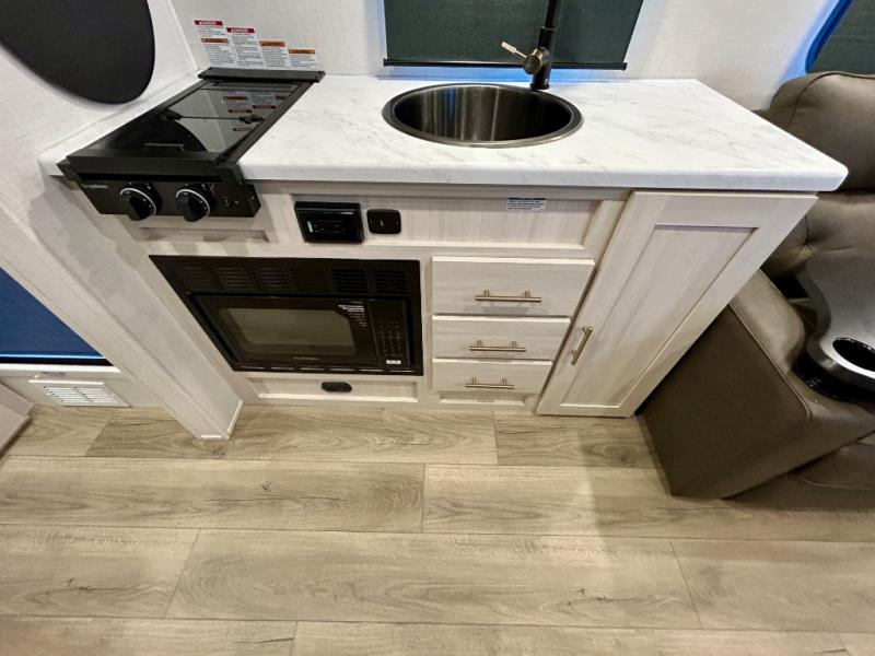 A front private bedroom with a walk-around queen bed, a full rear bath, and a theater seat are a few of the features that you are sure to want in your next RV! You can rest comfortably each night, plus all your clothing can be stored in the dual wardrobes to keep everything tidy. If you're needing more sleeping space, just choose the optional tri-fold sofa in place of the theater seat! The chef of your group can make meals on the two burner cooktop or in the air fryer/microwave, and there is a refrigerator for perishables. And the bar top with two seats and the flip-up window provide a great view outdoors as you dine together.
