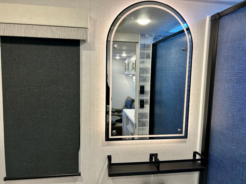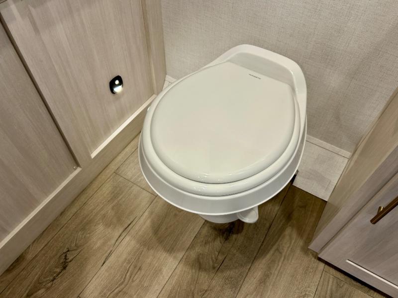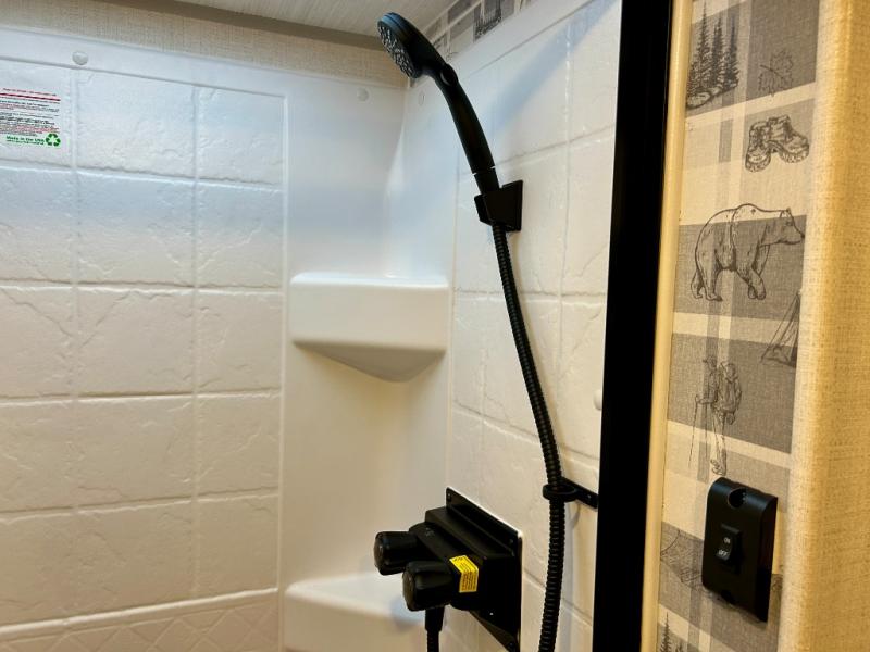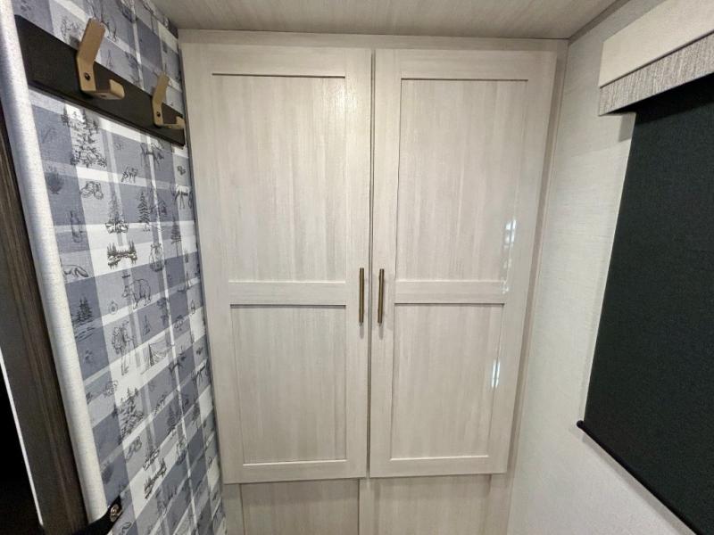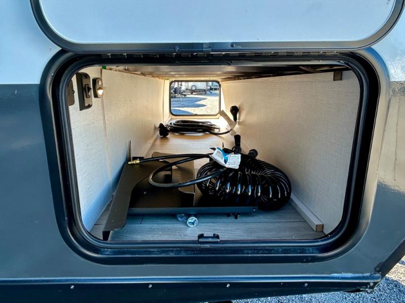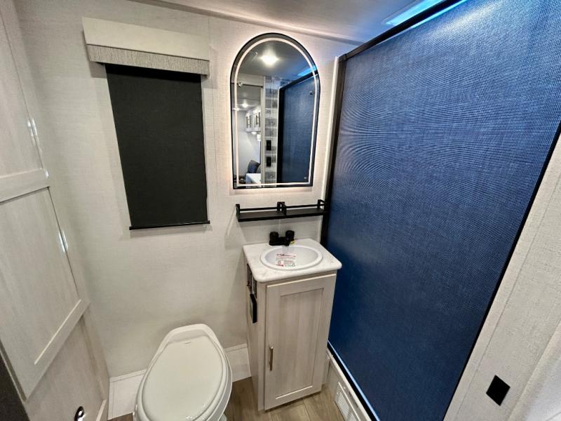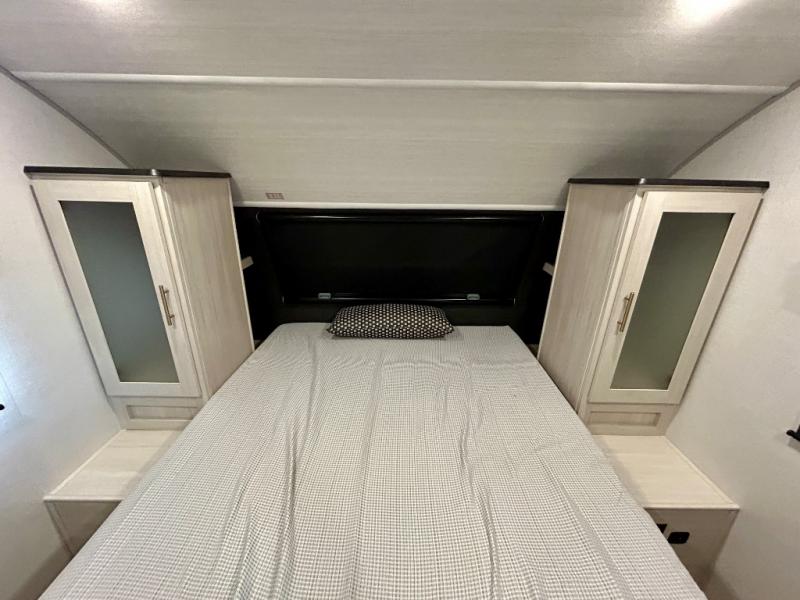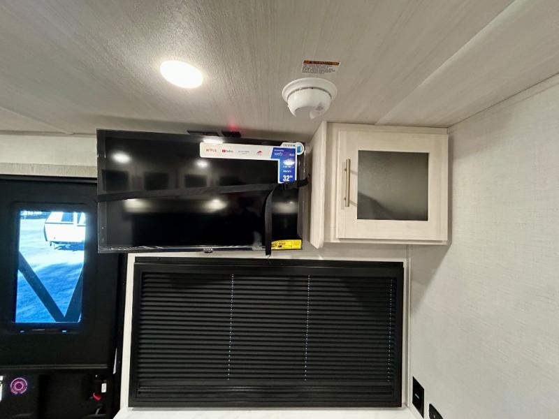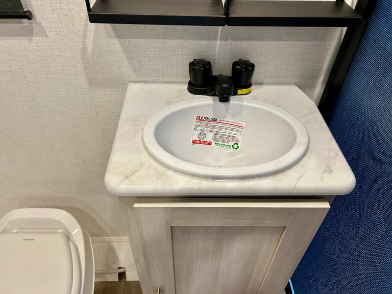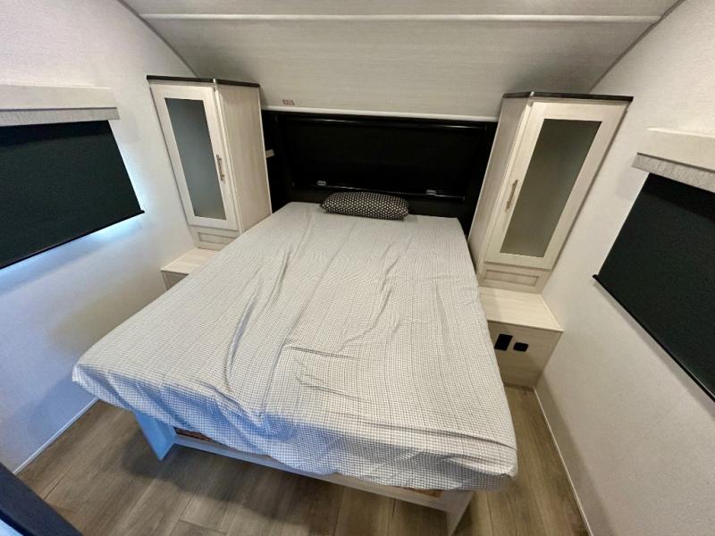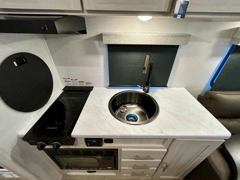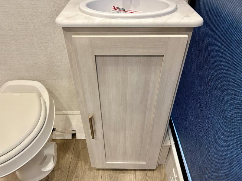 A front private bedroom with a walk-around queen bed, a full rear bath, and a theater seat are a few of the features that you are sure to want in your next RV! You can rest comfortably each night, plus all your clothing can be stored in the dual wardrobes to keep everything tidy. If you're needing more sleeping space, just choose the optional tri-fold sofa in place of the theater seat! The chef of your group can make meals on the two burner cooktop or in the air fryer/microwave, and there is a refrigerator for perishables. And the bar top with two seats and the flip-up window provide a great view outdoors as you dine together.