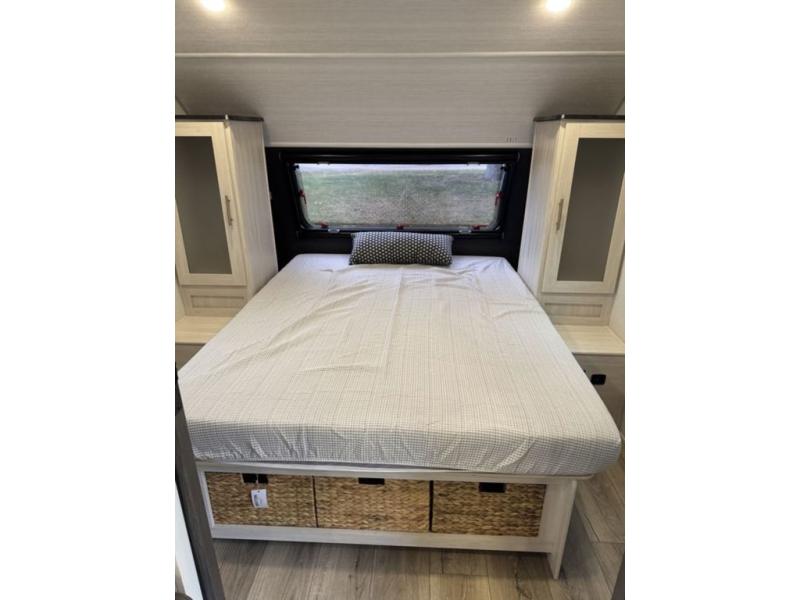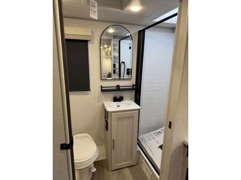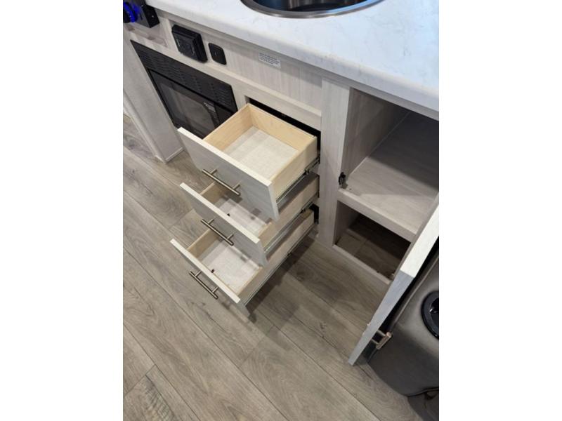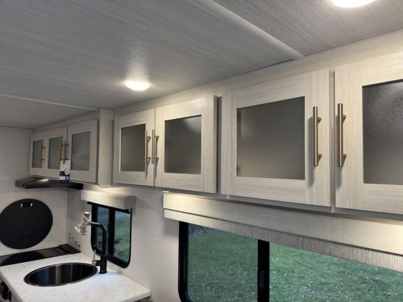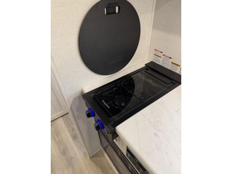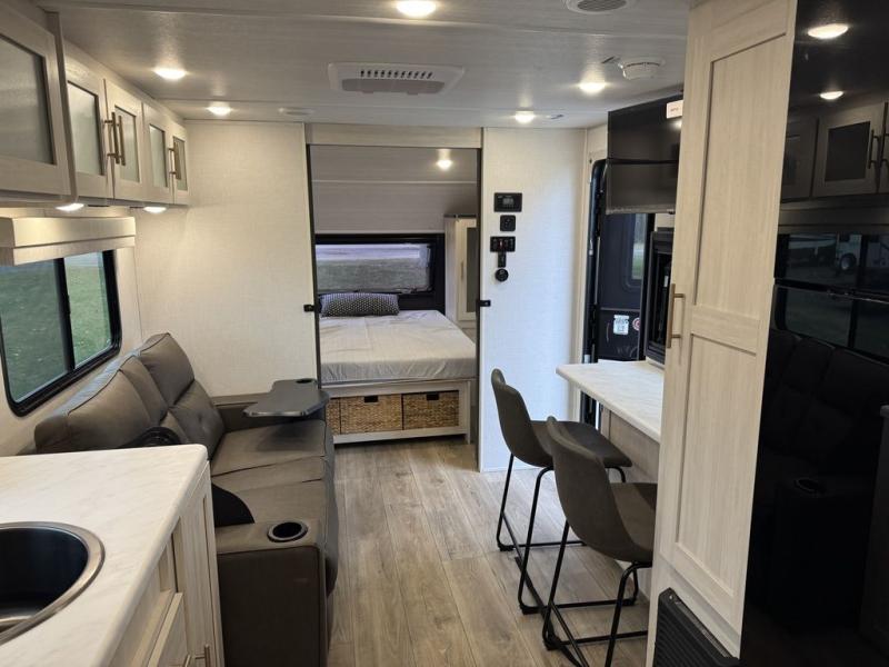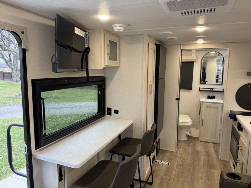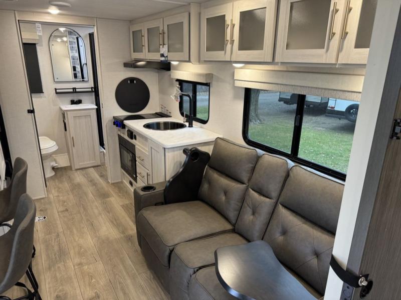 A front private bedroom with a walk-around queen bed, a full rear bath, and a theater seat are a few of the features that you are sure to want in your next RV! You can rest comfortably each night, plus all your clothing can be stored in the dual wardrobes to keep everything tidy. If you're needing more sleeping space, just choose the optional tri-fold sofa in place of the theater seat! The chef of your group can make meals on the two burner cooktop or in the air fryer/microwave, and there is a refrigerator for perishables. And the bar top with two seats and the flip-up window provide a great view outdoors as you dine together.