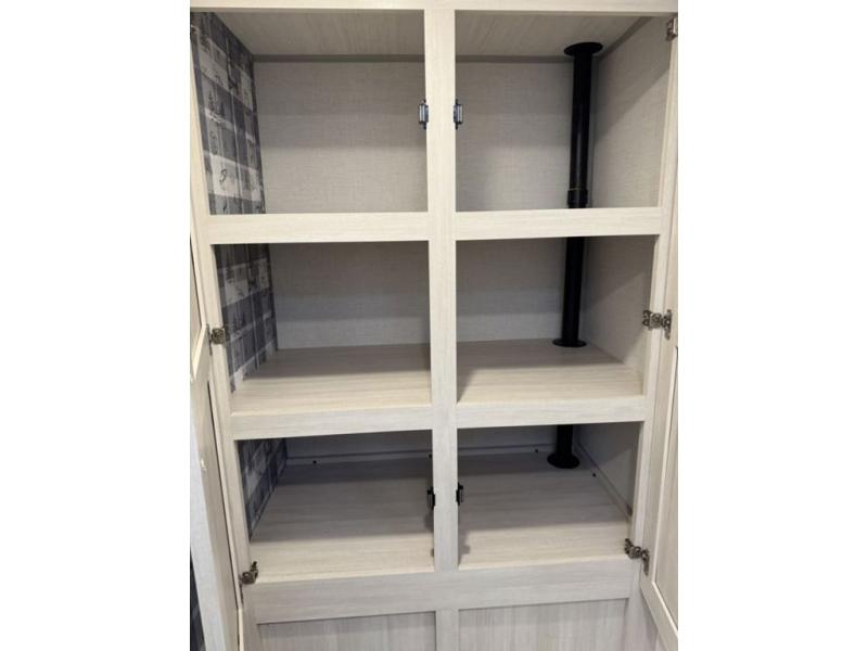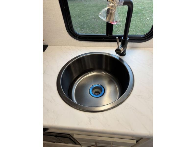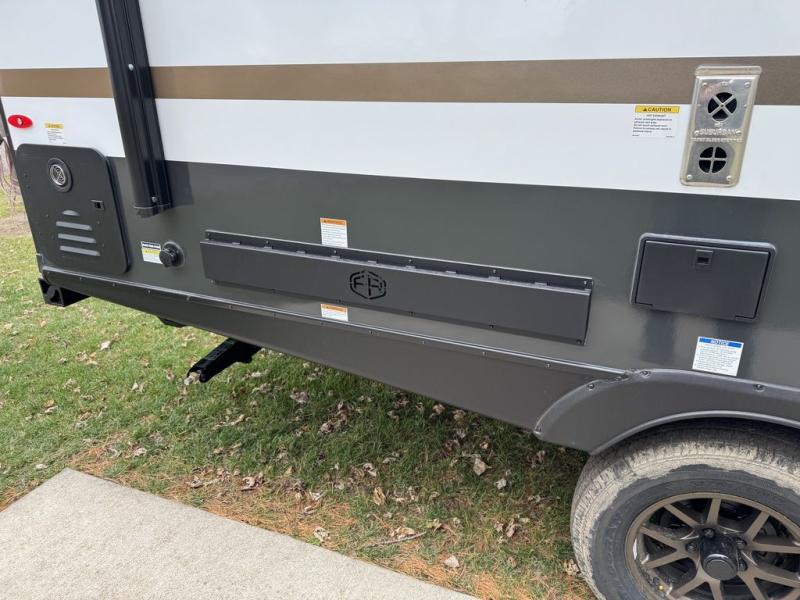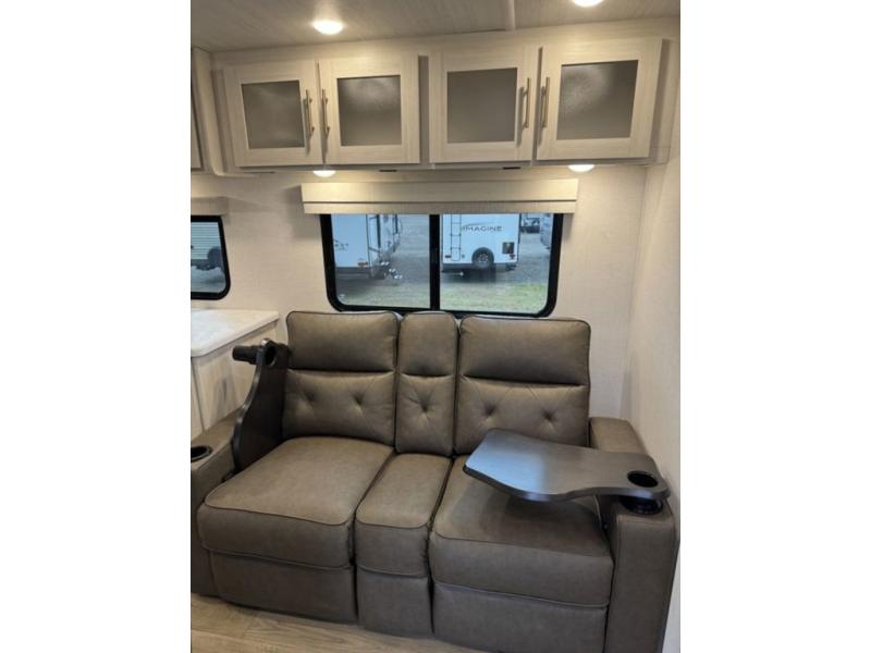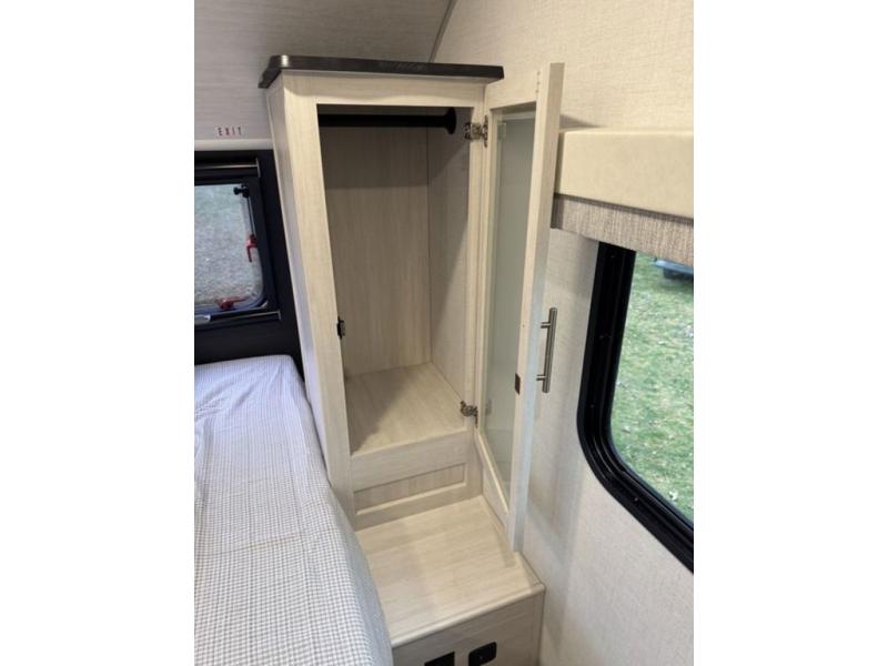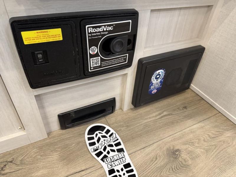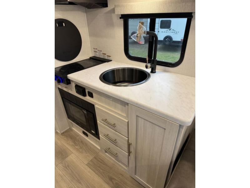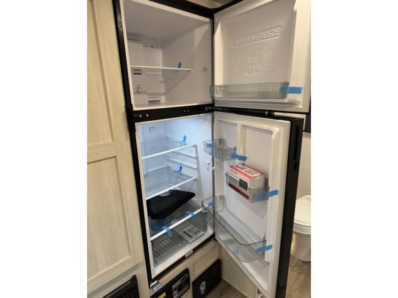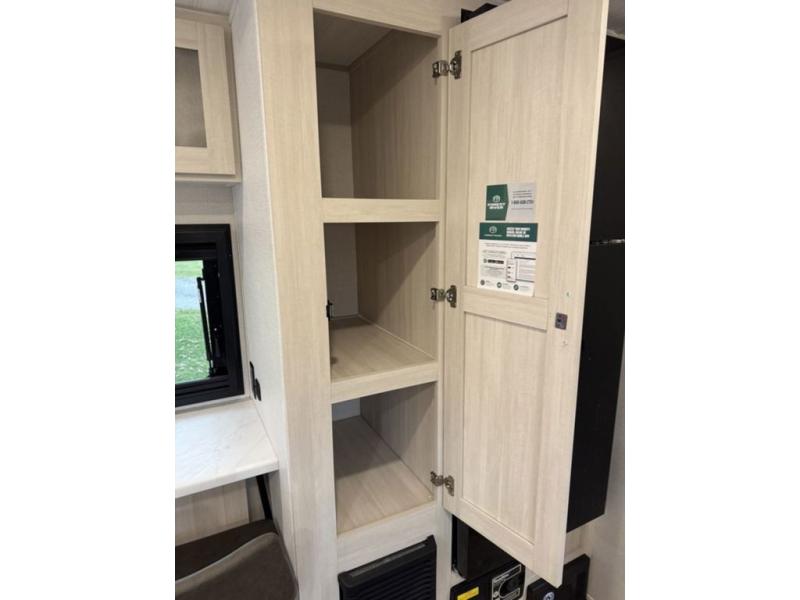 A front private bedroom with a walk-around queen bed, a full rear bath, and a theater seat are a few of the features that you are sure to want in your next RV! You can rest comfortably each night, plus all your clothing can be stored in the dual wardrobes to keep everything tidy. If you're needing more sleeping space, just choose the optional tri-fold sofa in place of the theater seat! The chef of your group can make meals on the two burner cooktop or in the air fryer/microwave, and there is a refrigerator for perishables. And the bar top with two seats and the flip-up window provide a great view outdoors as you dine together.