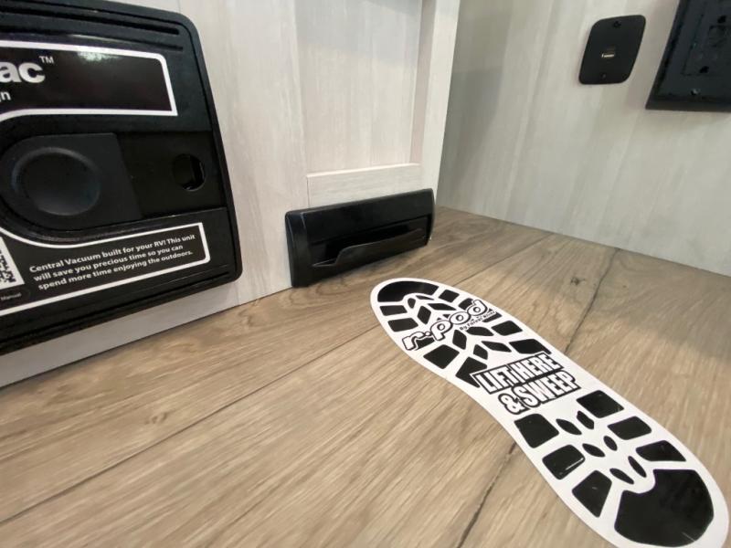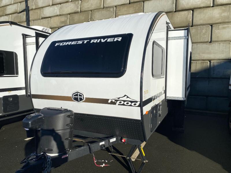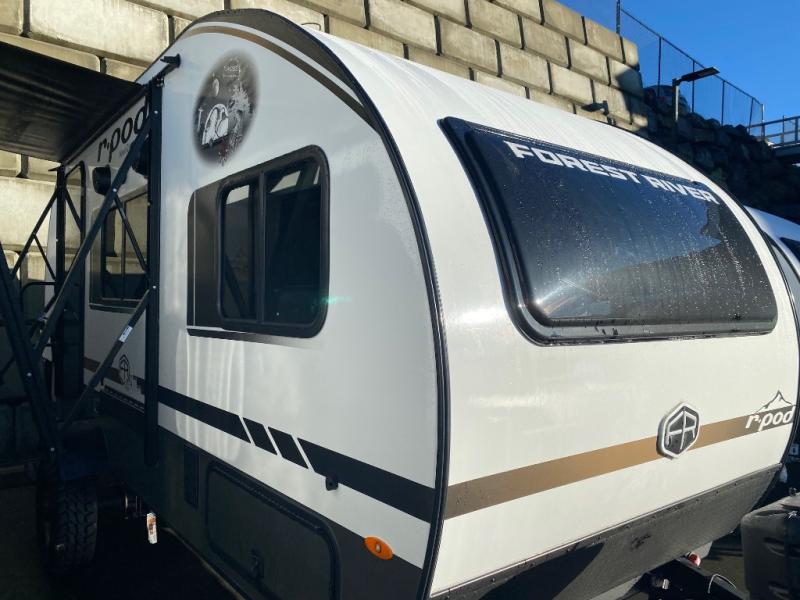 With any R-Pod travel trailer by Forest River, you will enjoy affordable luxury at the lowest tow weight in its class! There is a sealed underbelly with forced heat, a curved dual-pane acrylic front window with a bug screen and night shade, plus a large roof mounted solar panel for off-grid capabilities. The 15K A/C unit will keep you comfortable during the summer camping months, and the tankless water heater will provide endless hot showers after hiking, biking, swimming and more! Each model also includes a black glass friction hinge entrance door, roof ladder prep, exterior motion lighting, plus a hot and cold exterior spray port to wash off sand from the beach. Inside, you'll enjoy seamless Surf-X kitchen countertops, blackout roller shades, and a central vacuum system for hassle-free cleaning!