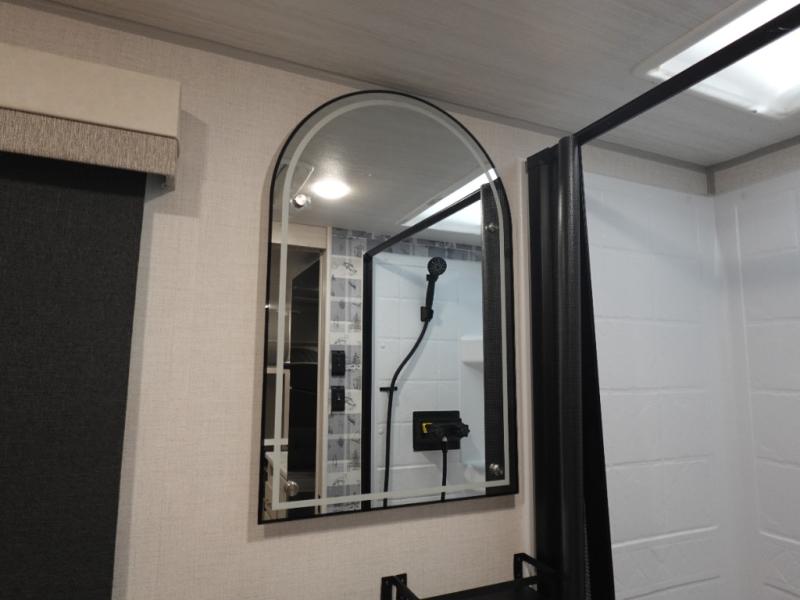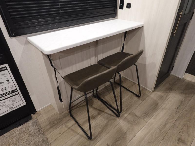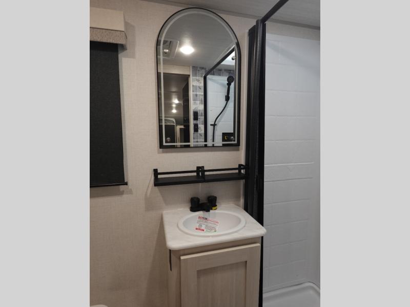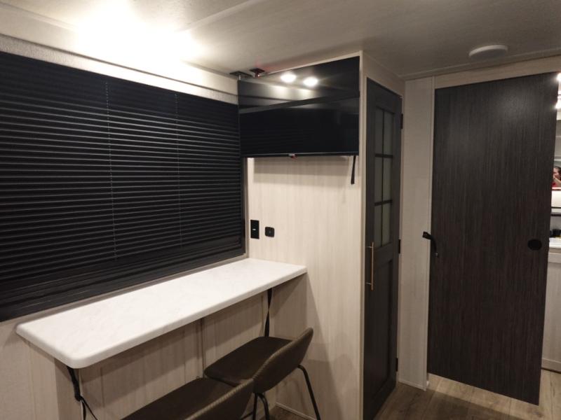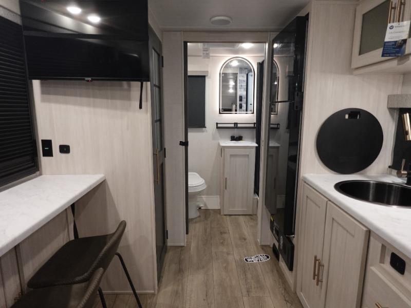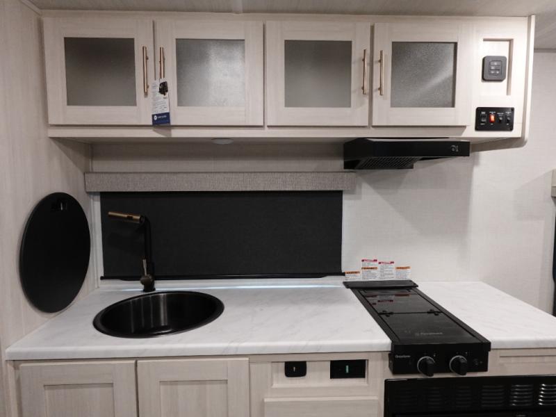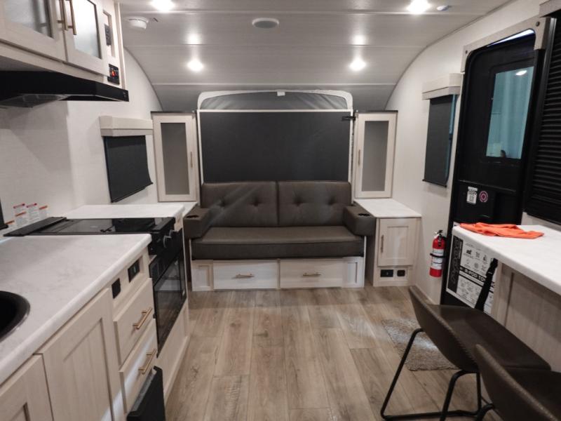 This versatile travel trailer is perfect for two adventure-seeking campers! You will love having a queen-size Murphy bed up front since you can fold it away during the day and relax on the sofa. There are also dual wardrobes to keep your clothes out of the way plus dual end end tables to set your coffee or book on. A full kitchen includes a convection microwave, 12V black glass refrigerator, and a counter with two chairs where you can dine each day. You will also love the flip-up window above the table, along with a 12V TV to keep you entertained, plus a pantry to keep food stocked. Head to the full rear bath that includes a large linen closet, a shower, and a night light for added convenience. The exterior is just as accommodating with its large roof mounted solar panel, rear accessory hitch, slam latch cargo doors, and more!